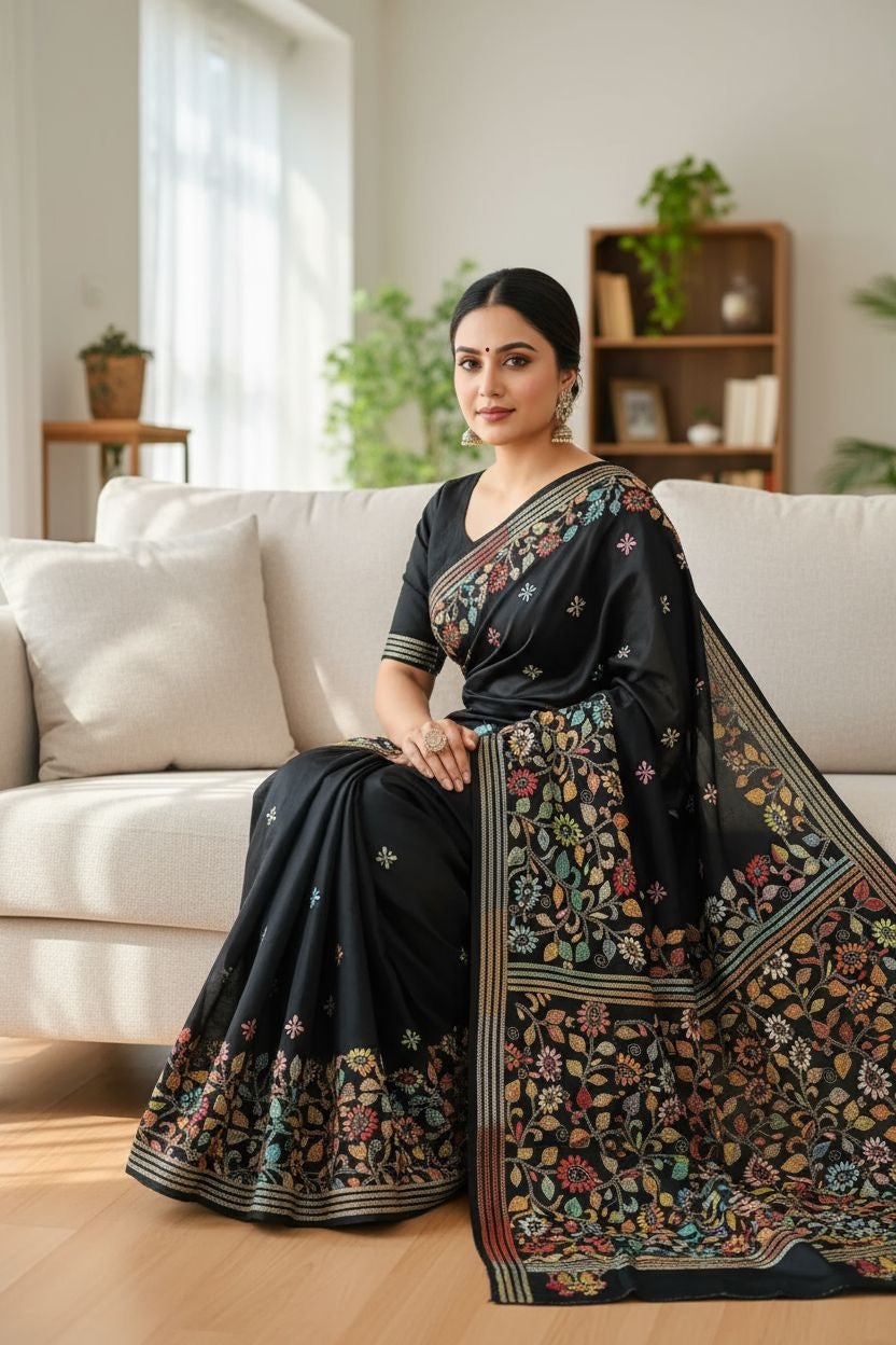 Exquisitely handcrafted Blended Bangalore Silk Saree with all-over Kantha Stitch embroidery. Rich in texture and elegance, this masterpiece blends traditional artistry with a modern, comfortable drape — perfect for special occasions.