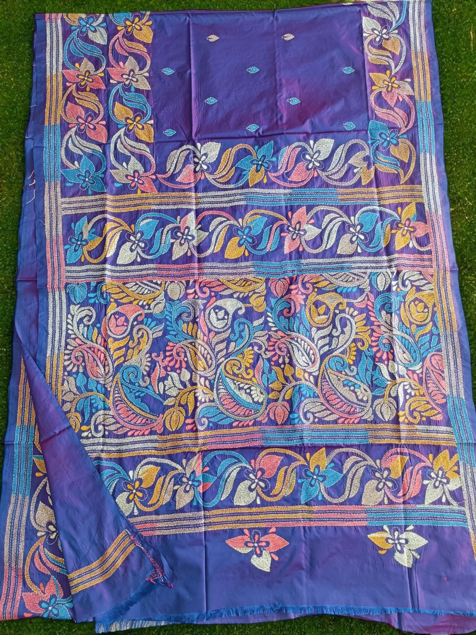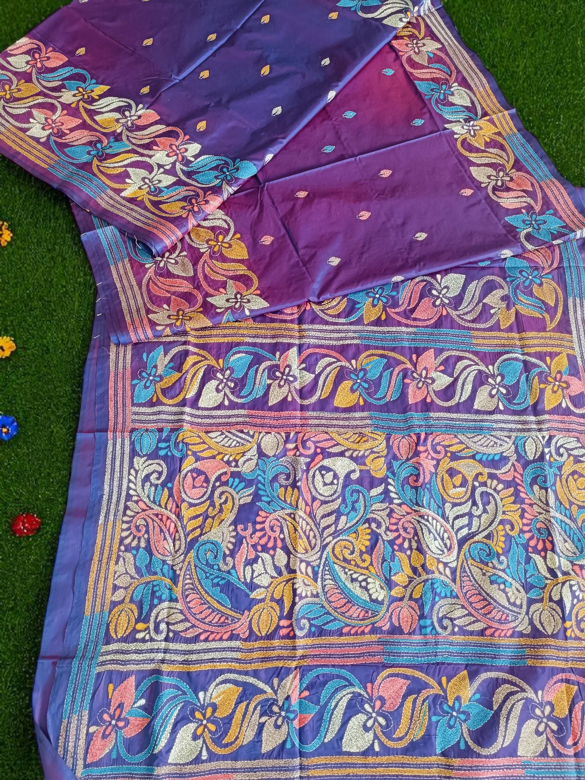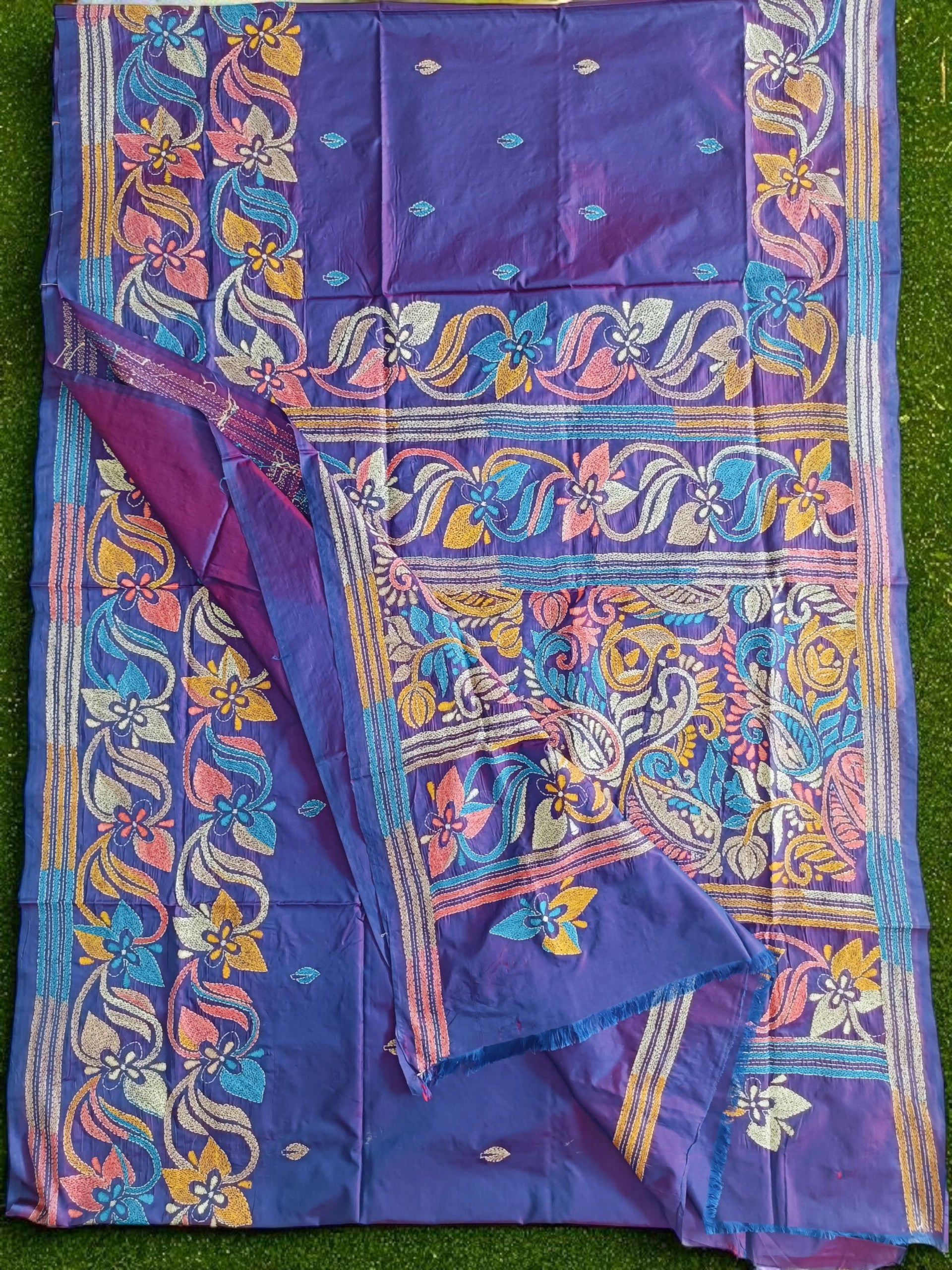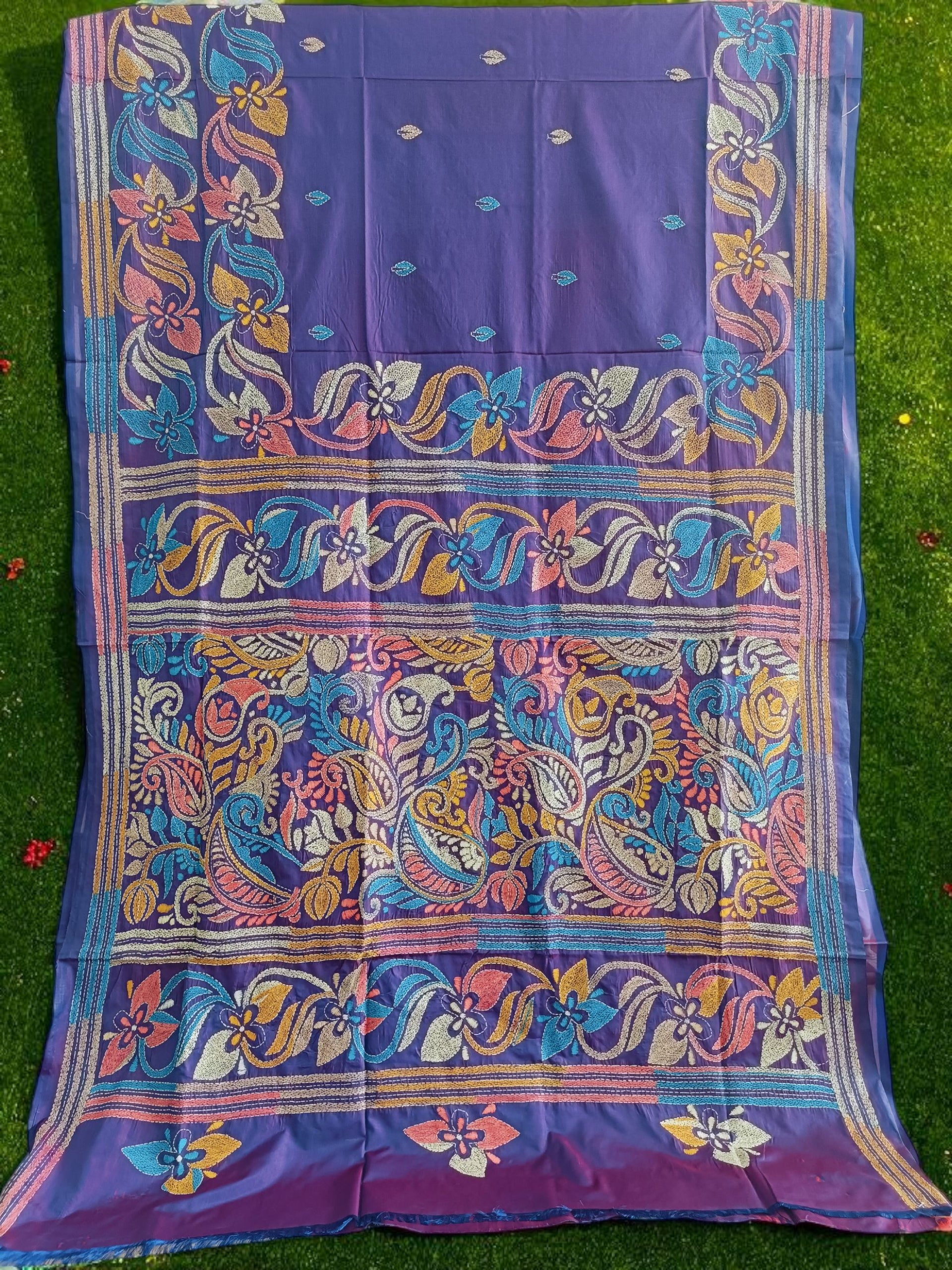 Exquisitely handcrafted Blended Bangalore Silk Saree with all-over Kantha Stitch embroidery. Rich in texture and elegance, this masterpiece blends traditional artistry with a modern, comfortable drape — perfect for special occasions.