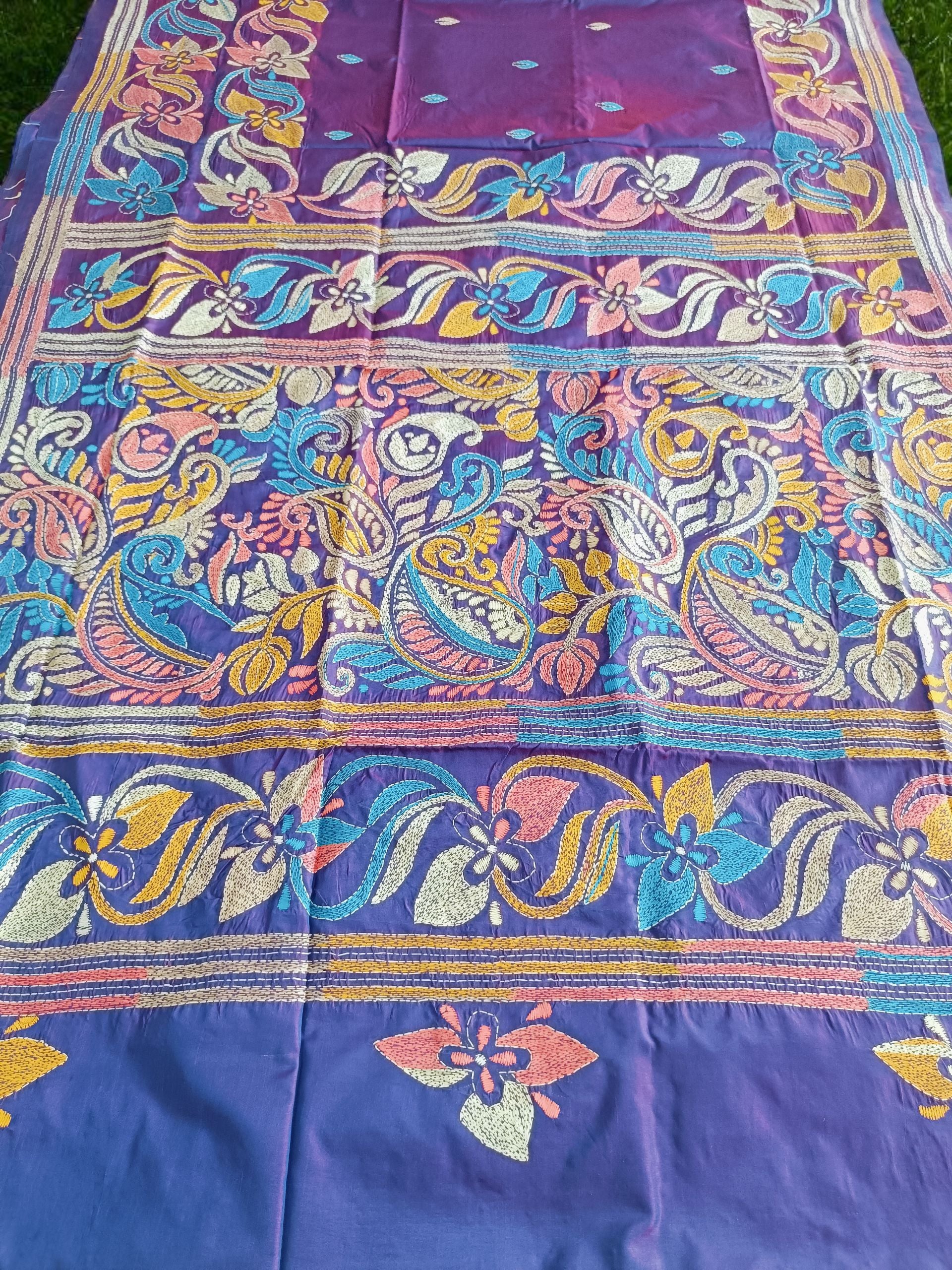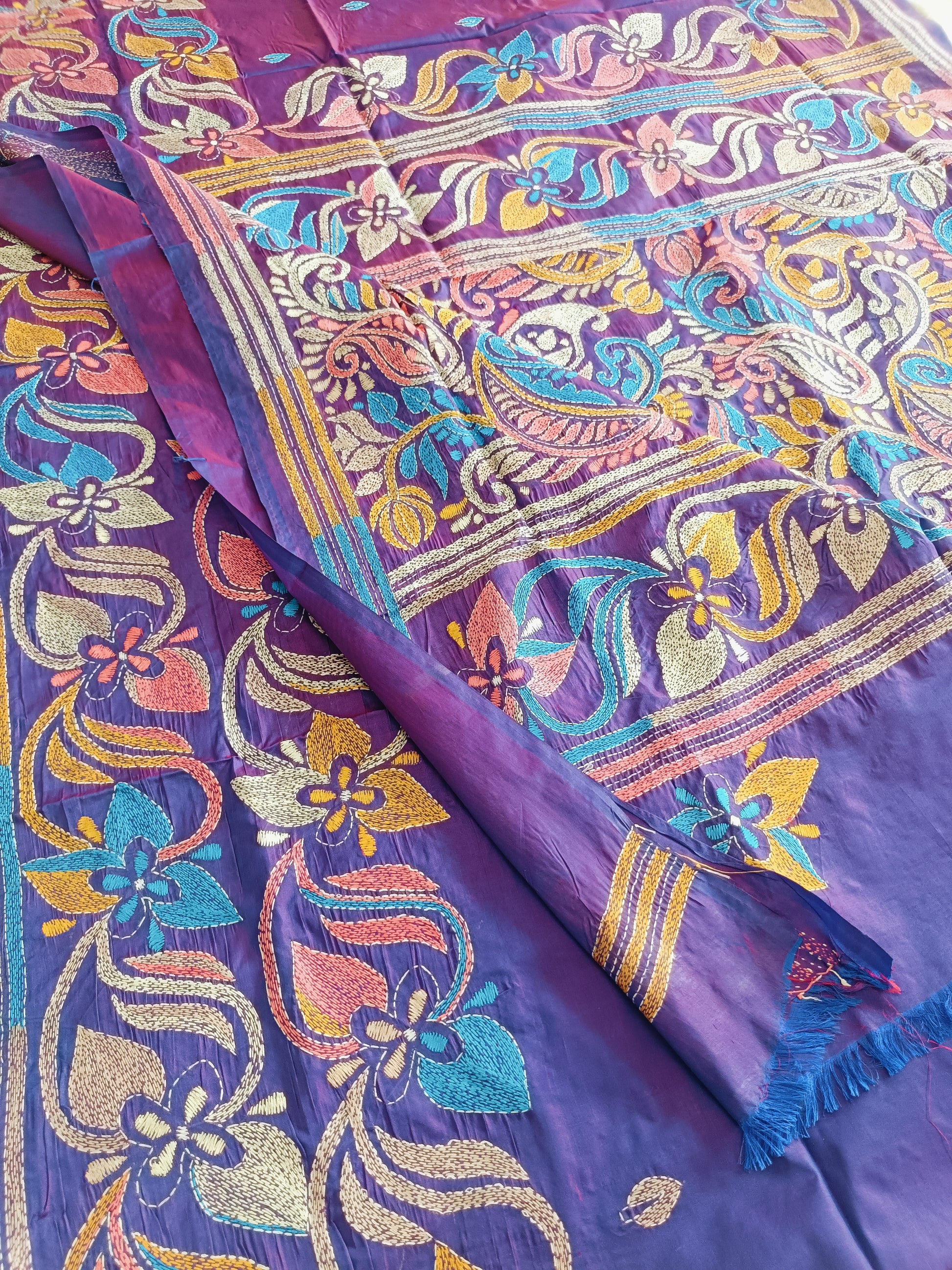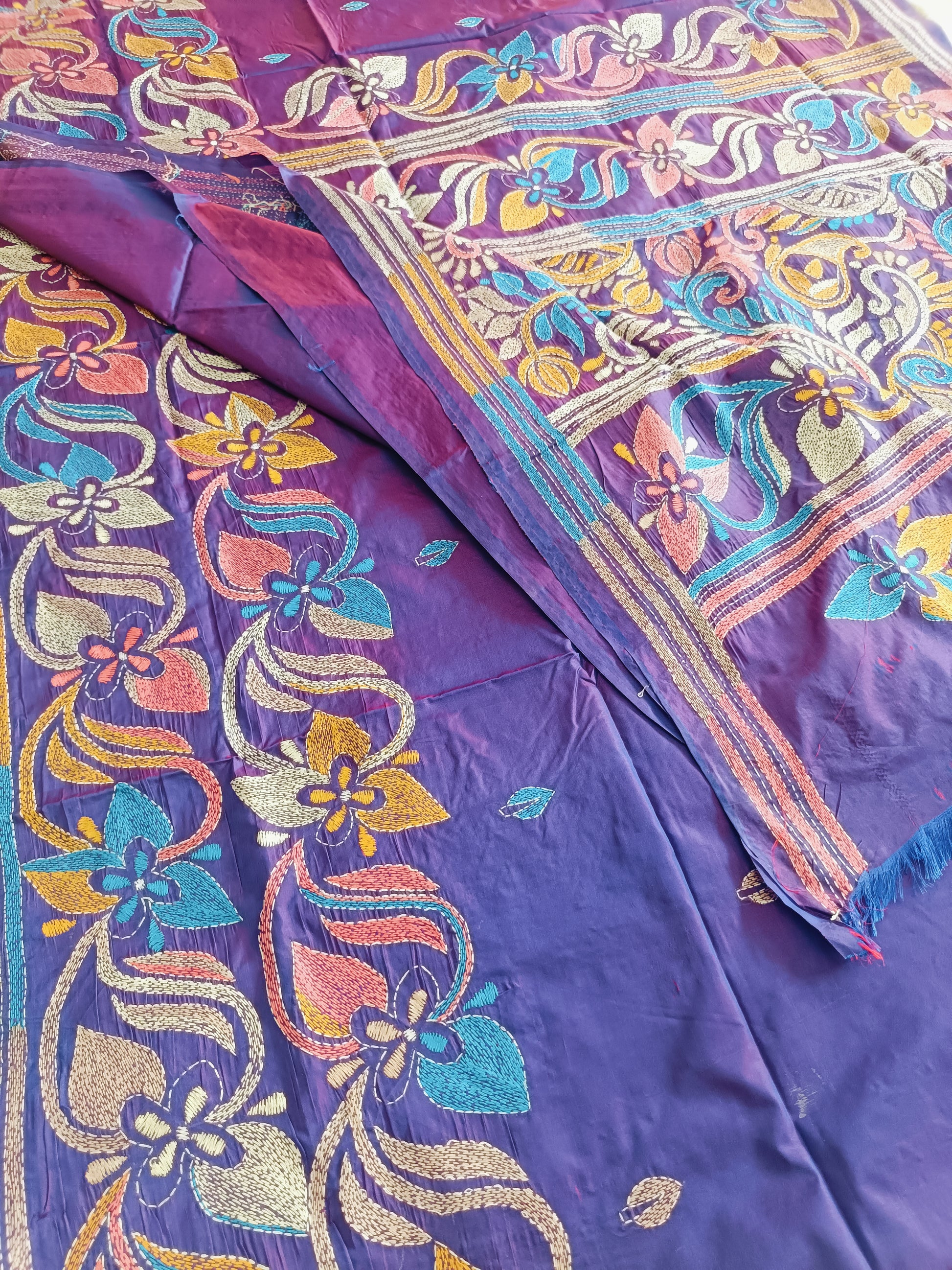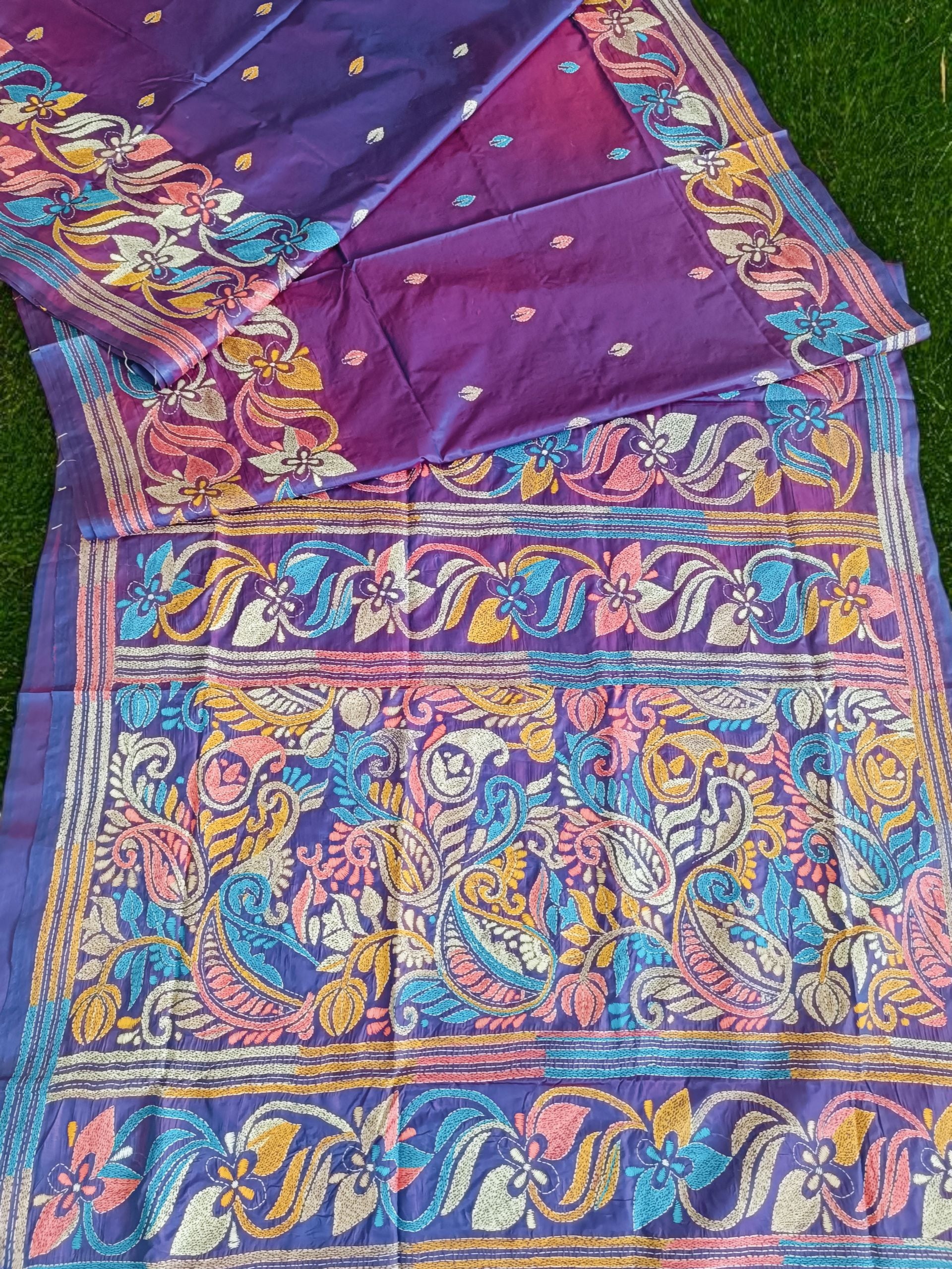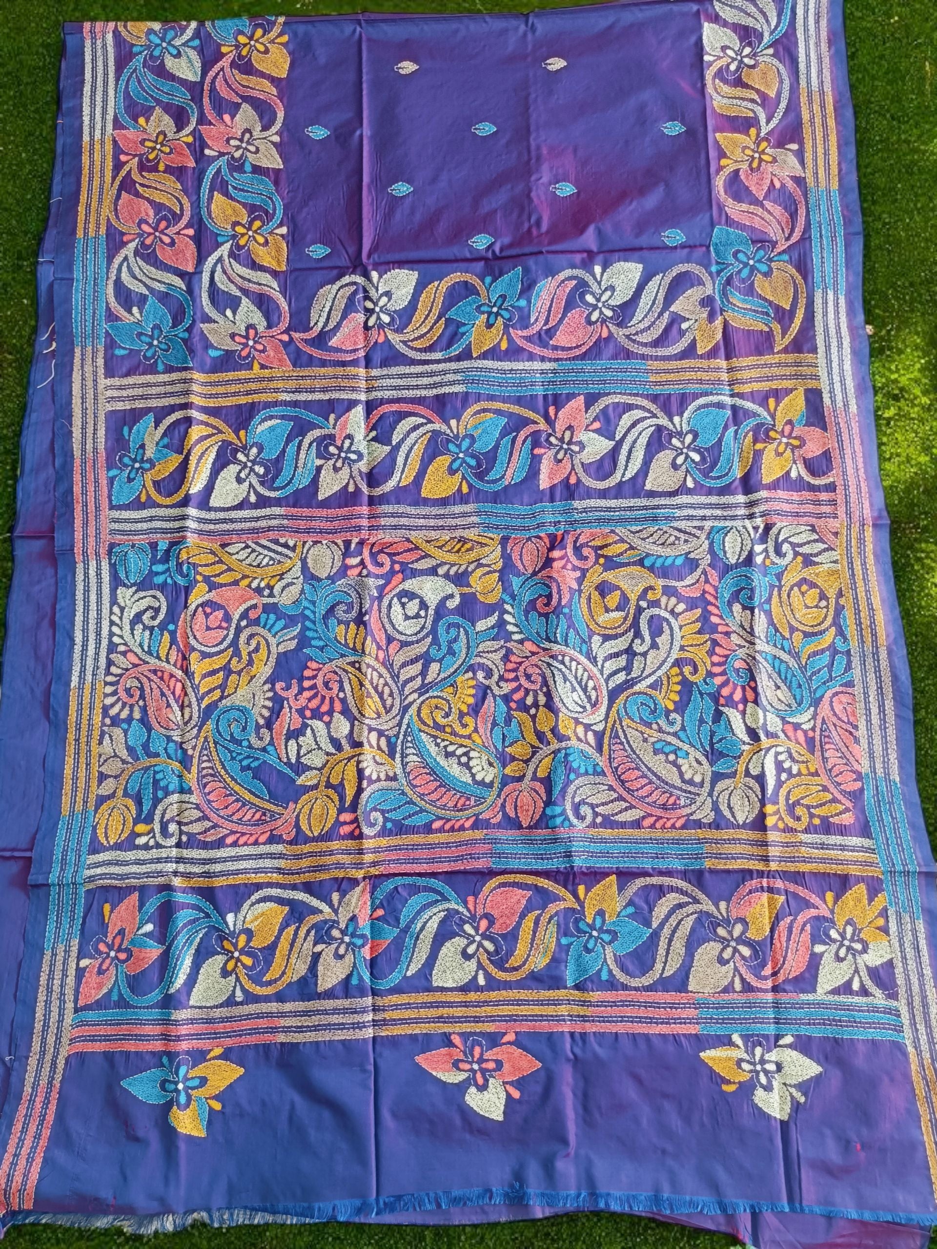 Exquisitely handcrafted Blended Bangalore Silk Saree with all-over Kantha Stitch embroidery. Rich in texture and elegance, this masterpiece blends traditional artistry with a modern, comfortable drape — perfect for special occasions.