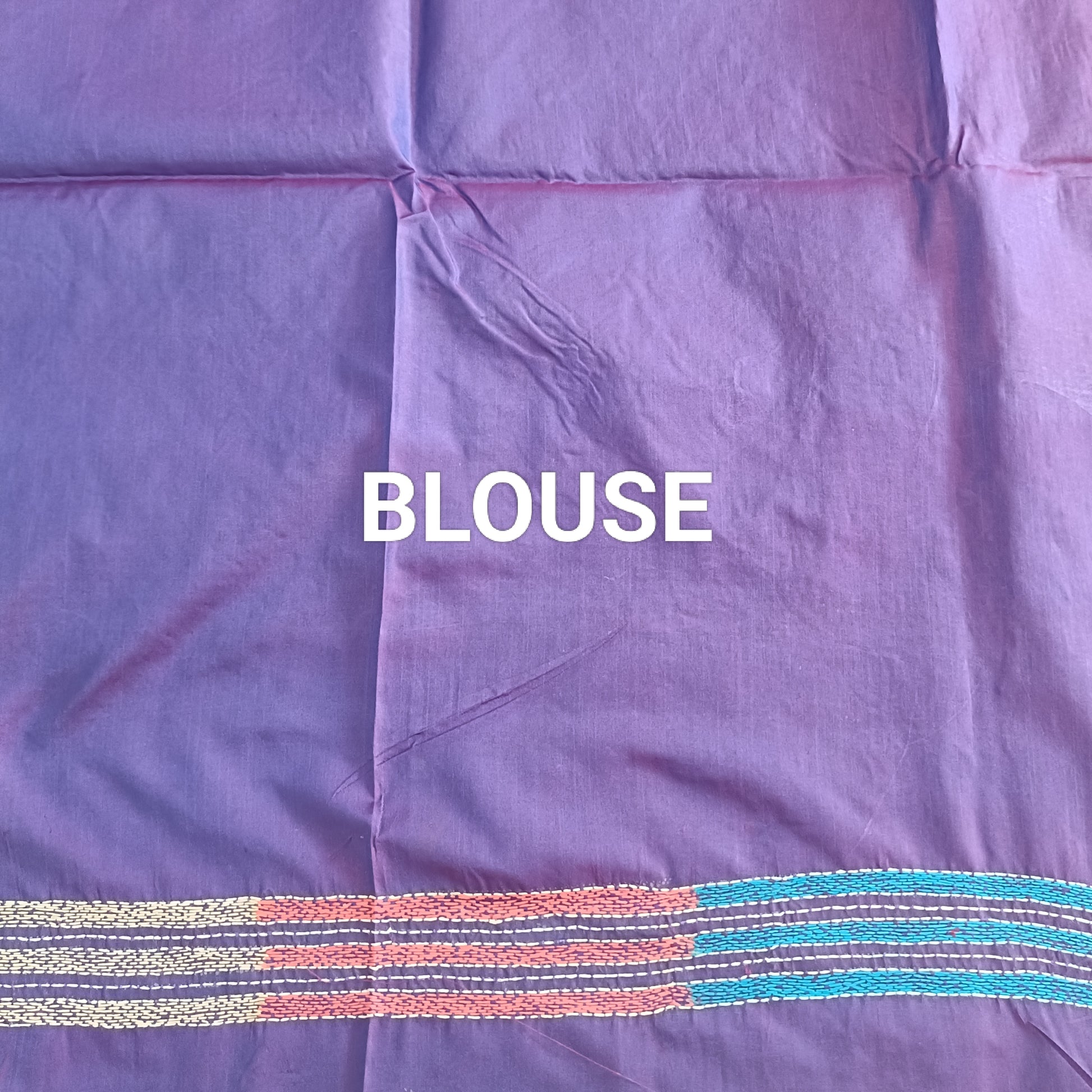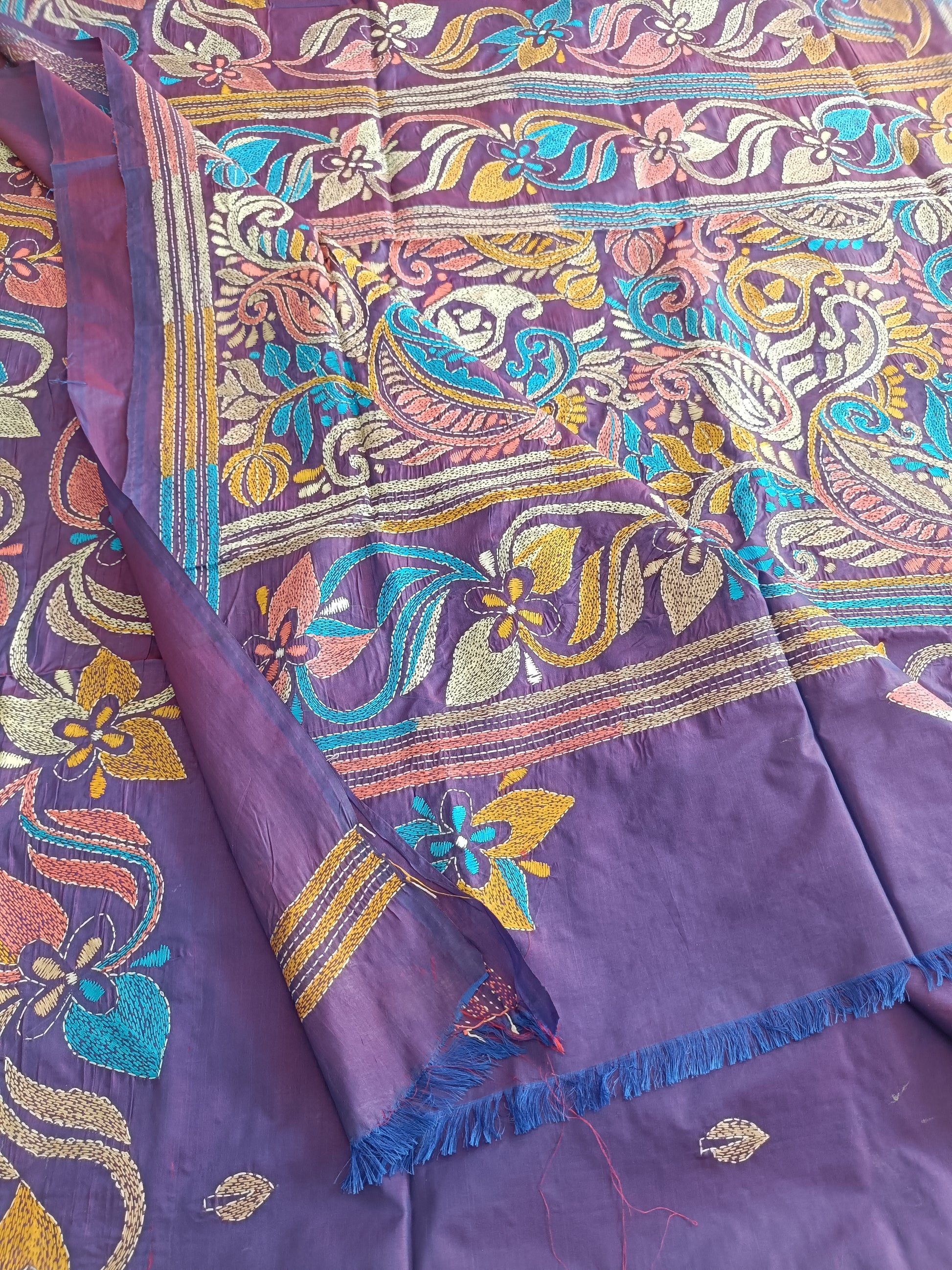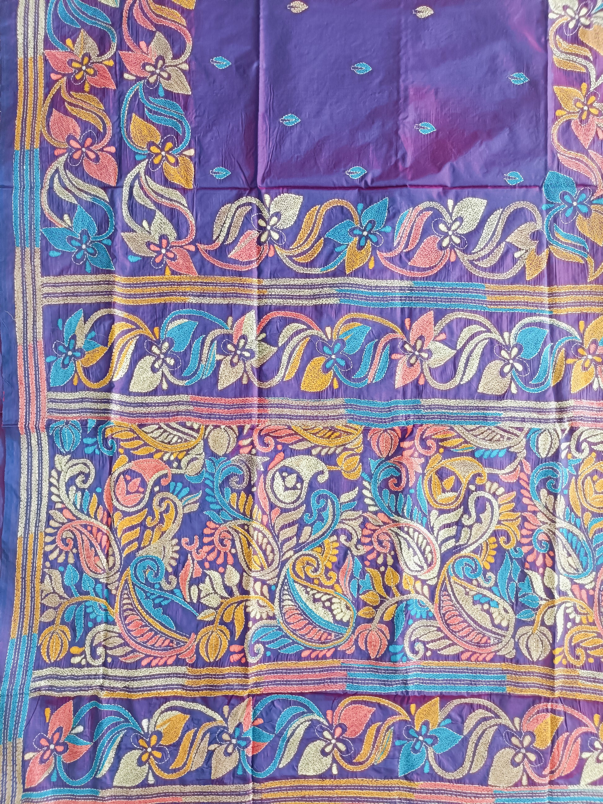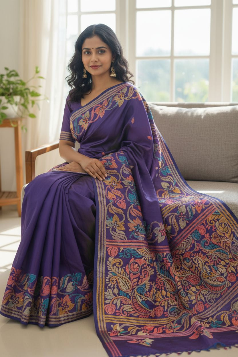Exquisitely handcrafted Blended Bangalore Silk Saree with all-over Kantha Stitch embroidery. Rich in texture and elegance, this masterpiece blends traditional artistry with a modern, comfortable drape — perfect for special occasions.