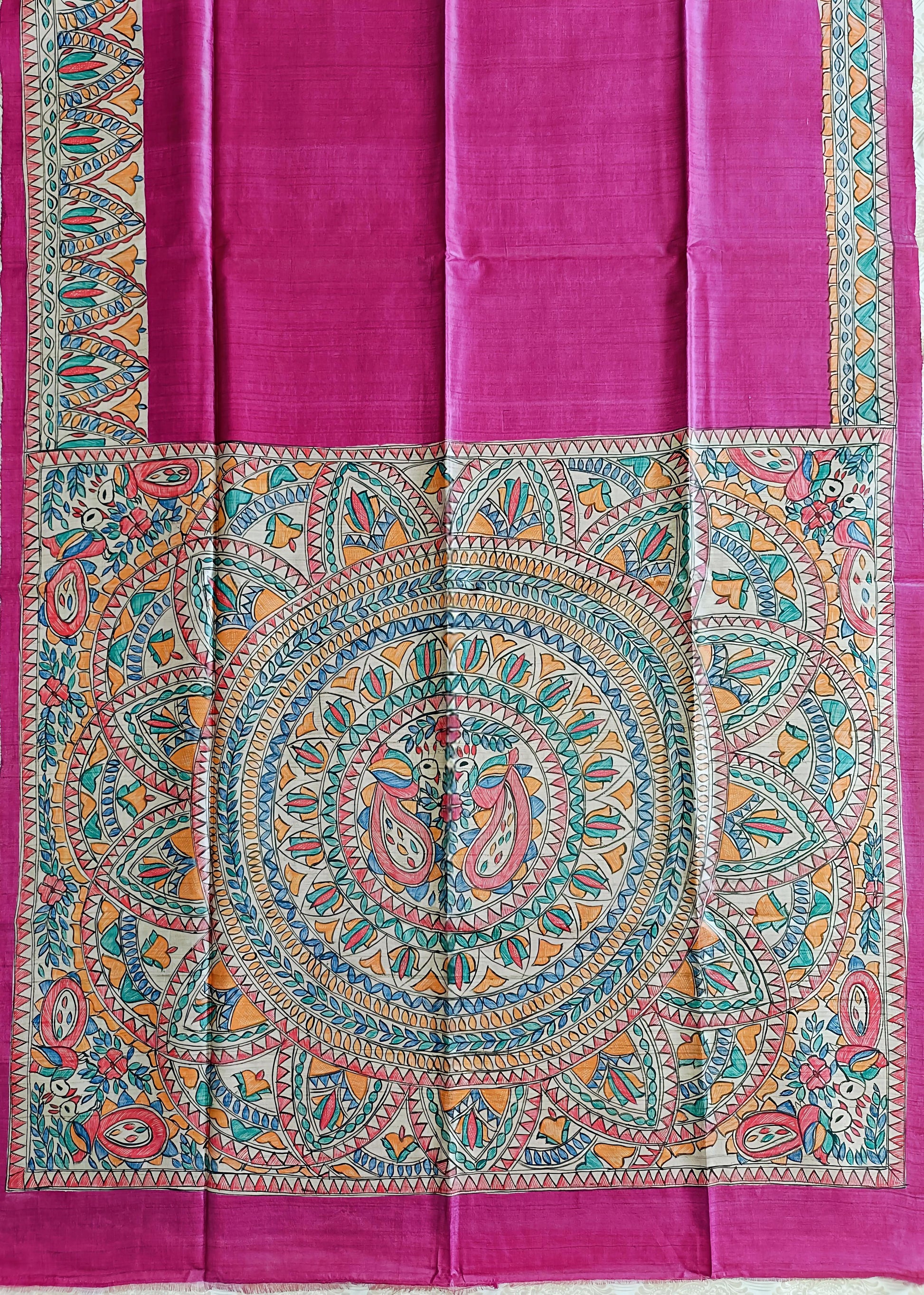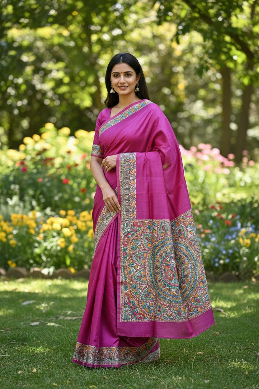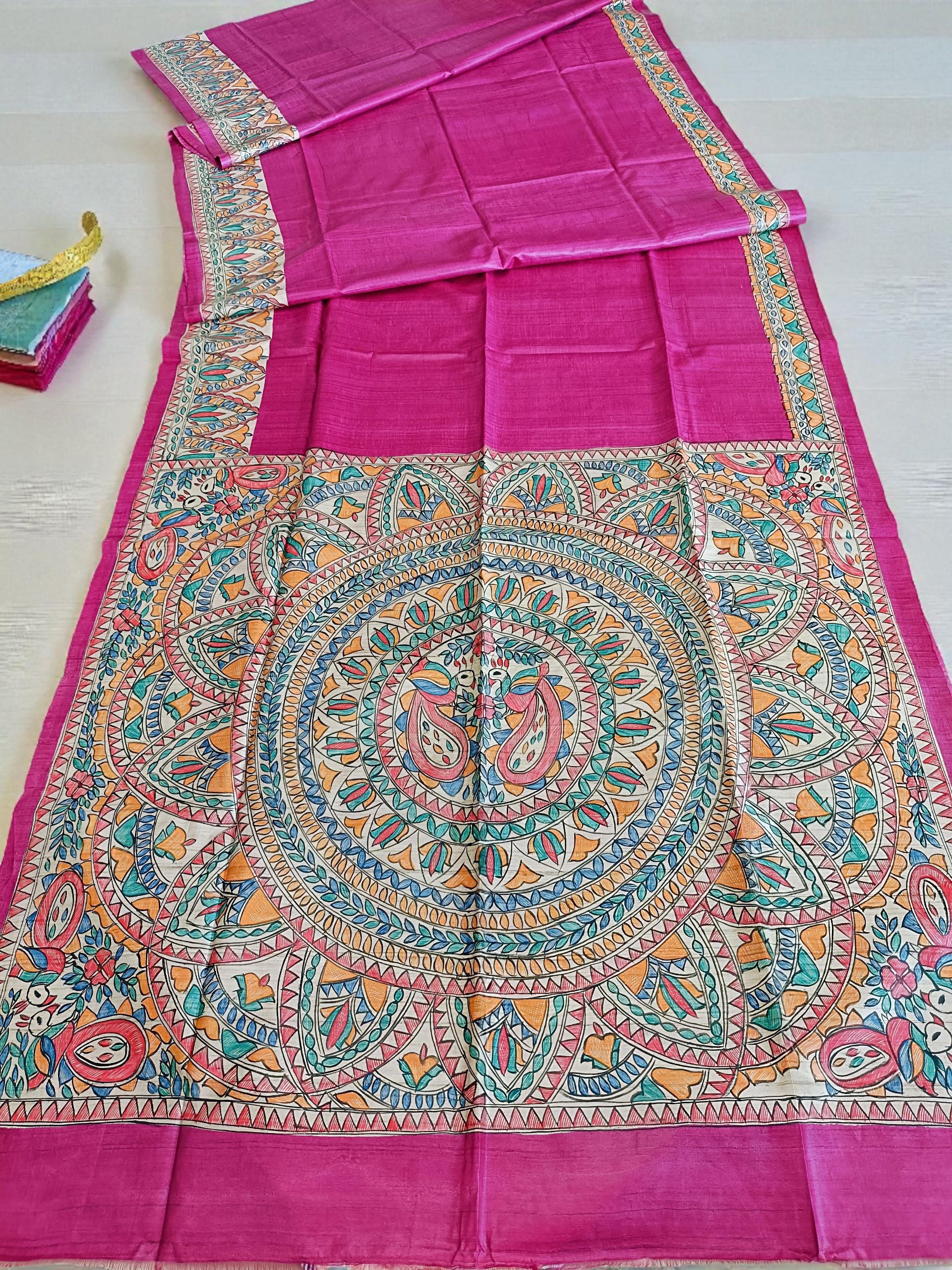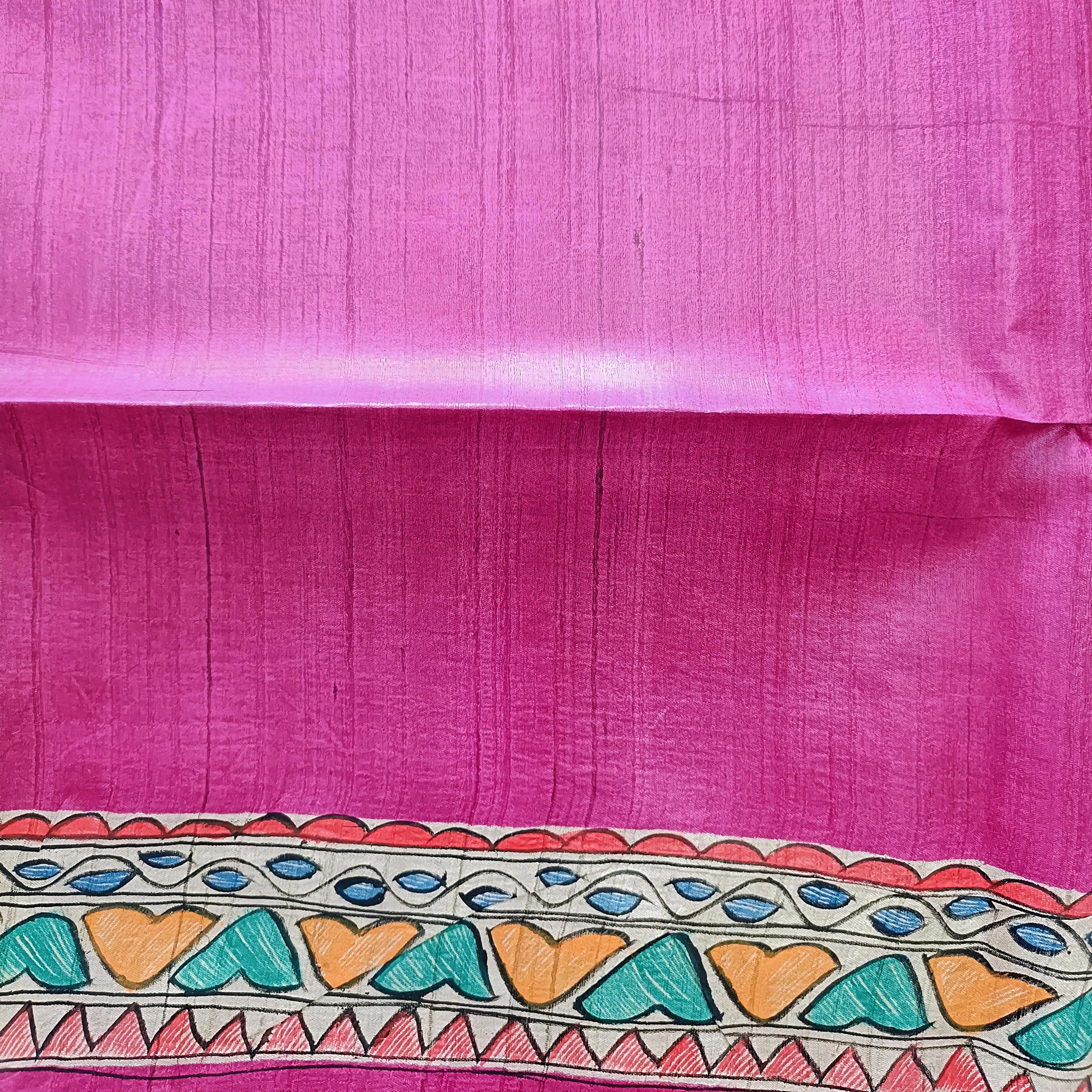 Dive into a world of vibrant artistry with this bright pink (rani) Madhubani saree, celebrating the playful Dance of the Fish. The lively, regal pink forms a striking canvas for hand-painted Madhubani motifs, where fishes swim gracefully across the pallu and bold border, capturing the joyous rhythm of water and folklore. Woven on handcrafted pure Bhagalpur Desi silk, the saree shimmers with a lustrous sheen, flows with a graceful drape, and exudes a sumptuous, luxurious texture that feels as rich as the colors it carries. Paired with a running blouse design, this ensemble blends traditional craftsmanship with contemporary charm, making it perfect for festivals, weddings, or celebrations. Bursting with vivid elegance, intricate artistry, and playful sophistication, this saree is a collectible masterpiece that brings joy, color, and culture to every drape.