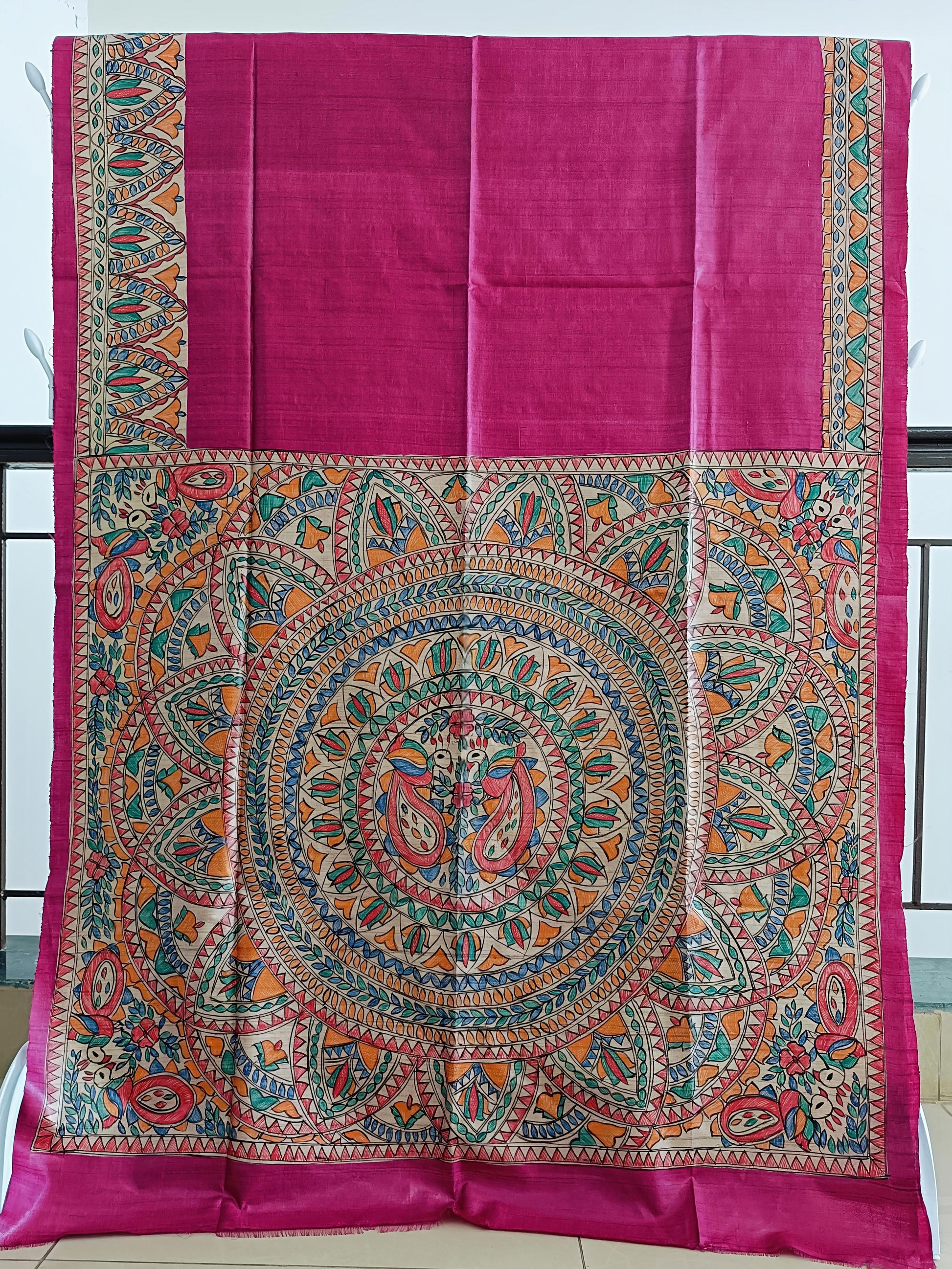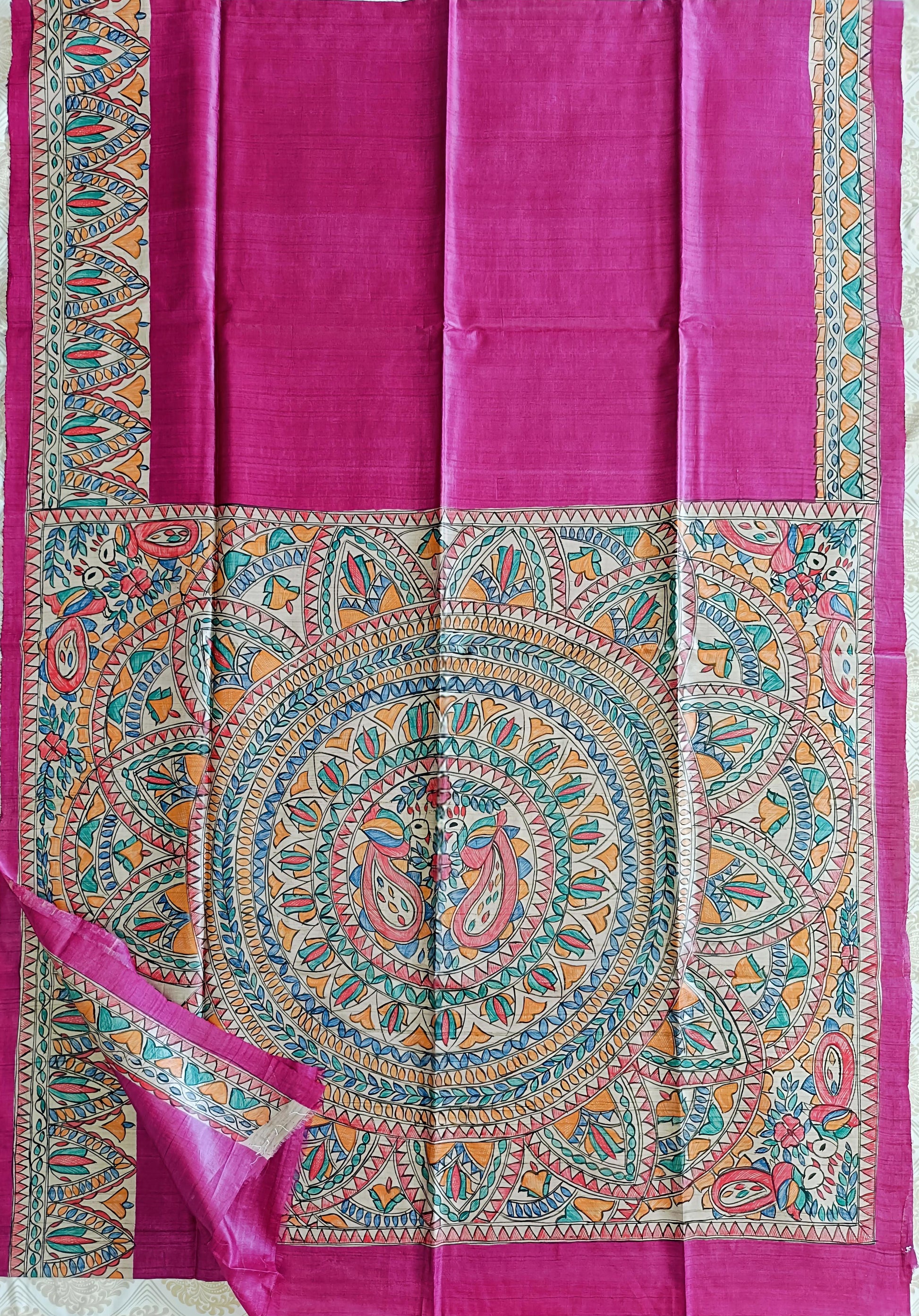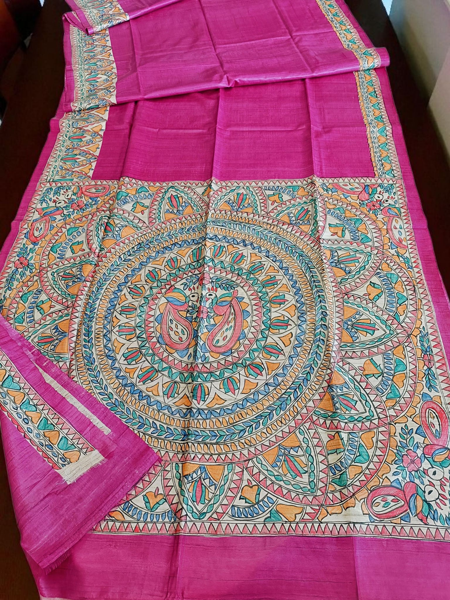 Dive into a world of vibrant artistry with this bright pink (rani) Madhubani saree, celebrating the playful Dance of the Fish. The lively, regal pink forms a striking canvas for hand-painted Madhubani motifs, where fishes swim gracefully across the pallu and bold border, capturing the joyous rhythm of water and folklore. Woven on handcrafted pure Bhagalpur Desi silk, the saree shimmers with a lustrous sheen, flows with a graceful drape, and exudes a sumptuous, luxurious texture that feels as rich as the colors it carries. Paired with a running blouse design, this ensemble blends traditional craftsmanship with contemporary charm, making it perfect for festivals, weddings, or celebrations. Bursting with vivid elegance, intricate artistry, and playful sophistication, this saree is a collectible masterpiece that brings joy, color, and culture to every drape.