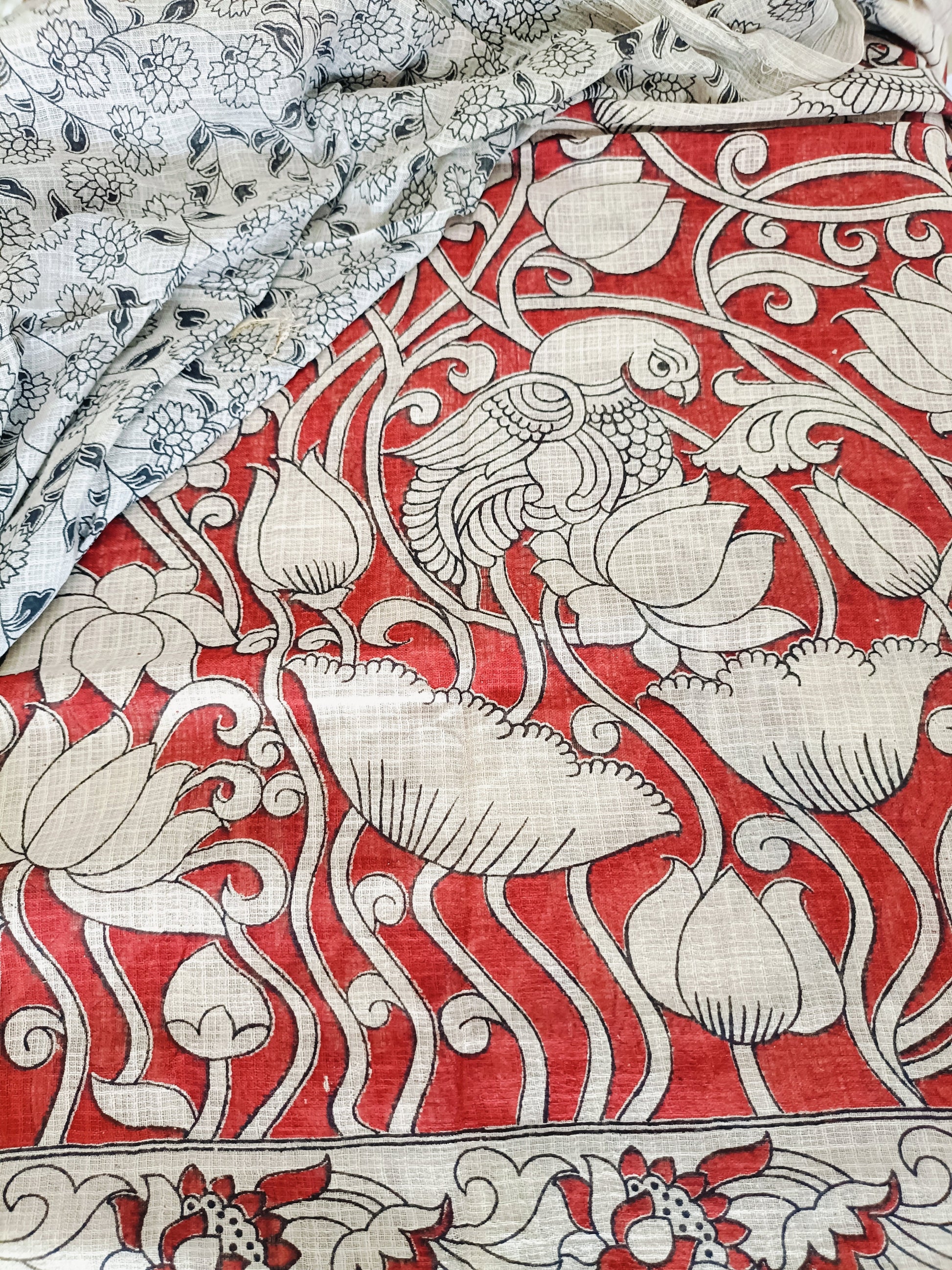 Crafted from pure Kota Doria cotton, this exquisite textile features intricate hand-printed Kalamkari designs and comes with a matching blouse piece. Each item is entirely handmade, so you may find scattered colors, slight irregularities, missing prints, or traces of starch—these charming imperfections are a testament to its authenticity and artisanal craftsmanship. The fabric is easy to wash, but gentle care is recommended to ensure its durability and longevity.