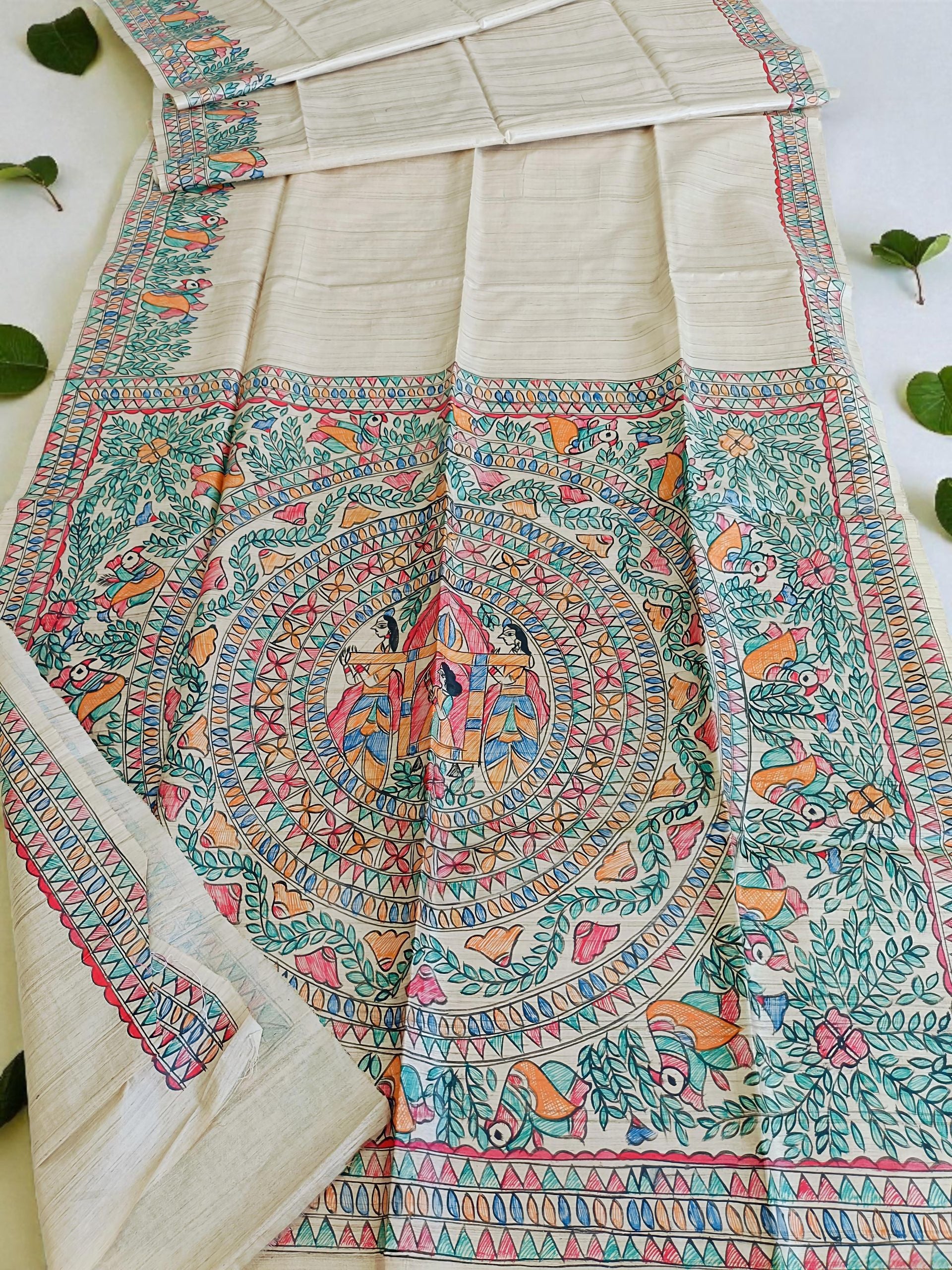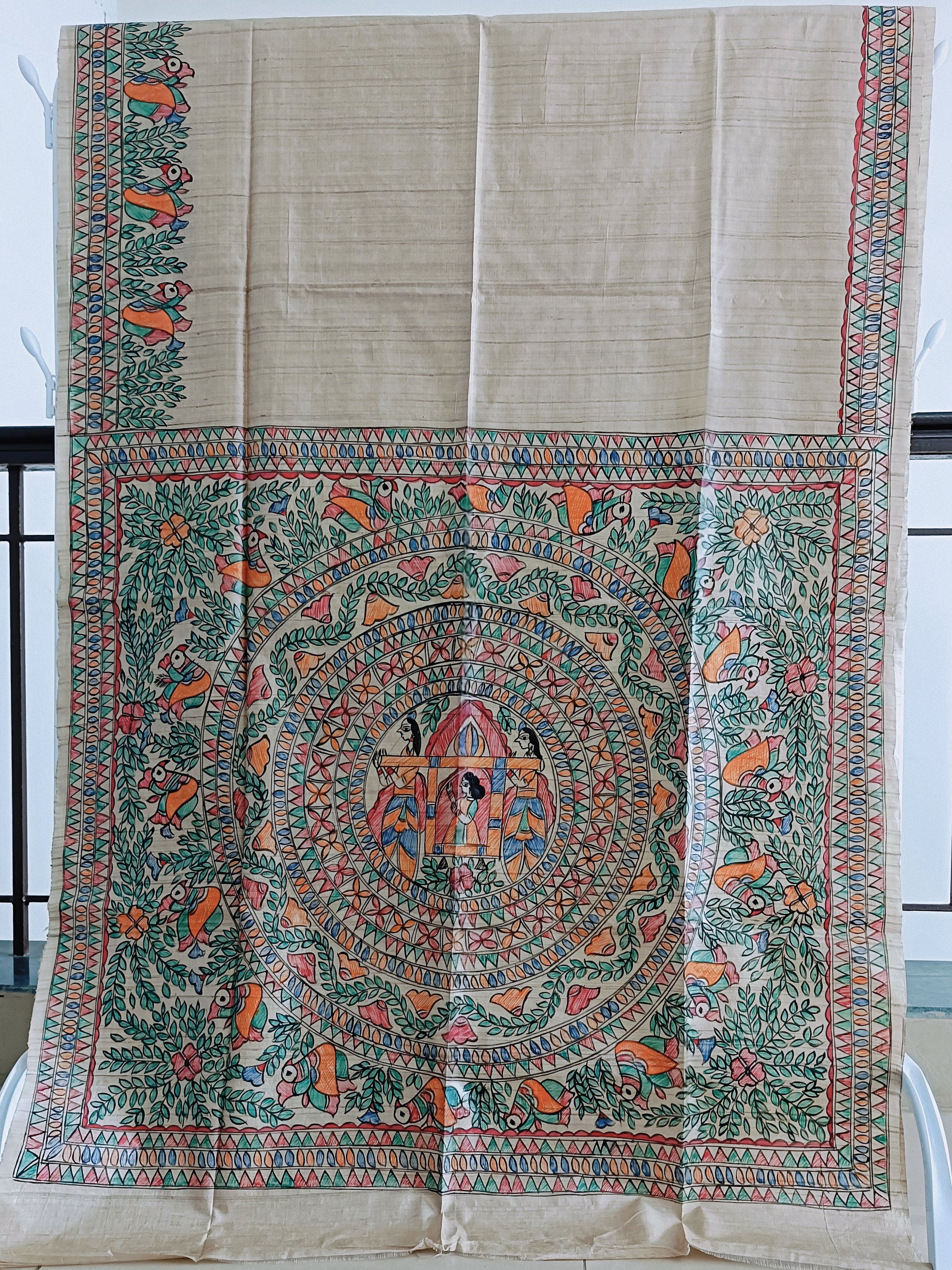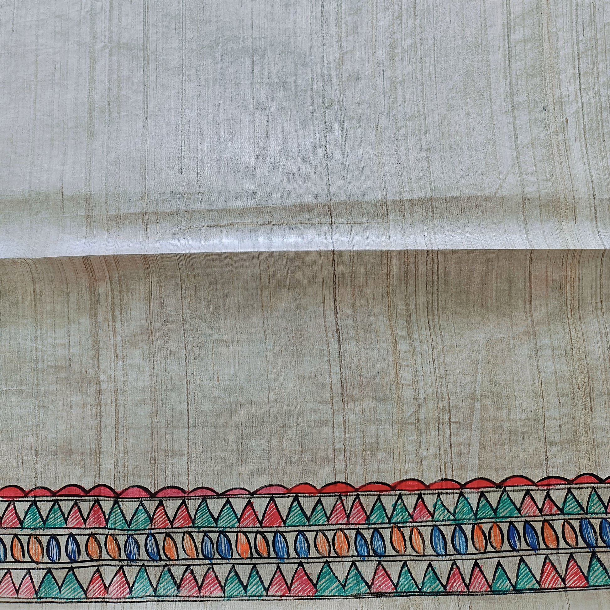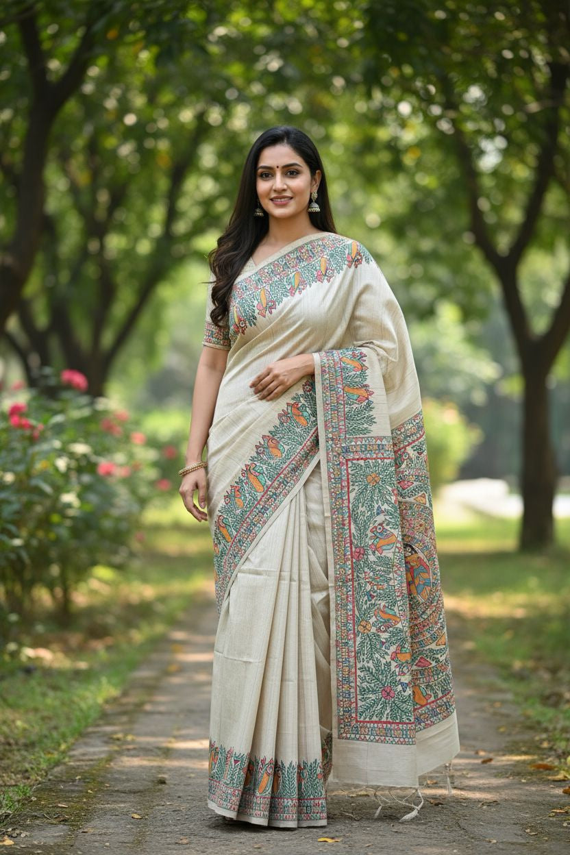 Step into the tender, emotional world of farewells with this natural-hued Tussar Madhubani saree, inspired by the poignant theme of “Vidai Ki Chhaya”. The warm, earthy tones of the tussar silk form a gentle, elegant canvas for hand-painted Madhubani motifs, capturing the subtle emotions, grace, and nostalgia of a bride’s farewell. The pallu and border are adorned with intricate, story-rich designs that narrate tradition and sentiment with every fold. Woven on handcrafted, pure Bhagalpur Desi Silk, the saree boasts a lustrous sheen, fluid drape, and rich texture, reflecting the finesse of artisan craftsmanship. Complemented by a running blouse design, this ensemble balances poetic emotion, timeless elegance, and handcrafted artistry, making it perfect for weddings, cultural ceremonies, or festive occasions. A collector’s masterpiece, this saree radiates heritage, sophistication, and the quiet beauty of cherished moments.