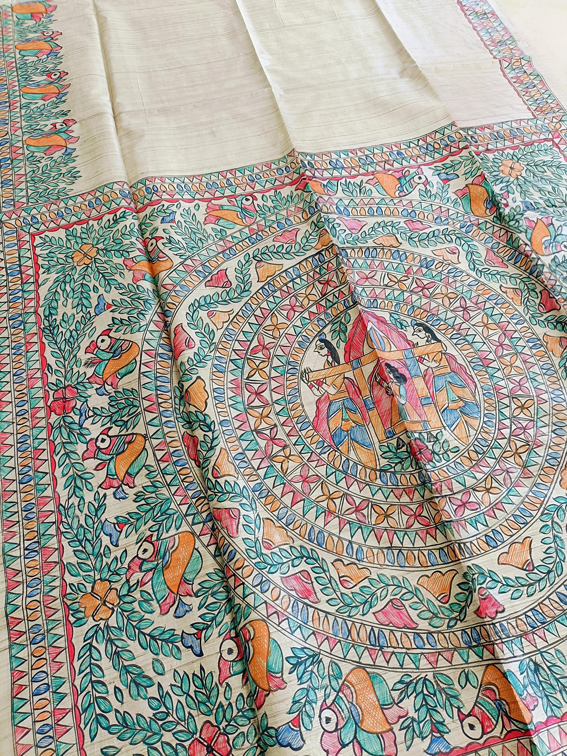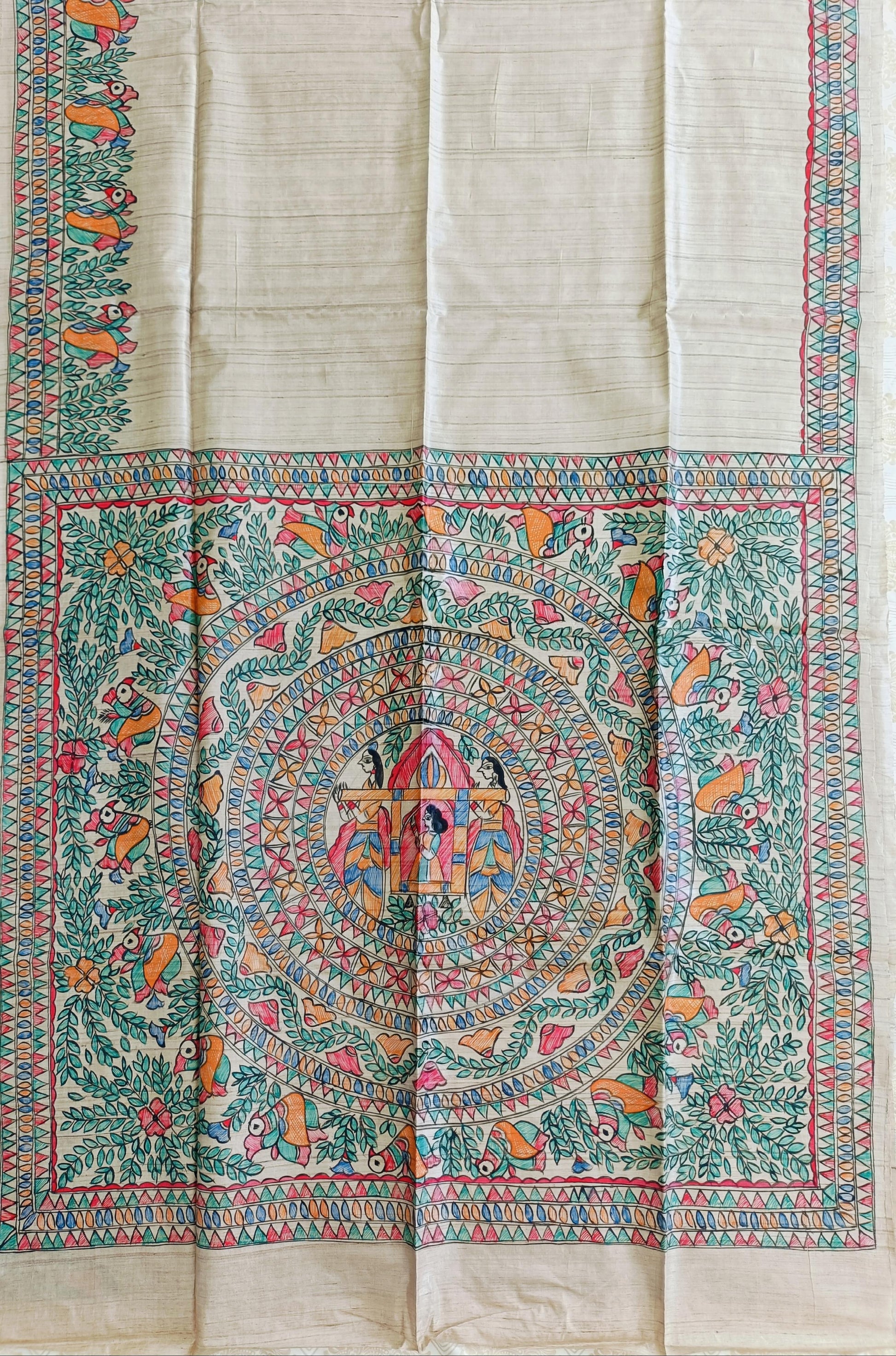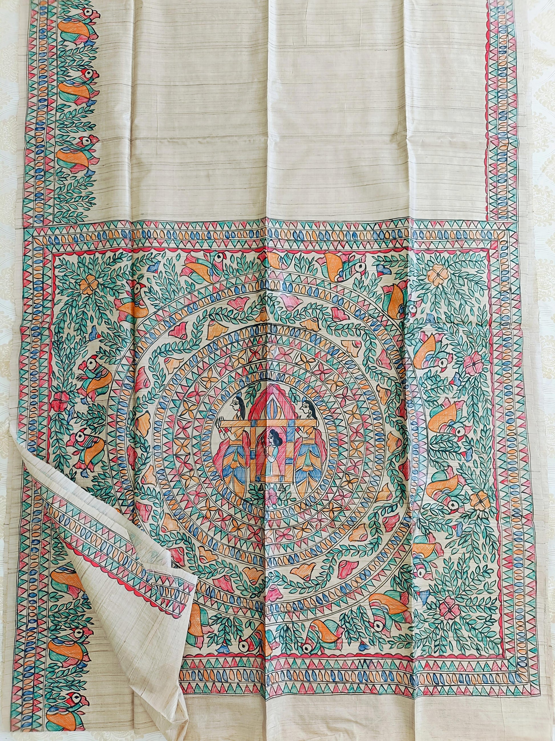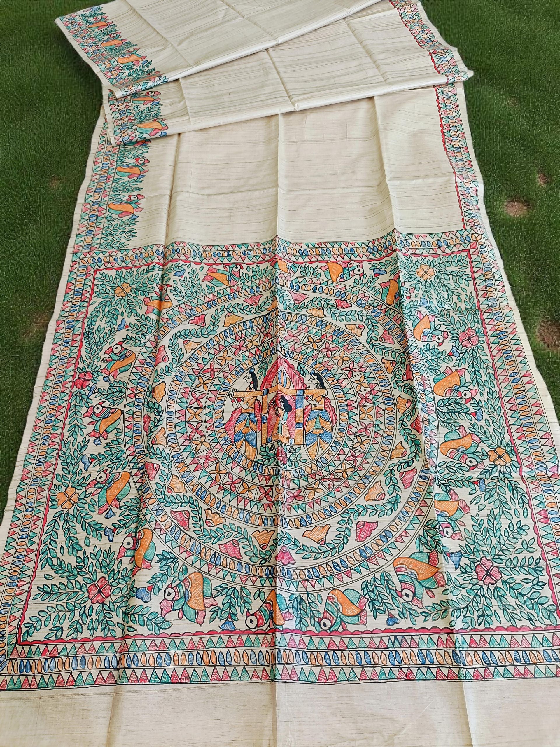 Step into the tender, emotional world of farewells with this natural-hued Tussar Madhubani saree, inspired by the poignant theme of “Vidai Ki Chhaya”. The warm, earthy tones of the tussar silk form a gentle, elegant canvas for hand-painted Madhubani motifs, capturing the subtle emotions, grace, and nostalgia of a bride’s farewell. The pallu and border are adorned with intricate, story-rich designs that narrate tradition and sentiment with every fold. Woven on handcrafted, pure Bhagalpur Desi Silk, the saree boasts a lustrous sheen, fluid drape, and rich texture, reflecting the finesse of artisan craftsmanship. Complemented by a running blouse design, this ensemble balances poetic emotion, timeless elegance, and handcrafted artistry, making it perfect for weddings, cultural ceremonies, or festive occasions. A collector’s masterpiece, this saree radiates heritage, sophistication, and the quiet beauty of cherished moments.