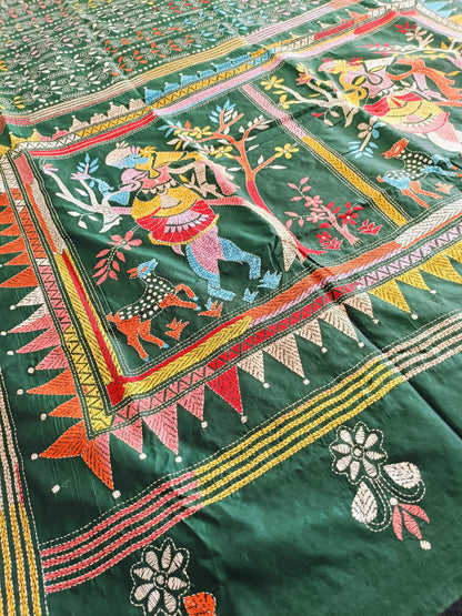 In the quiet depths of forest hues, this dark green Kantha stitch saree unveils the story of Shakuntala — nature’s beloved muse and the embodiment of grace and love. Every delicate thread flows like poetry, tracing leaves, blossoms, and whispered longings that echo through the serene woods.