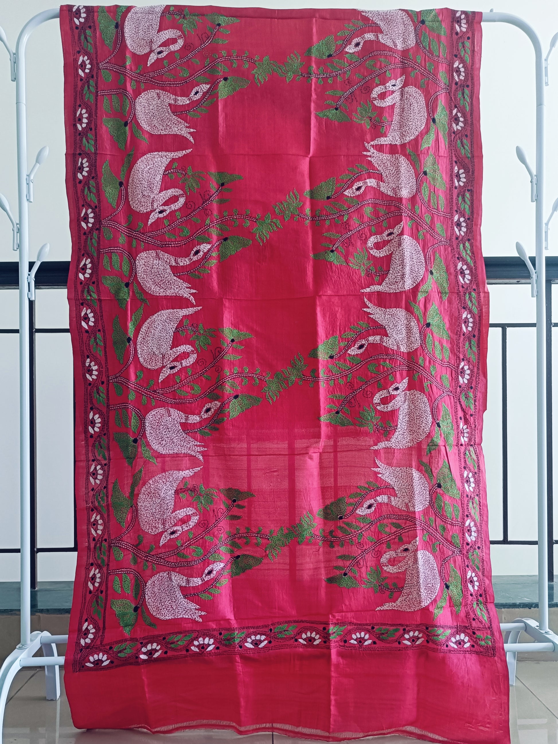 Across still waters, the Swan 🦢 glides — serene, unhurried, and radiant in her beauty. She is a symbol of purity and devotion, of love that endures through time. This collection of Pure Tussar Silk Dupattas with Kantha stitch designs brings her world alive in thread and texture.
