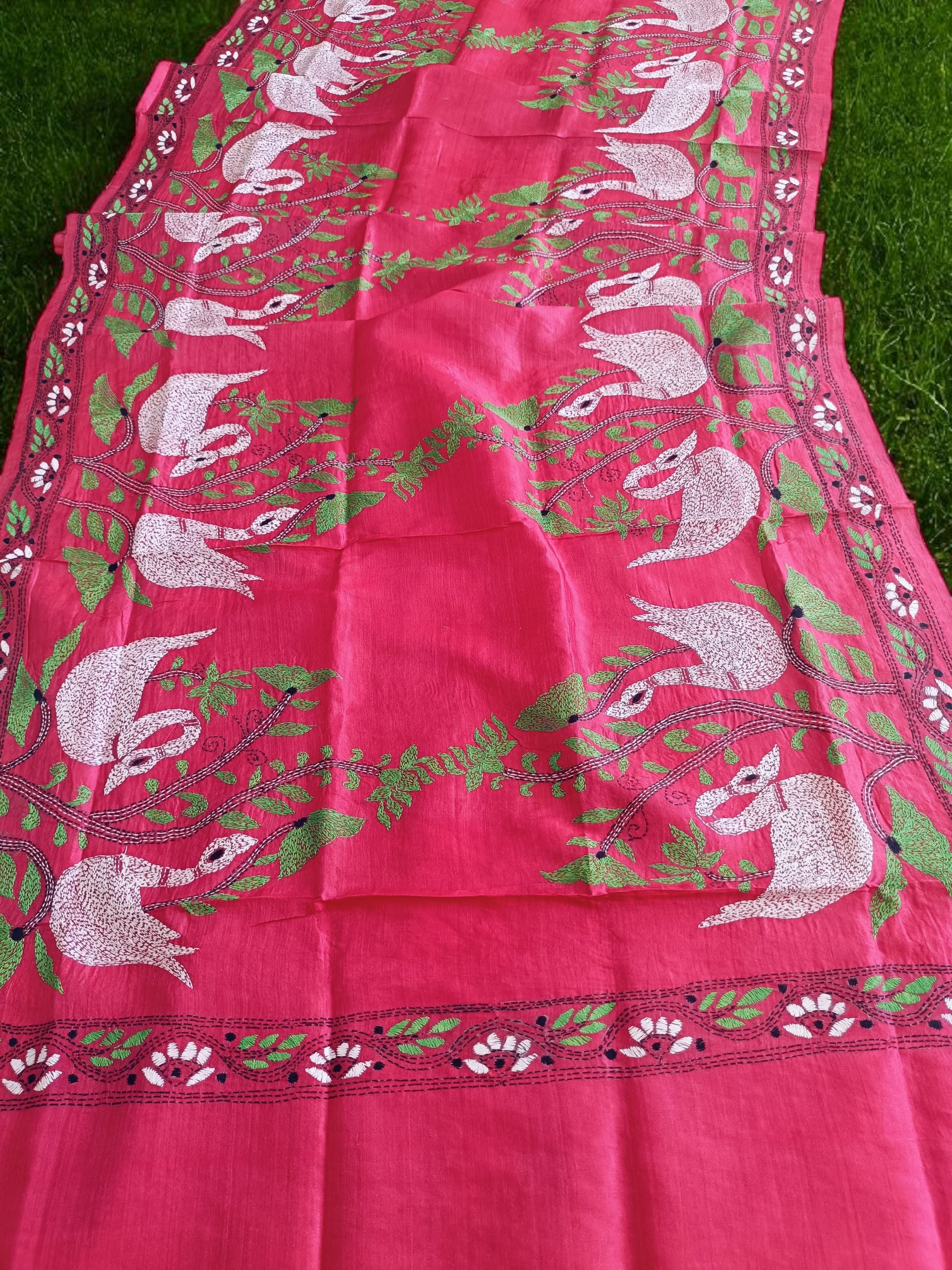 Each hand-stitched motif carries the calm of a lake at dawn, the poise of the swan, and the artistry of skilled hands. Woven in lustrous silk and enriched with timeless Kantha, these dupattas are not mere adornments but reflections of elegance — made for celebrations, heirloom moments, and the poetry of everyday life.