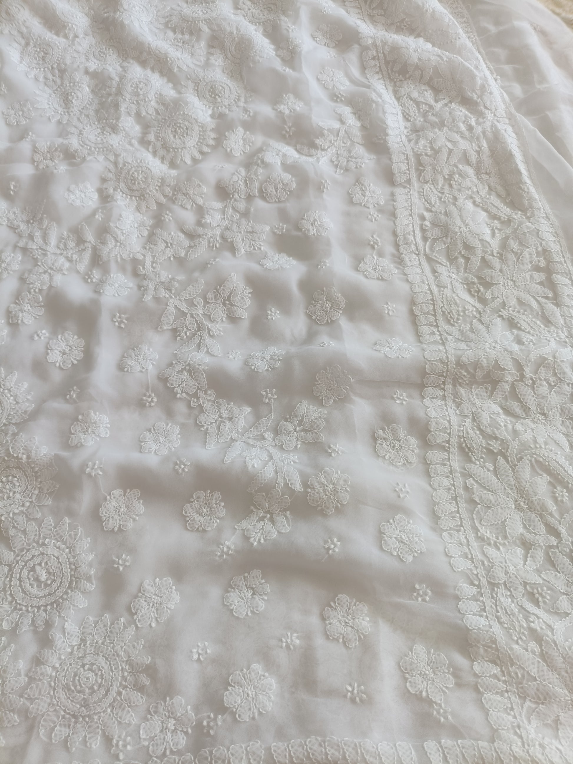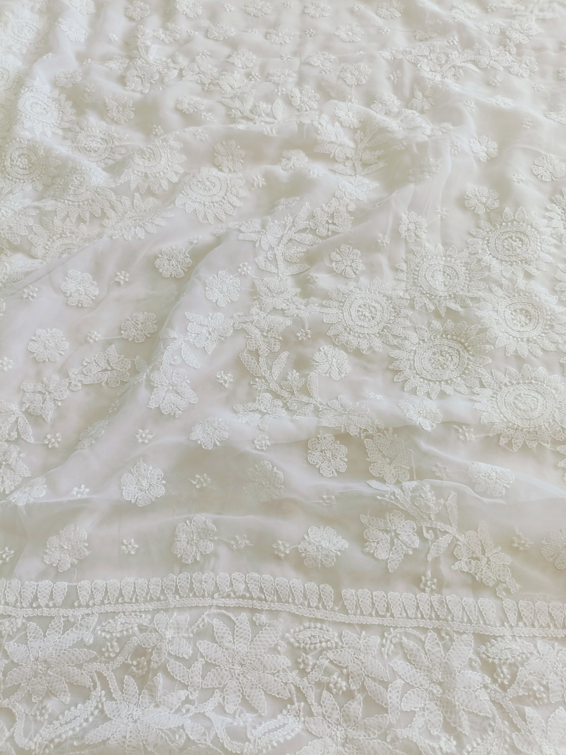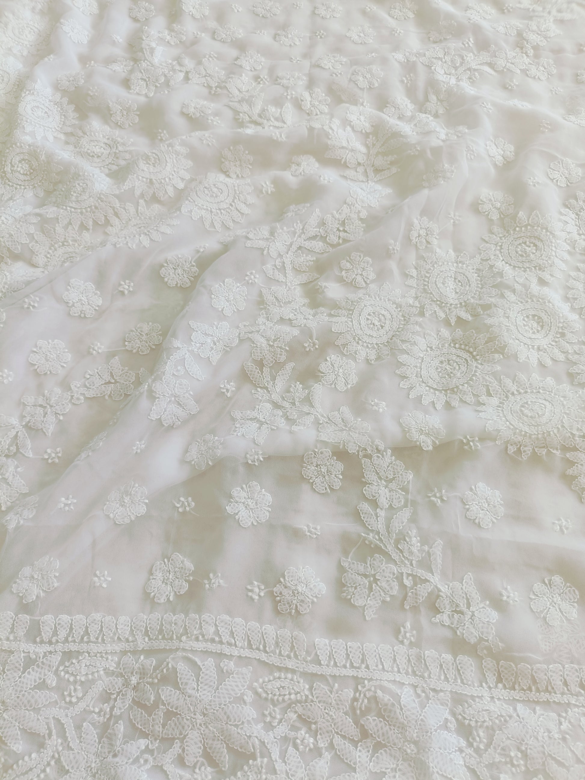 Light as air, these vibrant georgette sarees feature intricate Chikankari embroidery from Lucknow — a richly adorned palla, dainty floral booties along the body & borders, and a soft pastel palette to brighten your wardrobe. Comes with a matching blouse piece (up to 80 cm). Saree width: 42".