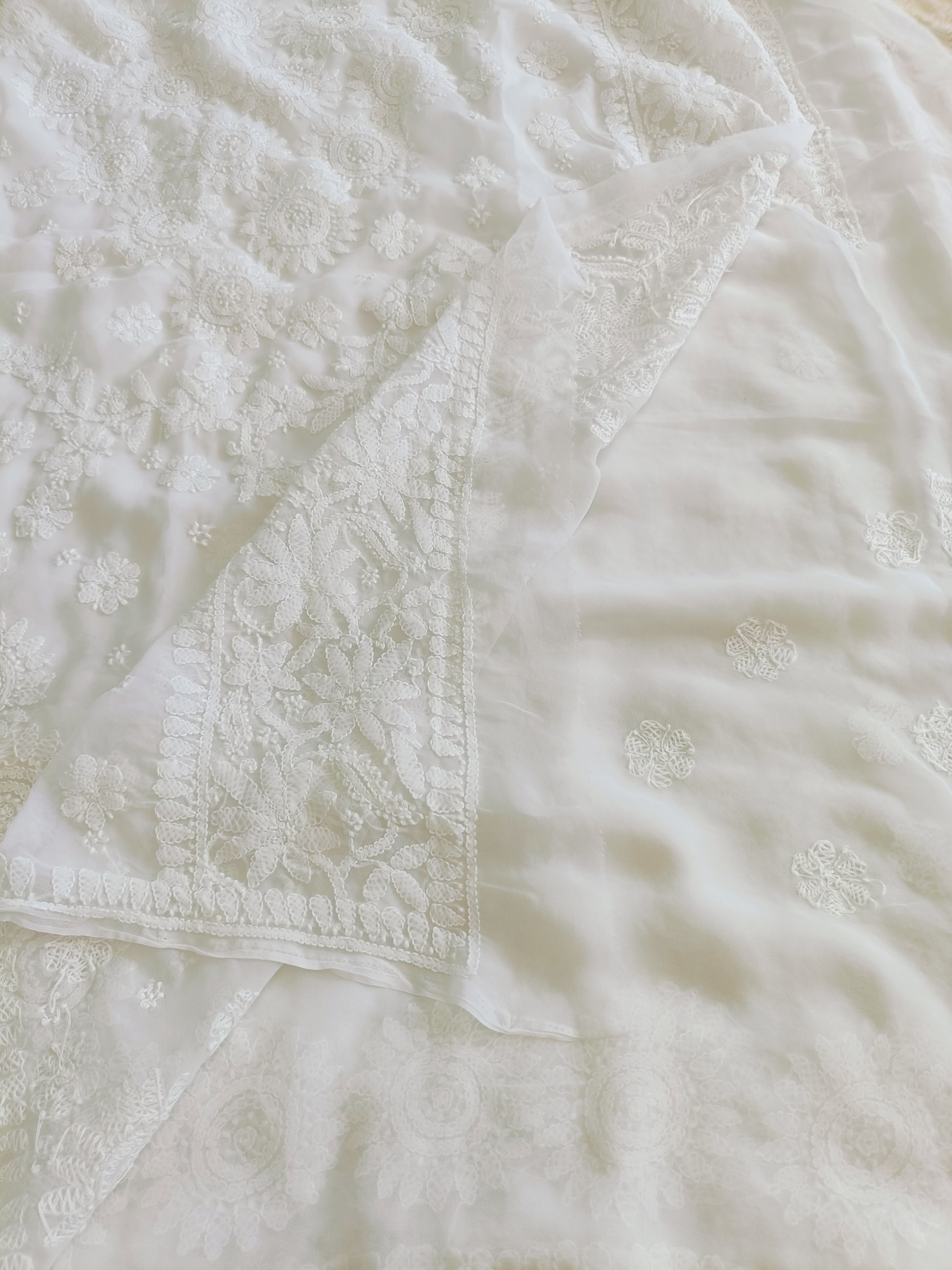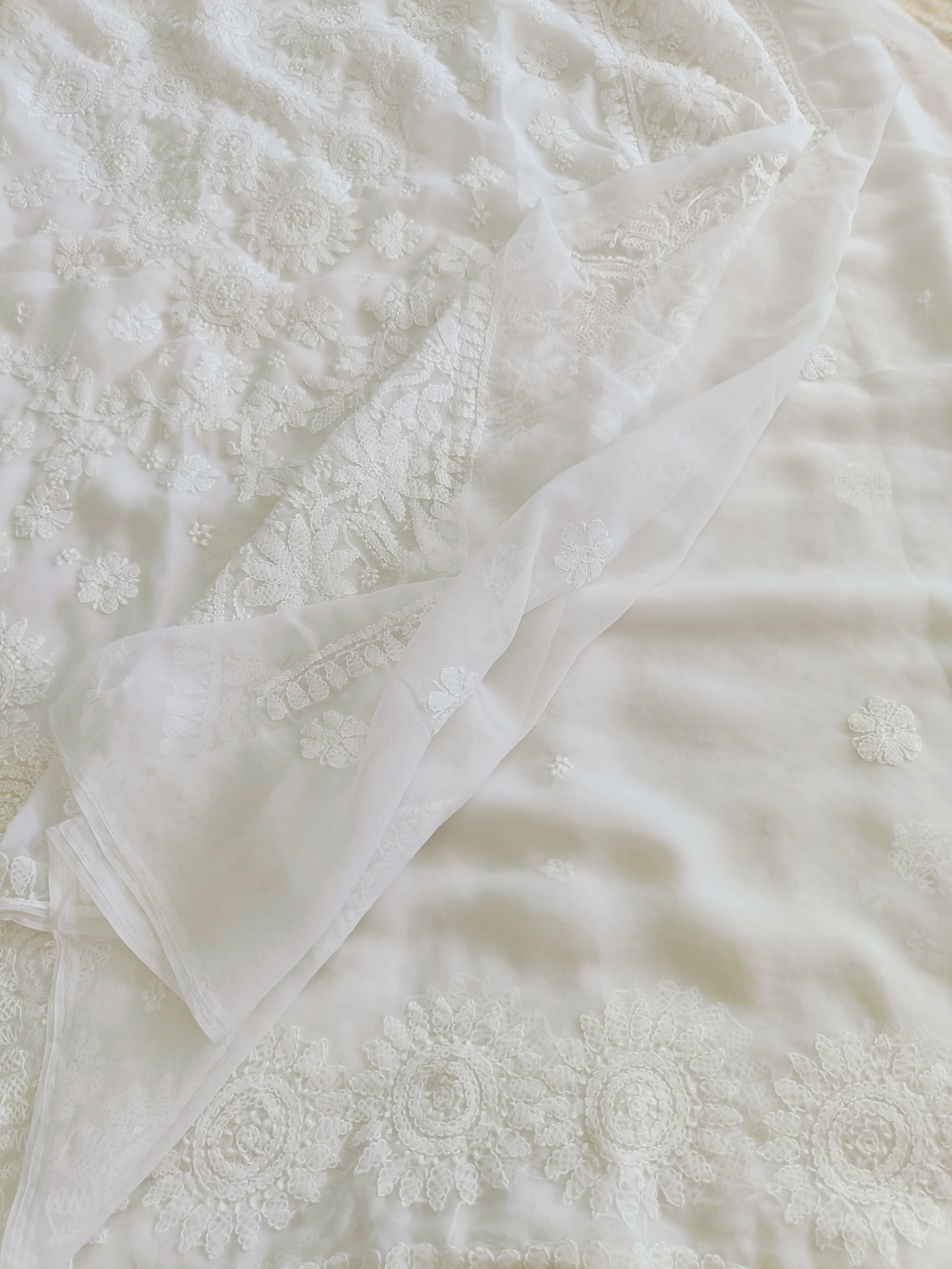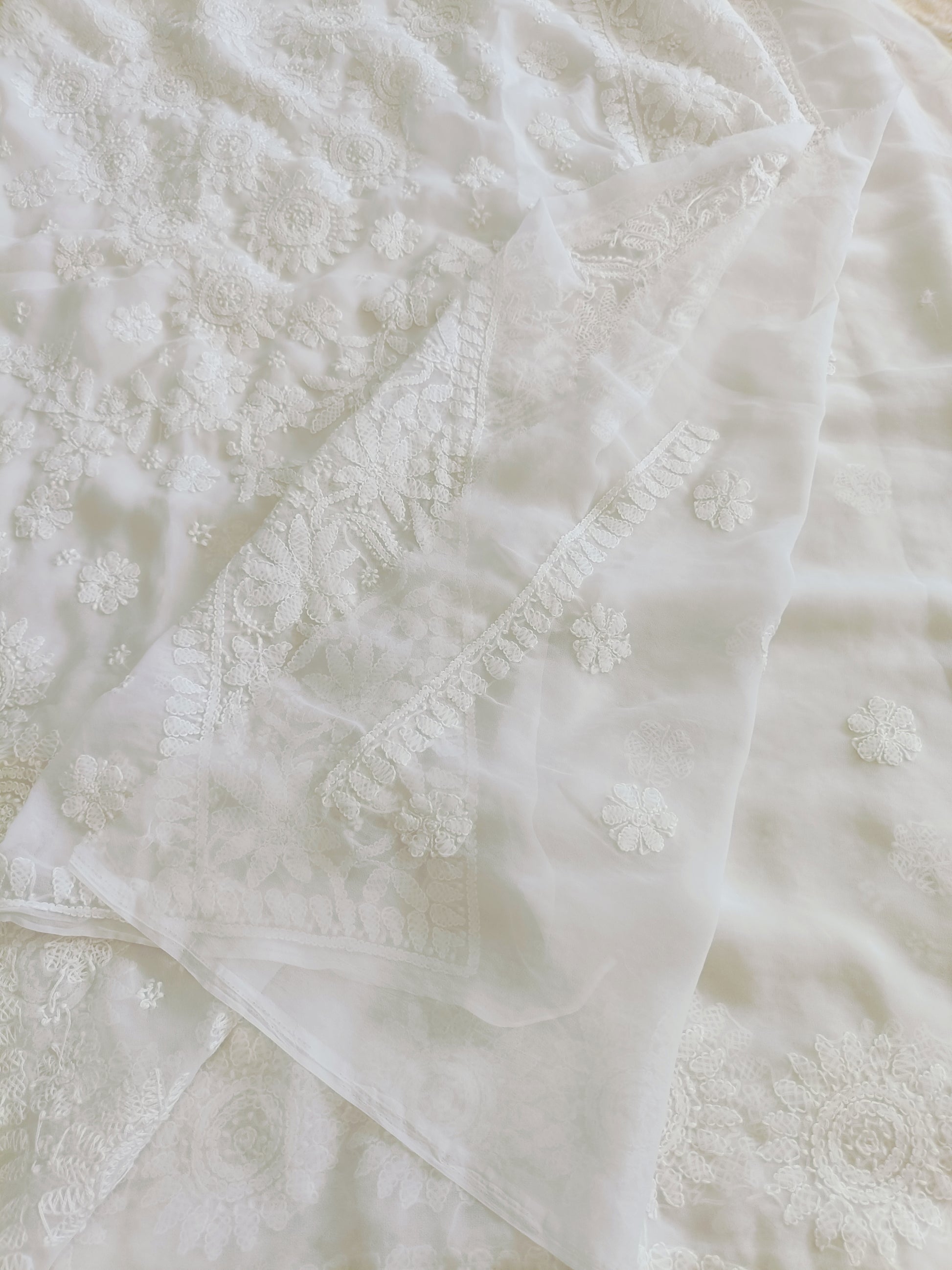 Light as air, these vibrant georgette sarees feature intricate Chikankari embroidery from Lucknow — a richly adorned palla, dainty floral booties along the body & borders, and a soft pastel palette to brighten your wardrobe. Comes with a matching blouse piece (up to 80 cm). Saree width: 42".
