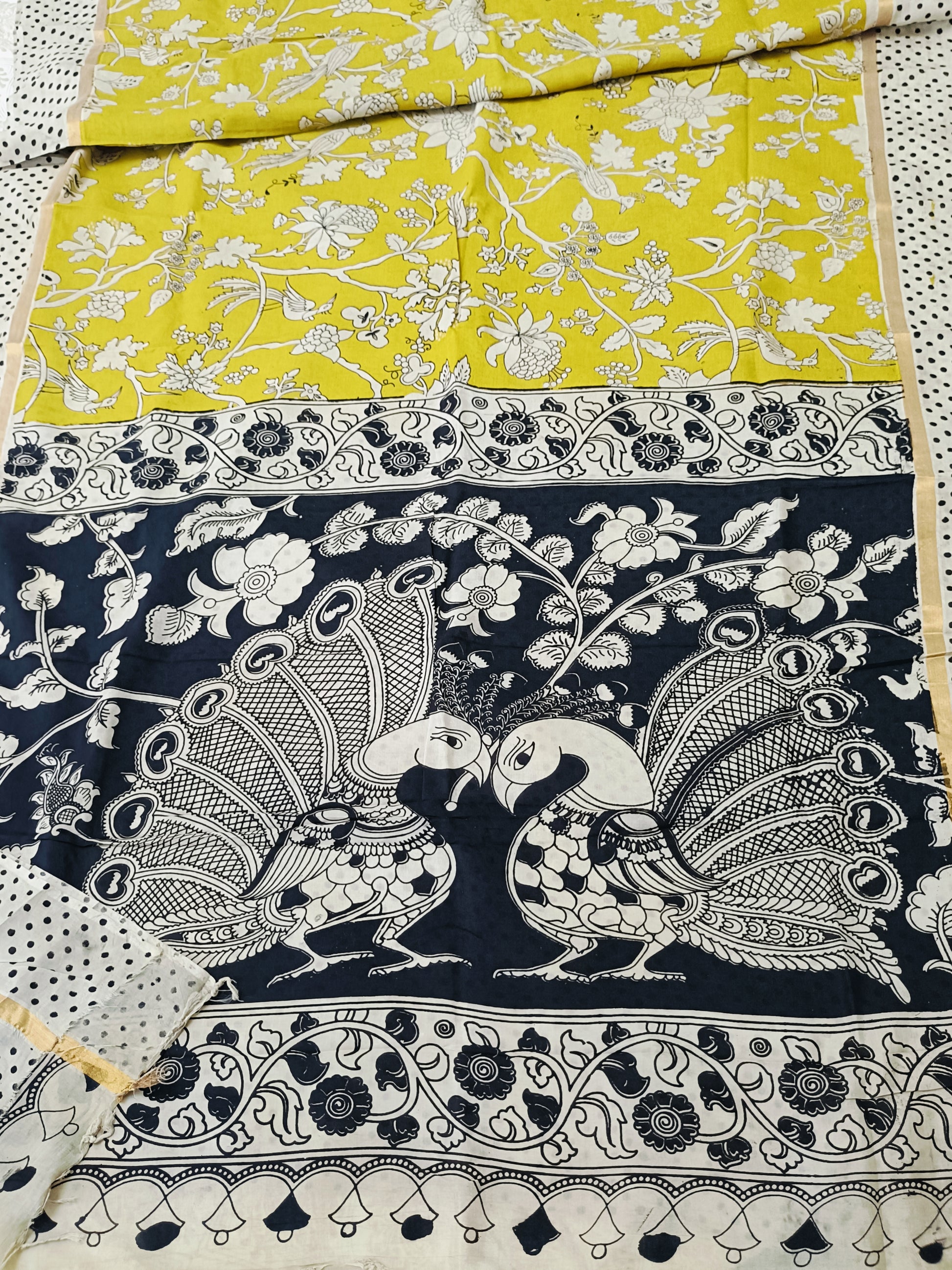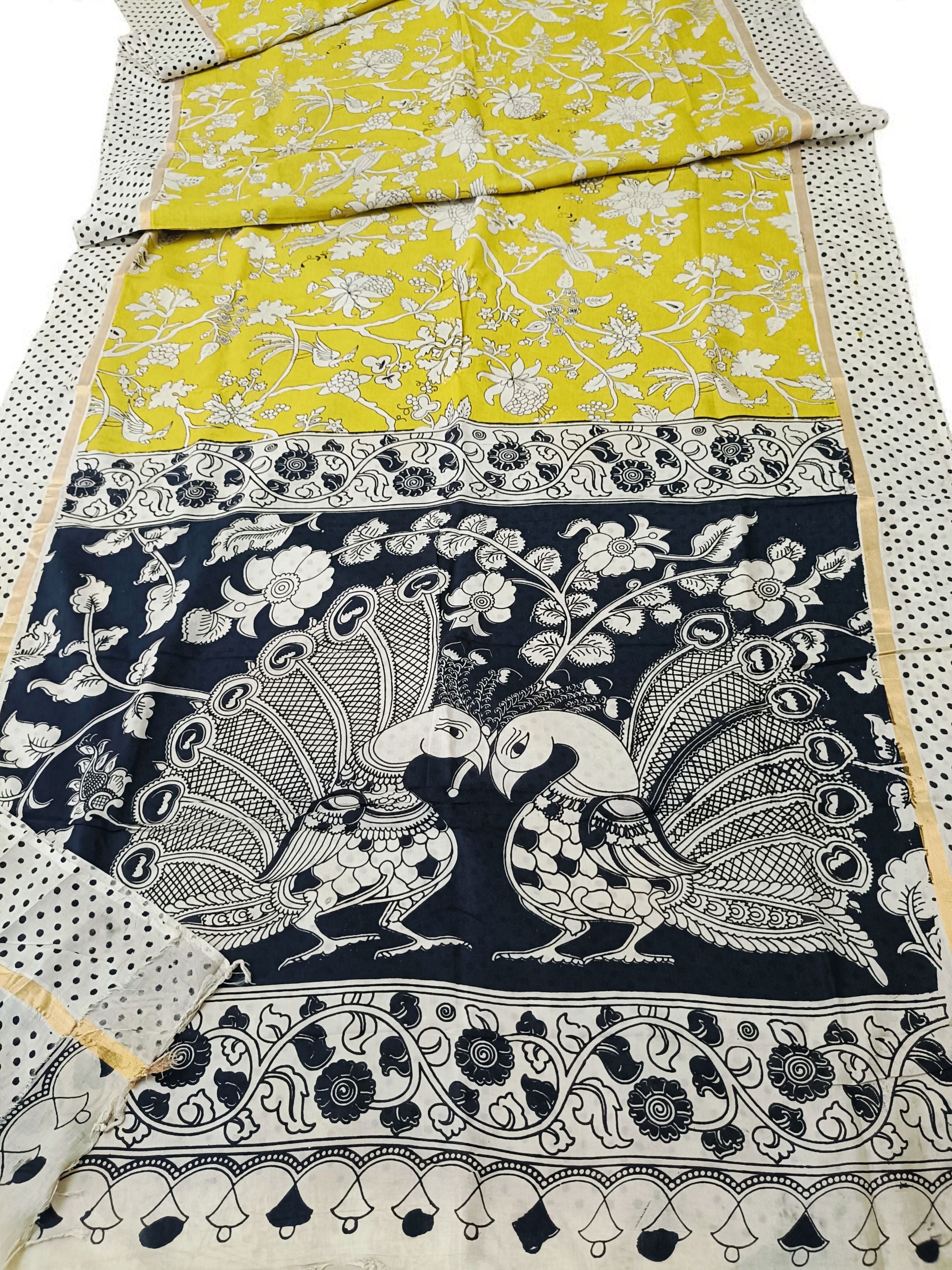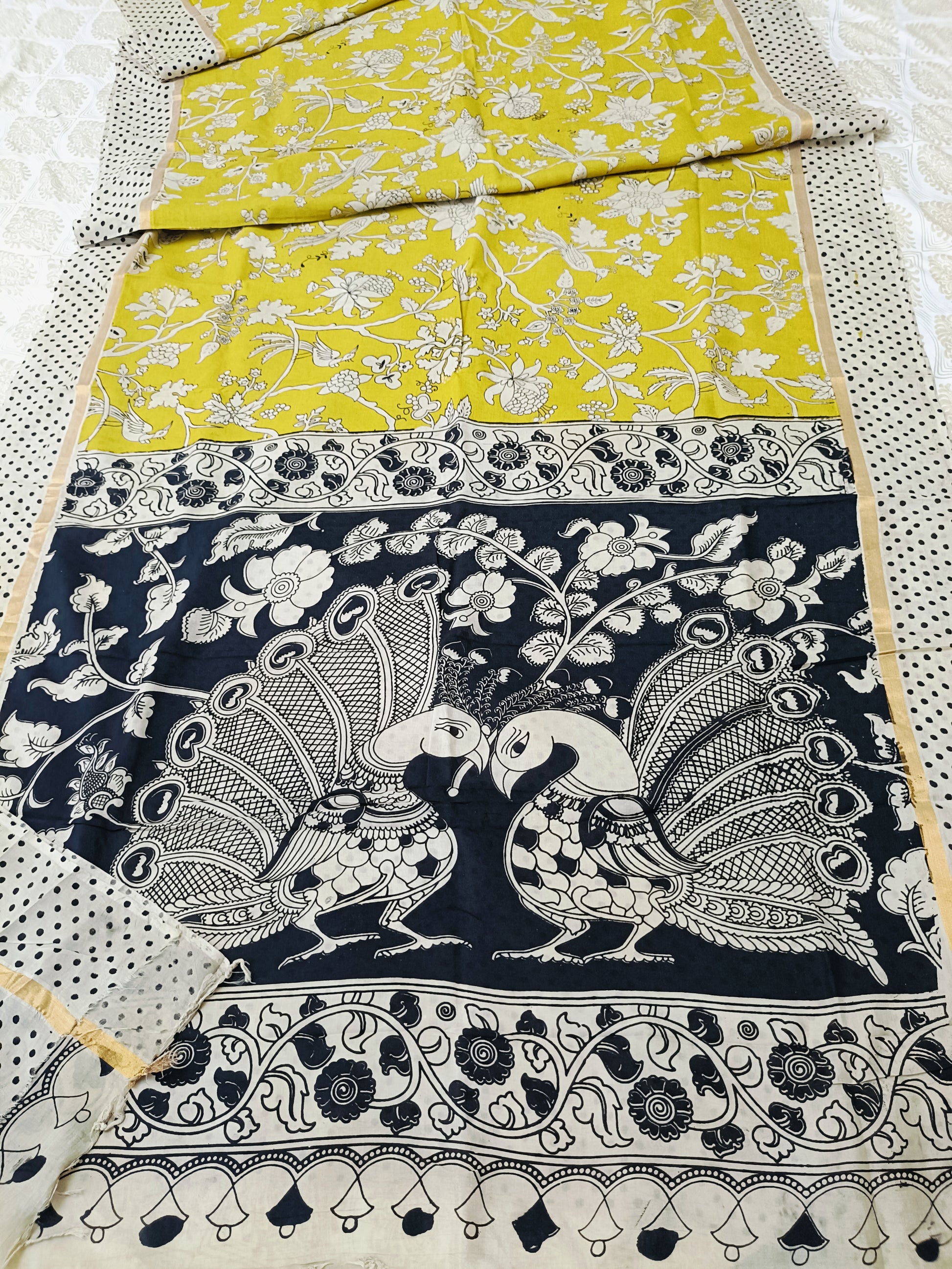 Kalamkari Prints Cotton Silk Saree with Contrast blouse.