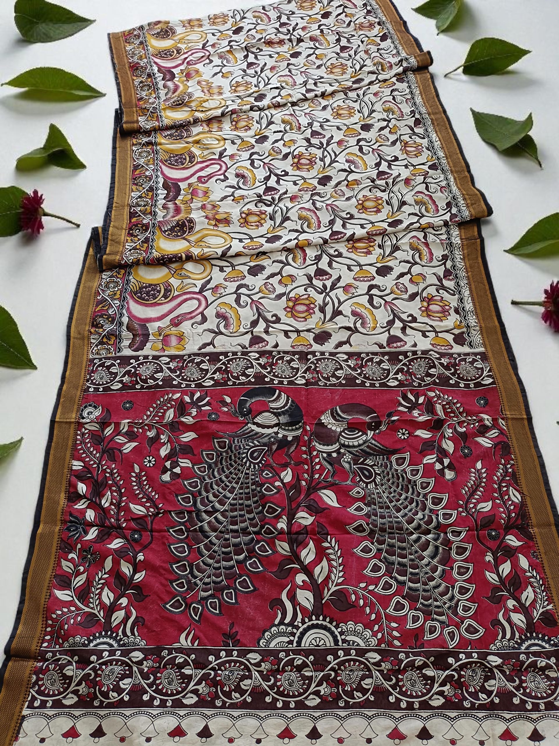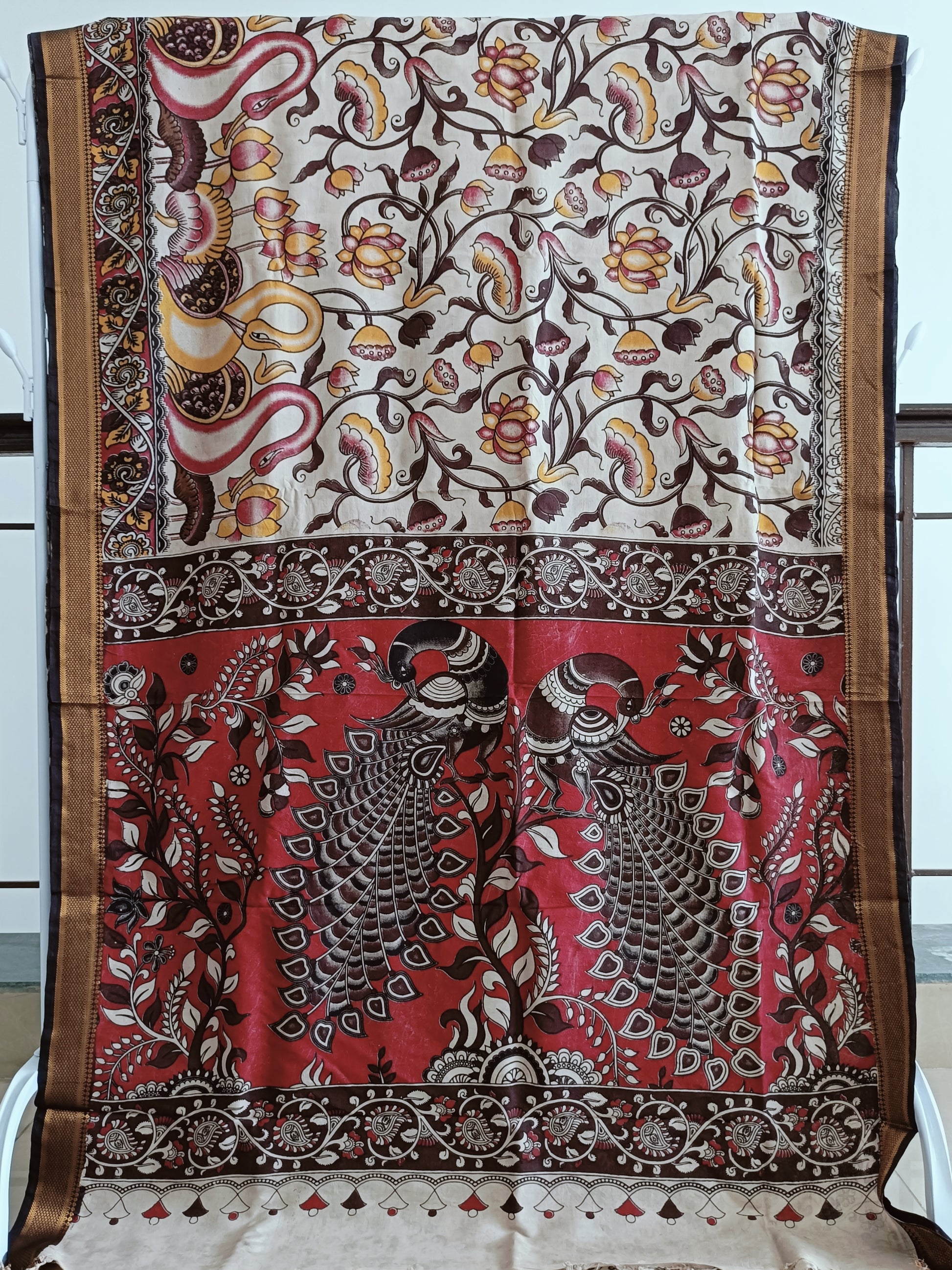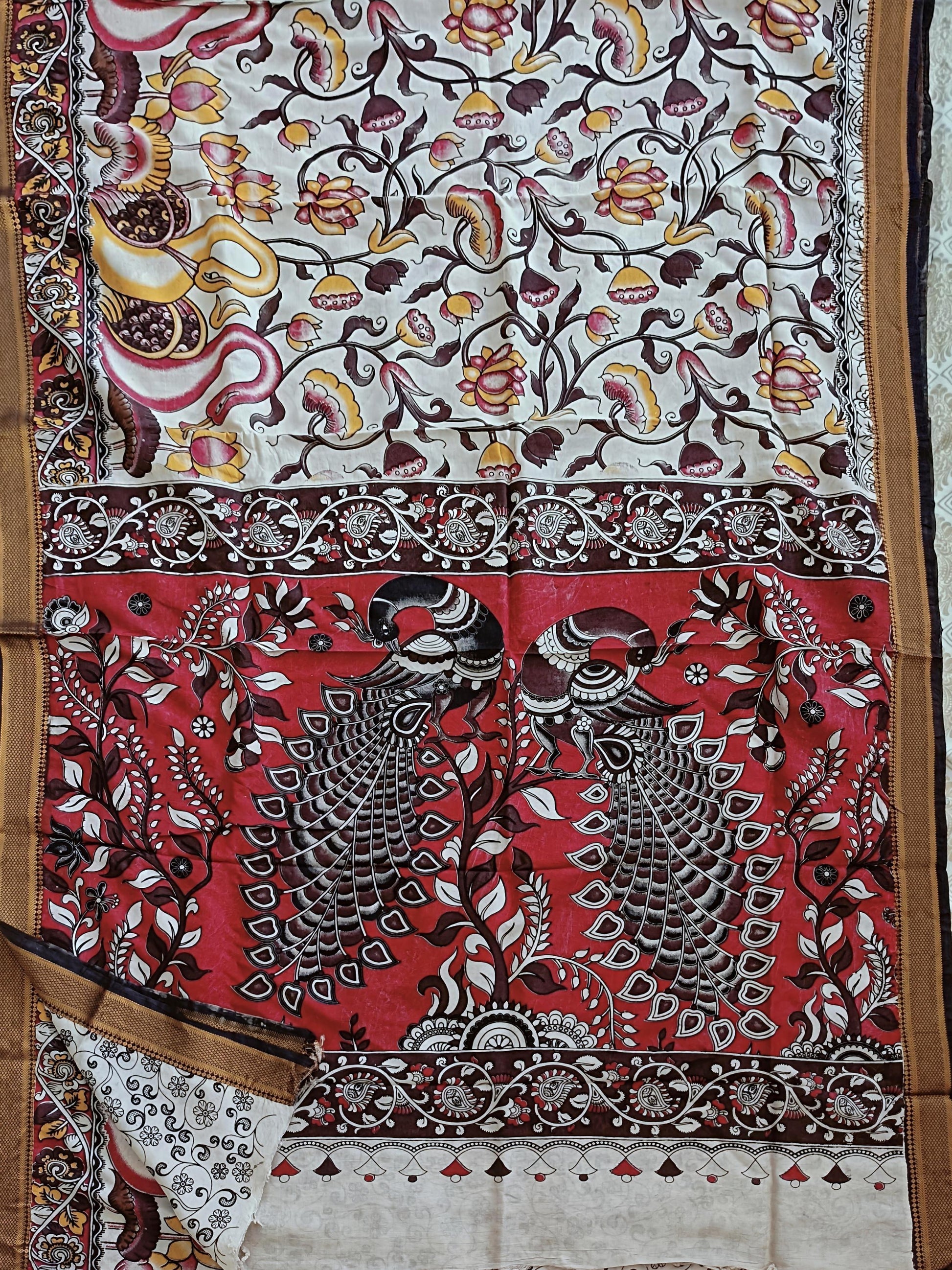Kalamkari Prints Cotton Silk Saree with Contrast blouse.
