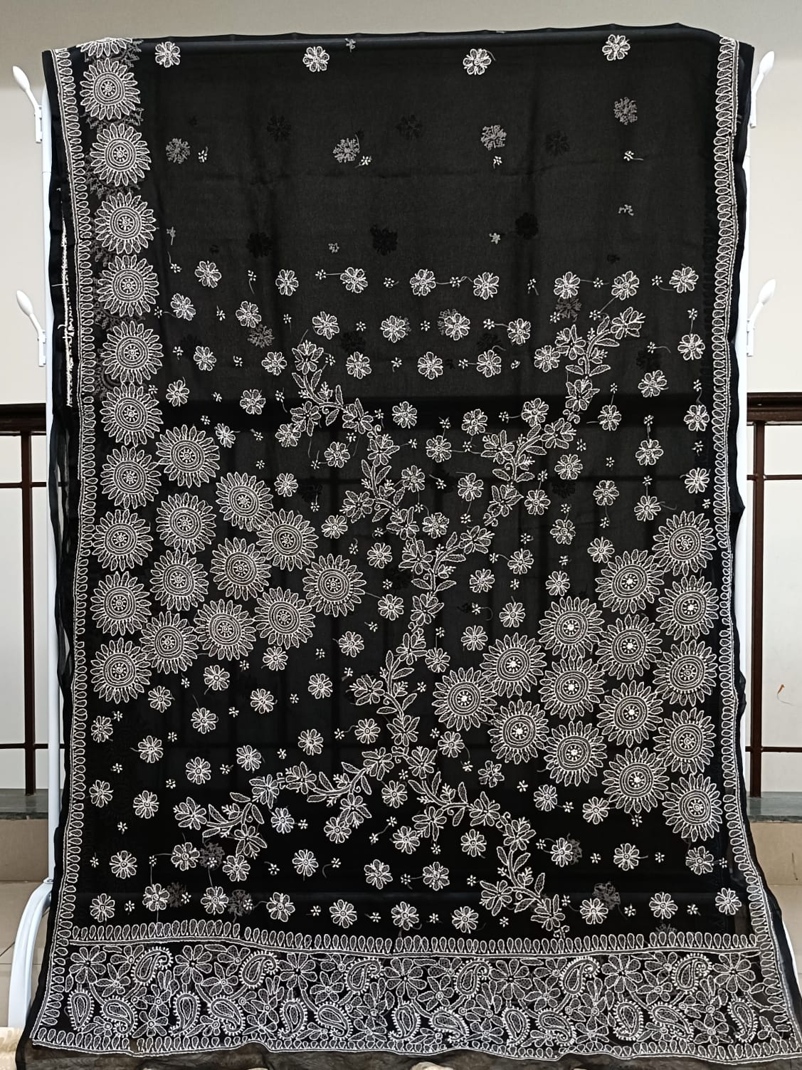 Light as air, these vibrant georgette sarees feature intricate Chikankari embroidery from Lucknow a richly adorned palla, dainty floral booties along the body & borders, and a soft pastel palette to brighten your wardrobe. Comes with a matching blouse piece (up to 80 cm). Saree width: 42".