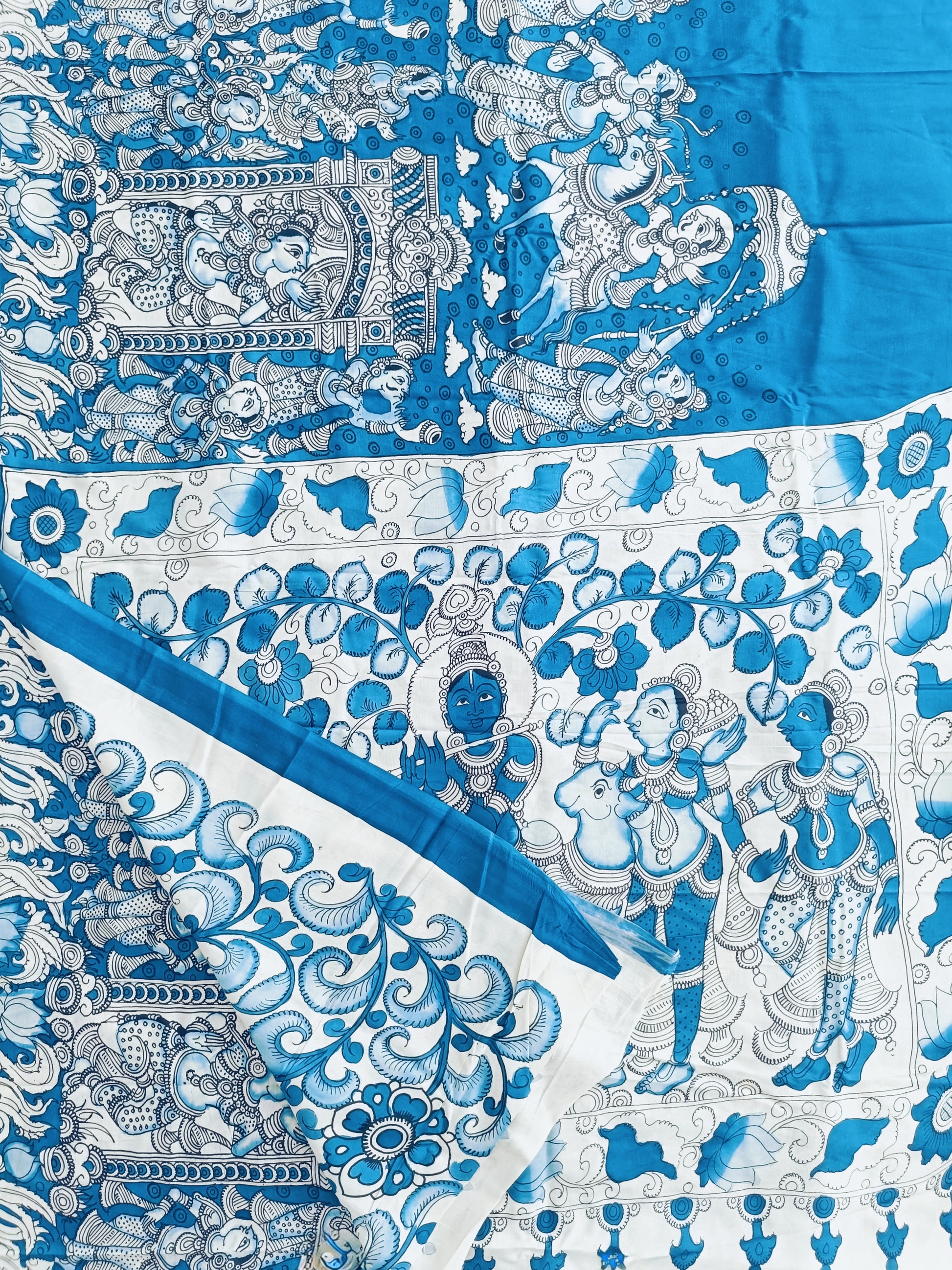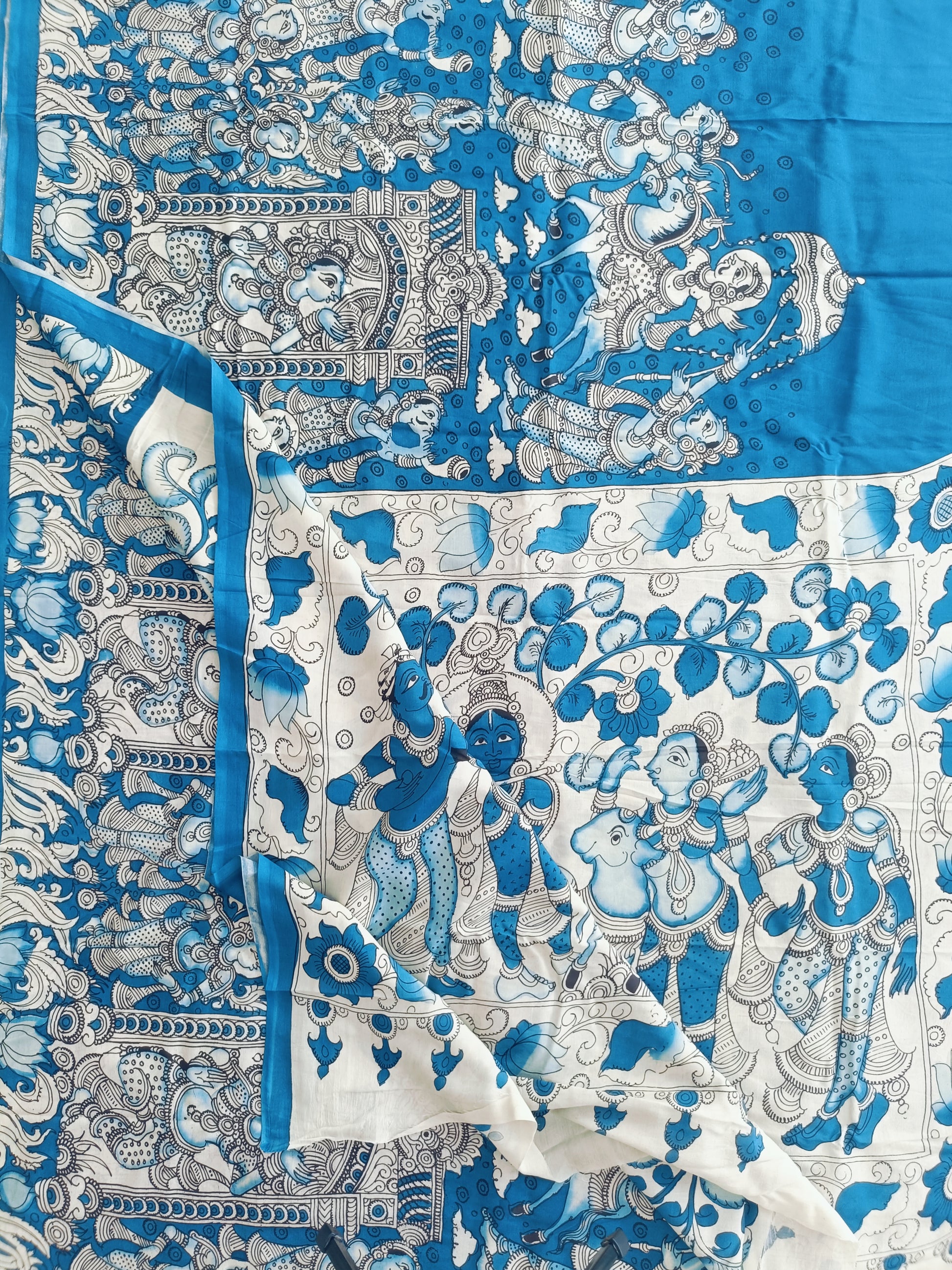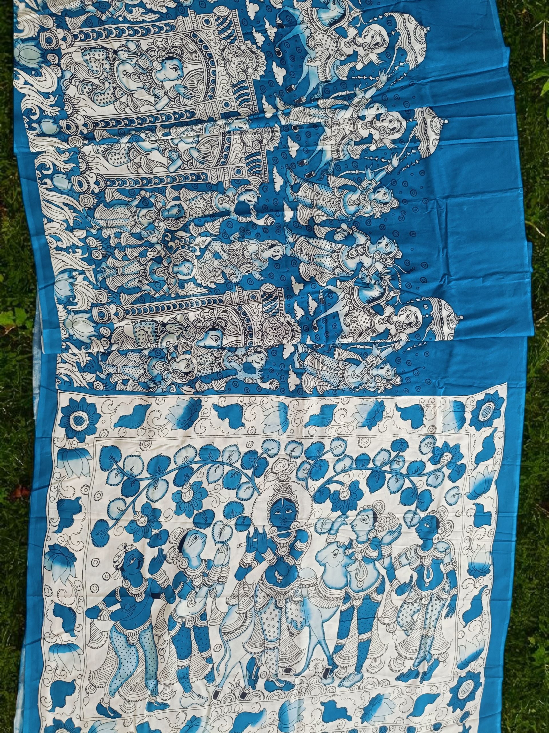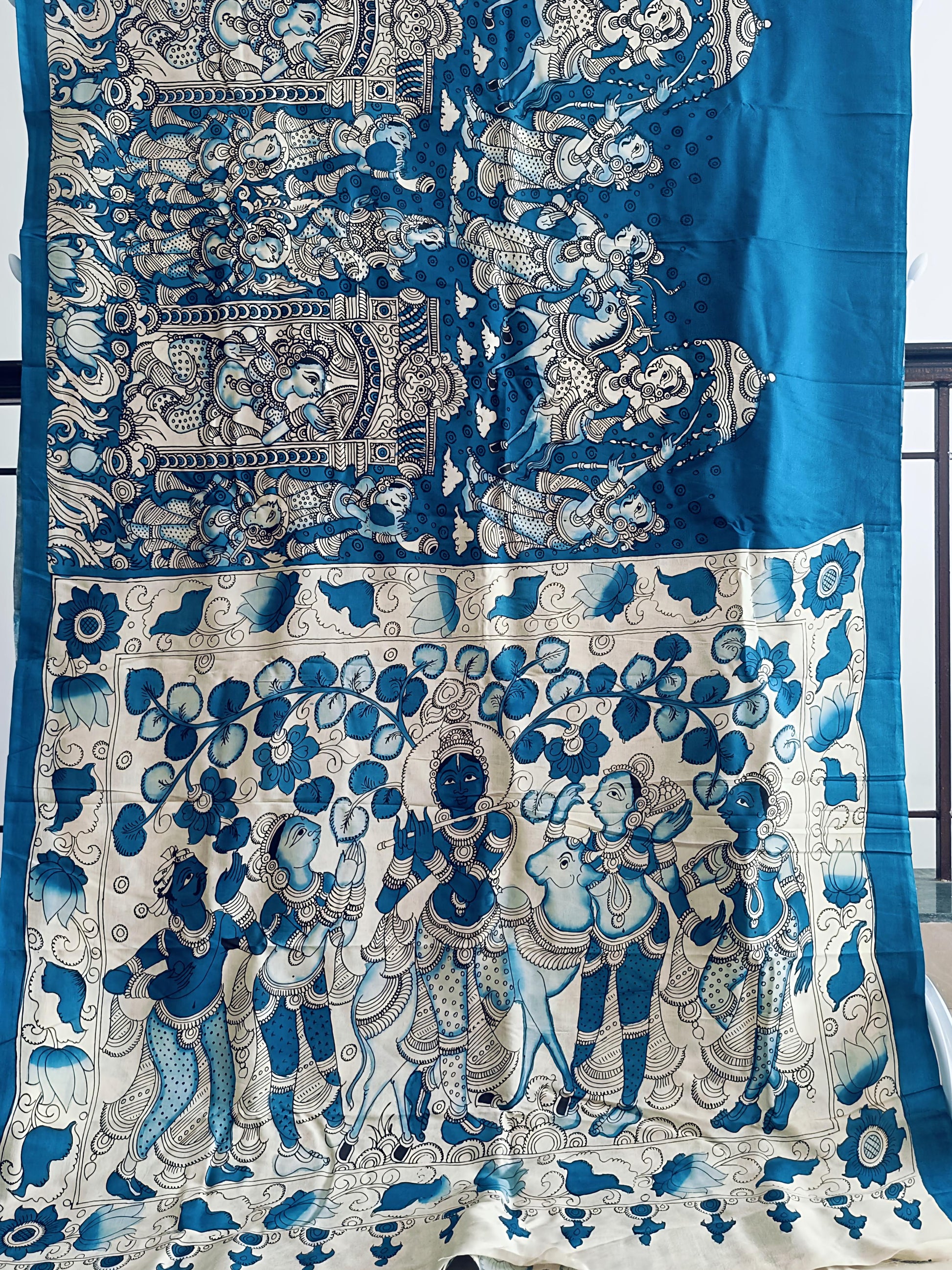 This saree in Blue pure Bangalore silk is hand-painted in Kalamkari with the theme of Krishna’s love for Radha, portrayed in a grand mythological scale. The artwork captures the divine bond of Radha and Krishna through intricate figures, motifs, and detailed brushwork, celebrating their eternal love. The rich blue base pays homage to the traditional depiction of Krishna, making the saree both symbolic and visually striking. Elegant, lustrous, and crafted with precision, it is a masterpiece for festive and special occasions.