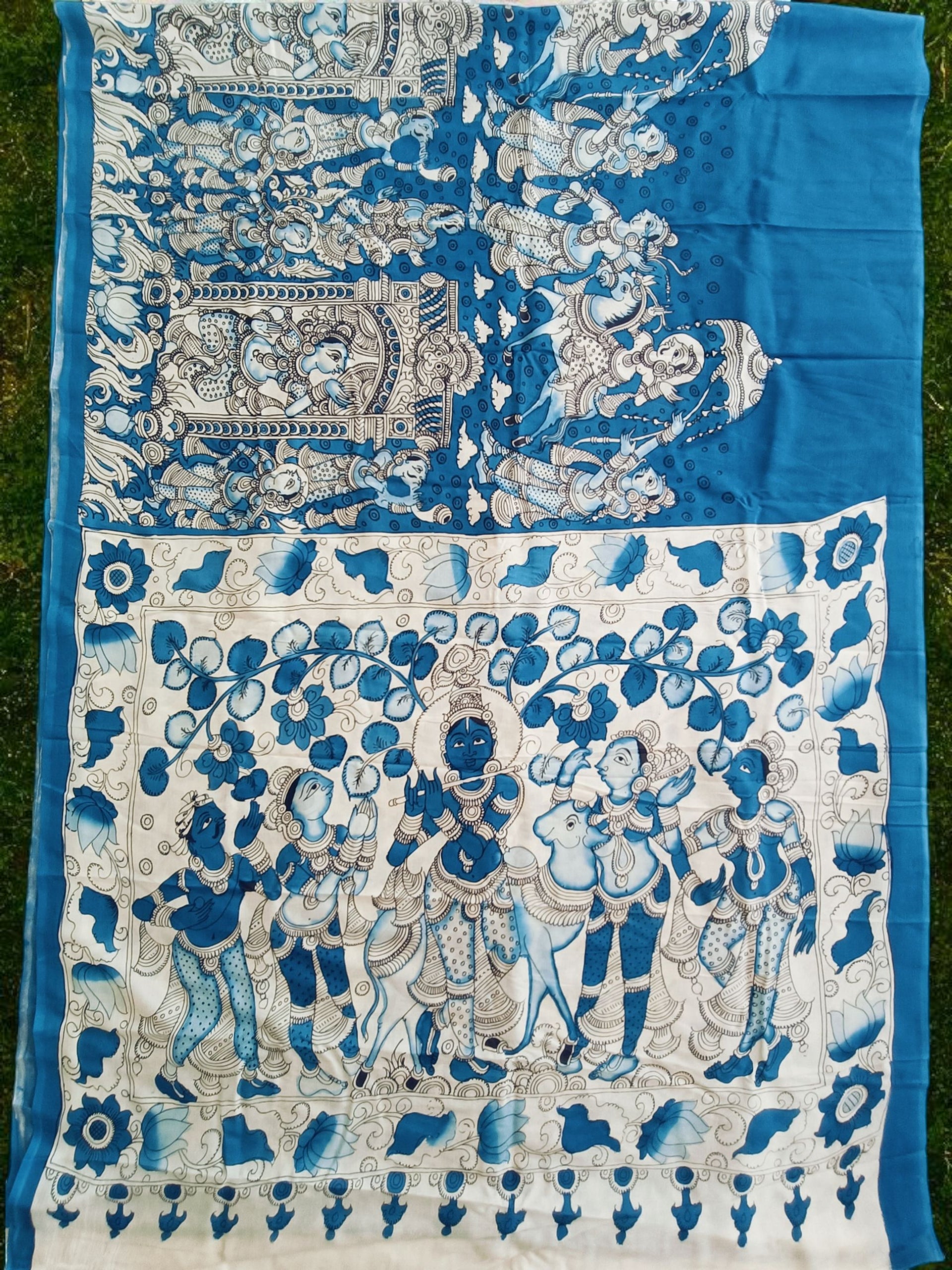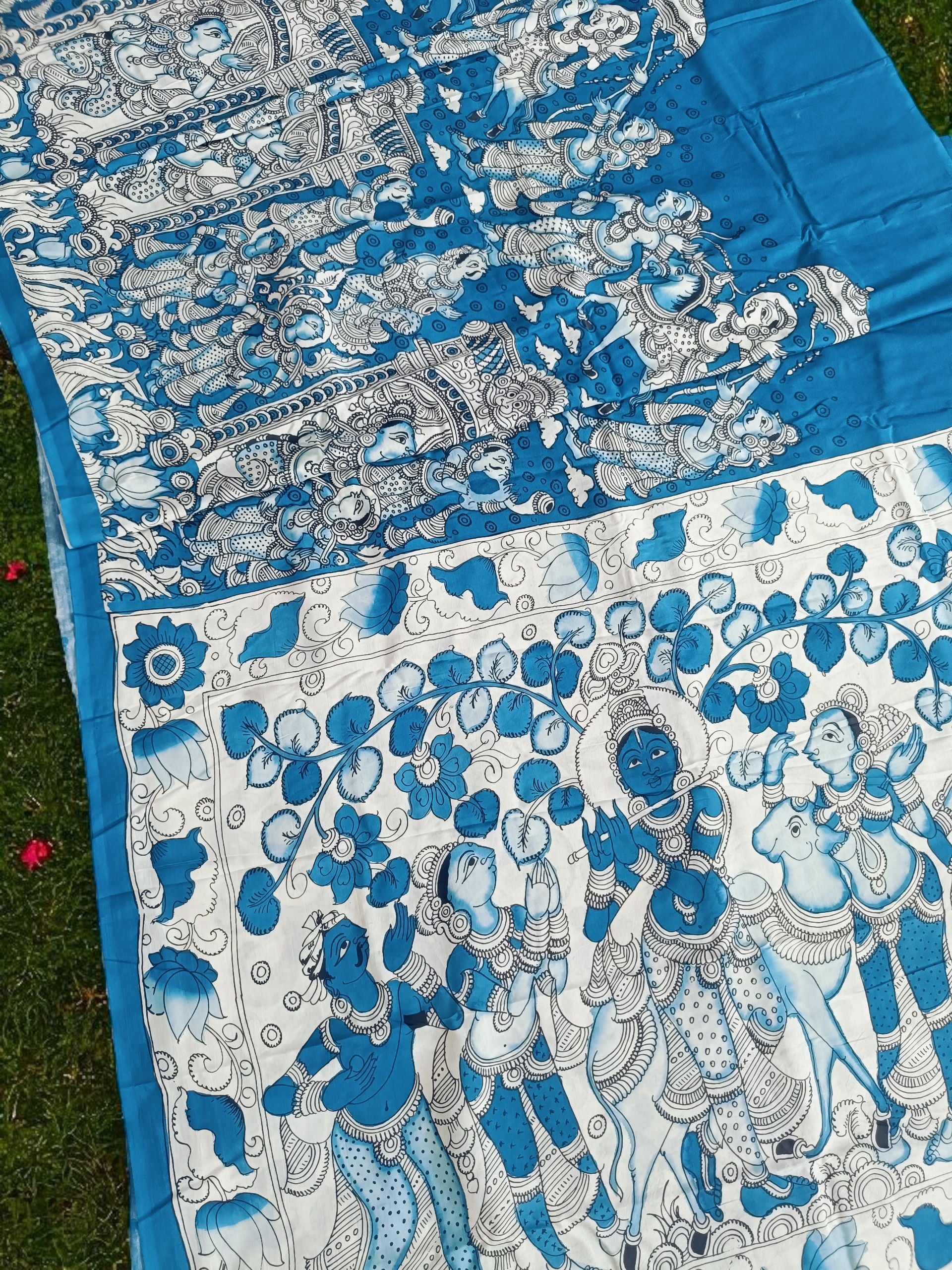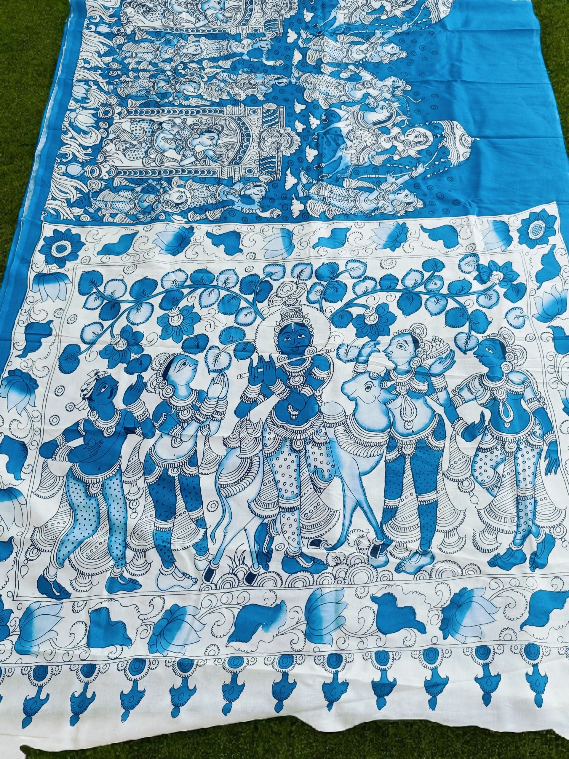 This saree in Blue pure Bangalore silk is hand-painted in Kalamkari with the theme of Krishna’s love for Radha, portrayed in a grand mythological scale. The artwork captures the divine bond of Radha and Krishna through intricate figures, motifs, and detailed brushwork, celebrating their eternal love. The rich blue base pays homage to the traditional depiction of Krishna, making the saree both symbolic and visually striking. Elegant, lustrous, and crafted with precision, it is a masterpiece for festive and special occasions.