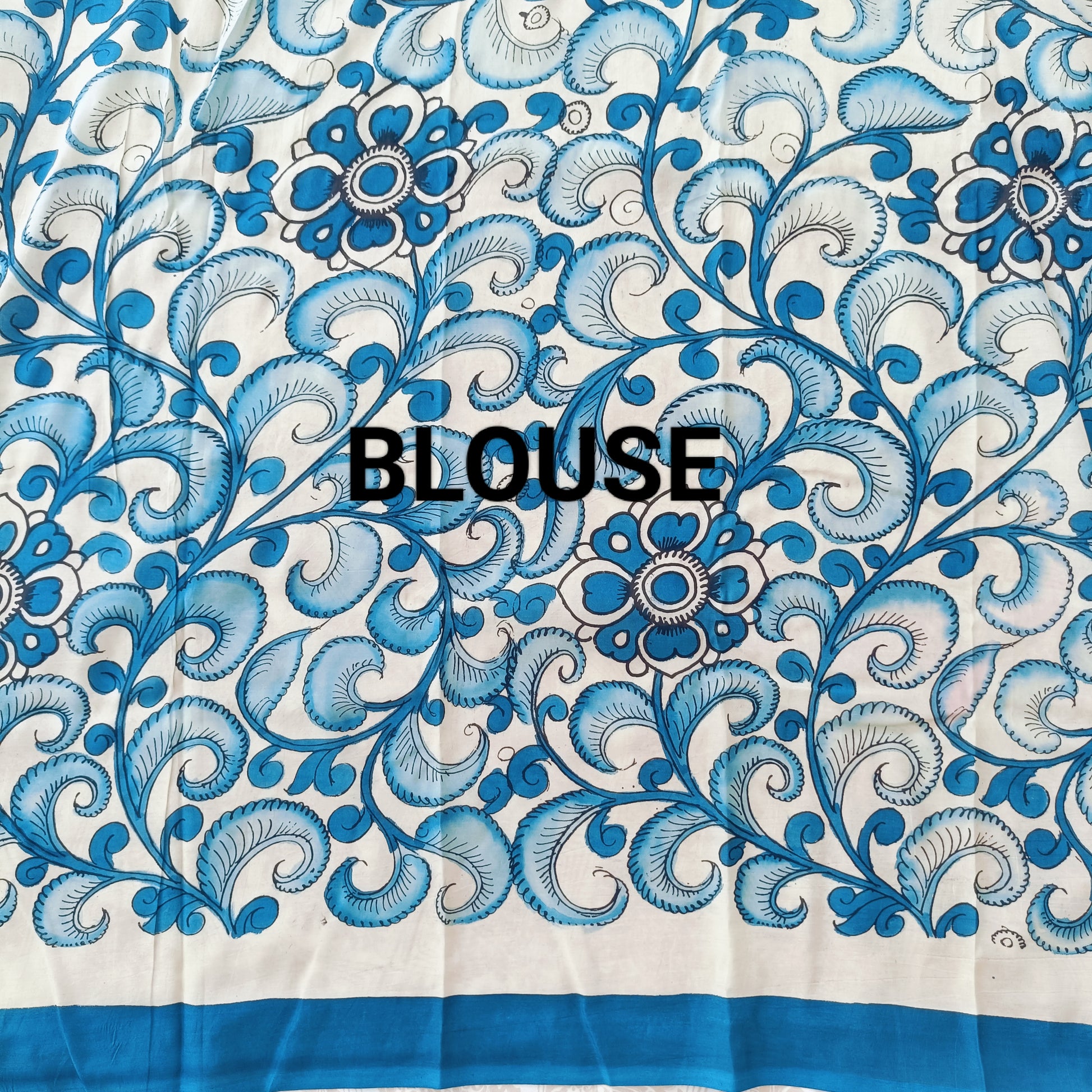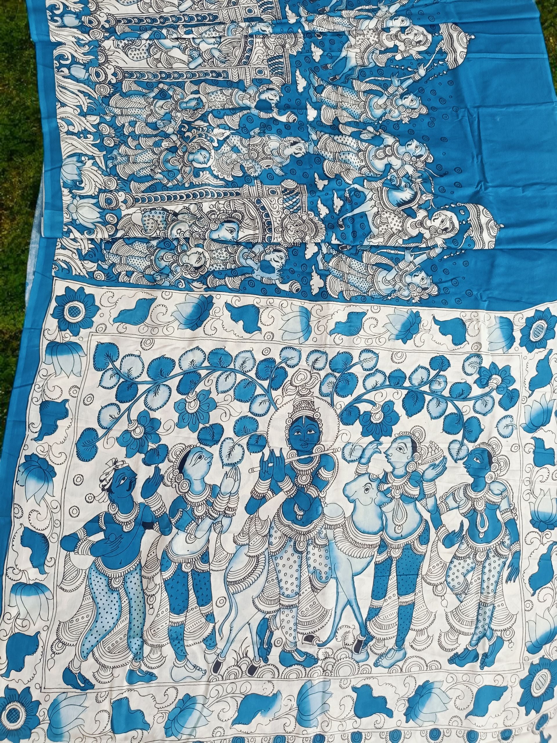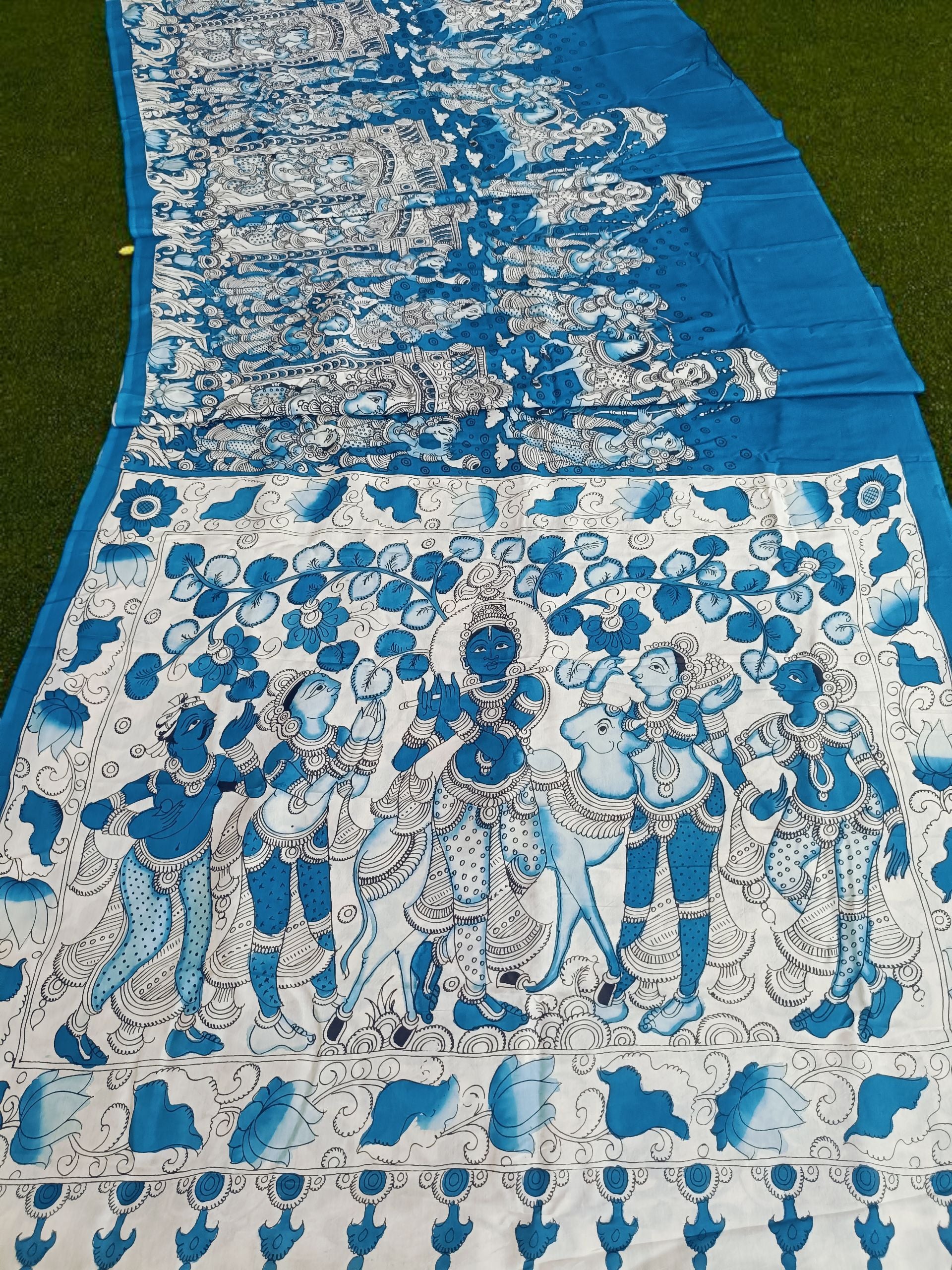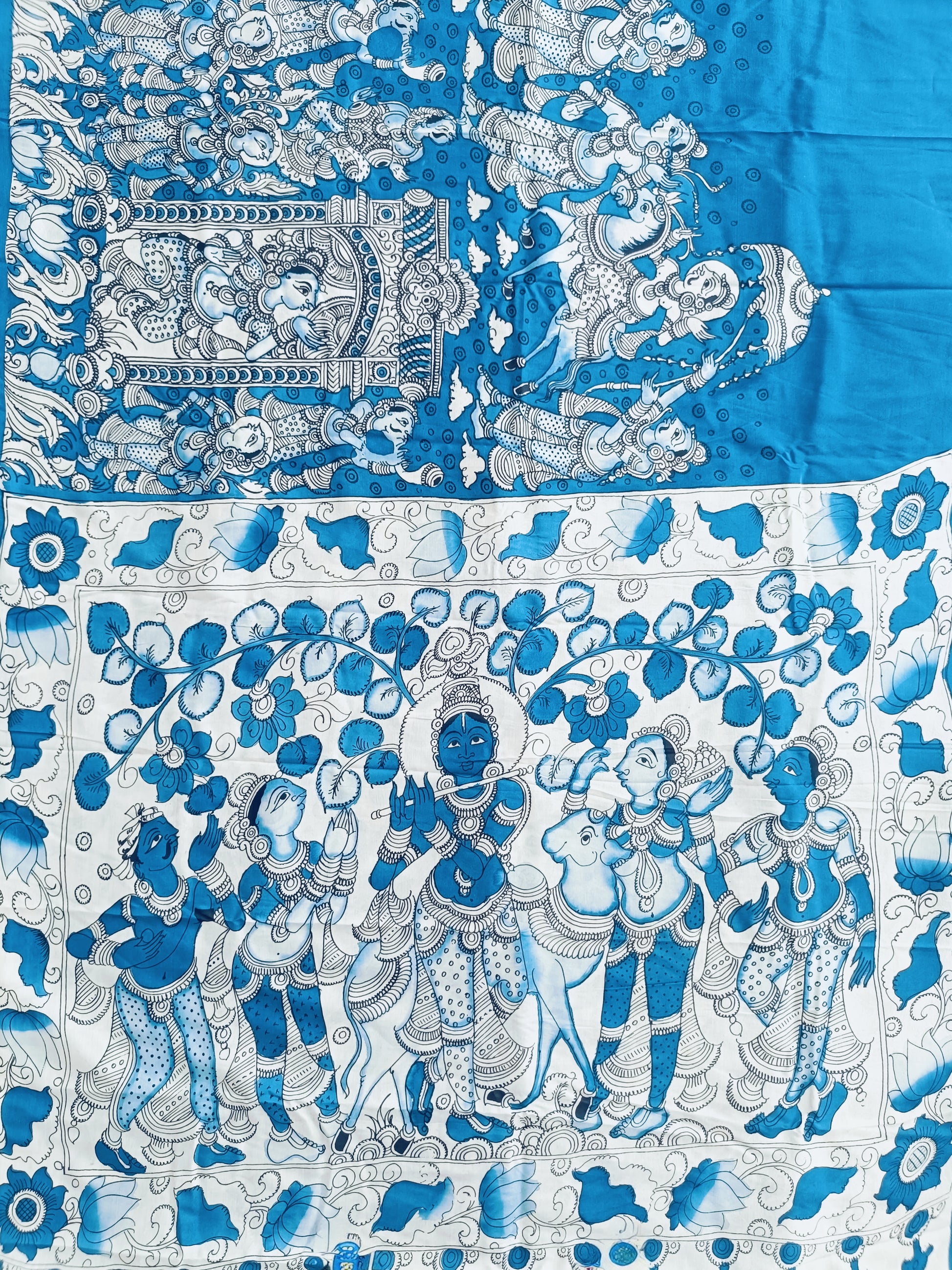 This saree in Blue pure Bangalore silk is hand-painted in Kalamkari with the theme of Krishna’s love for Radha, portrayed in a grand mythological scale. The artwork captures the divine bond of Radha and Krishna through intricate figures, motifs, and detailed brushwork, celebrating their eternal love. The rich blue base pays homage to the traditional depiction of Krishna, making the saree both symbolic and visually striking. Elegant, lustrous, and crafted with precision, it is a masterpiece for festive and special occasions.