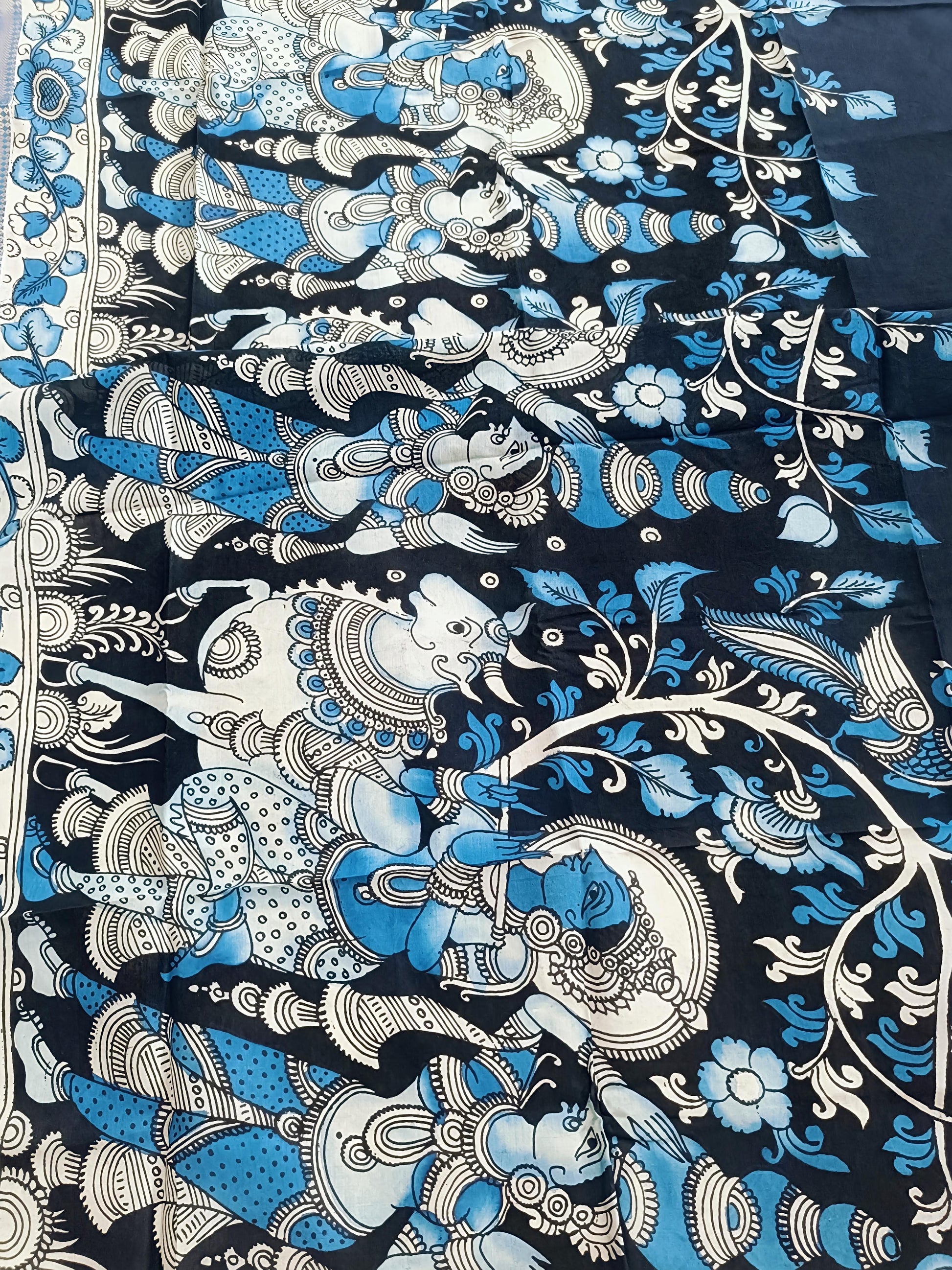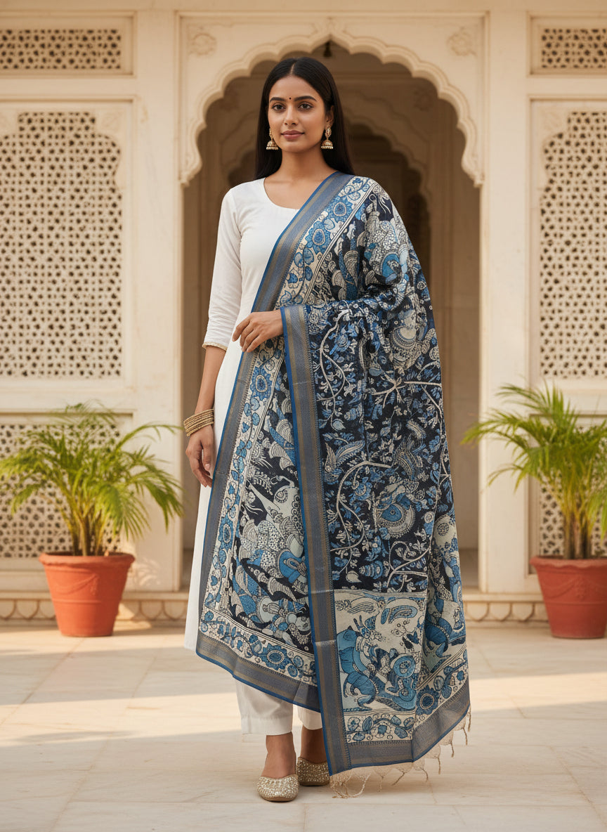 Kalamkari Hand-Painted Dupatta in Mangalagiri Pure Silk. It has a Zari border and soft tassel ends. Dimensions: 36" wide and 2.5 meters long.