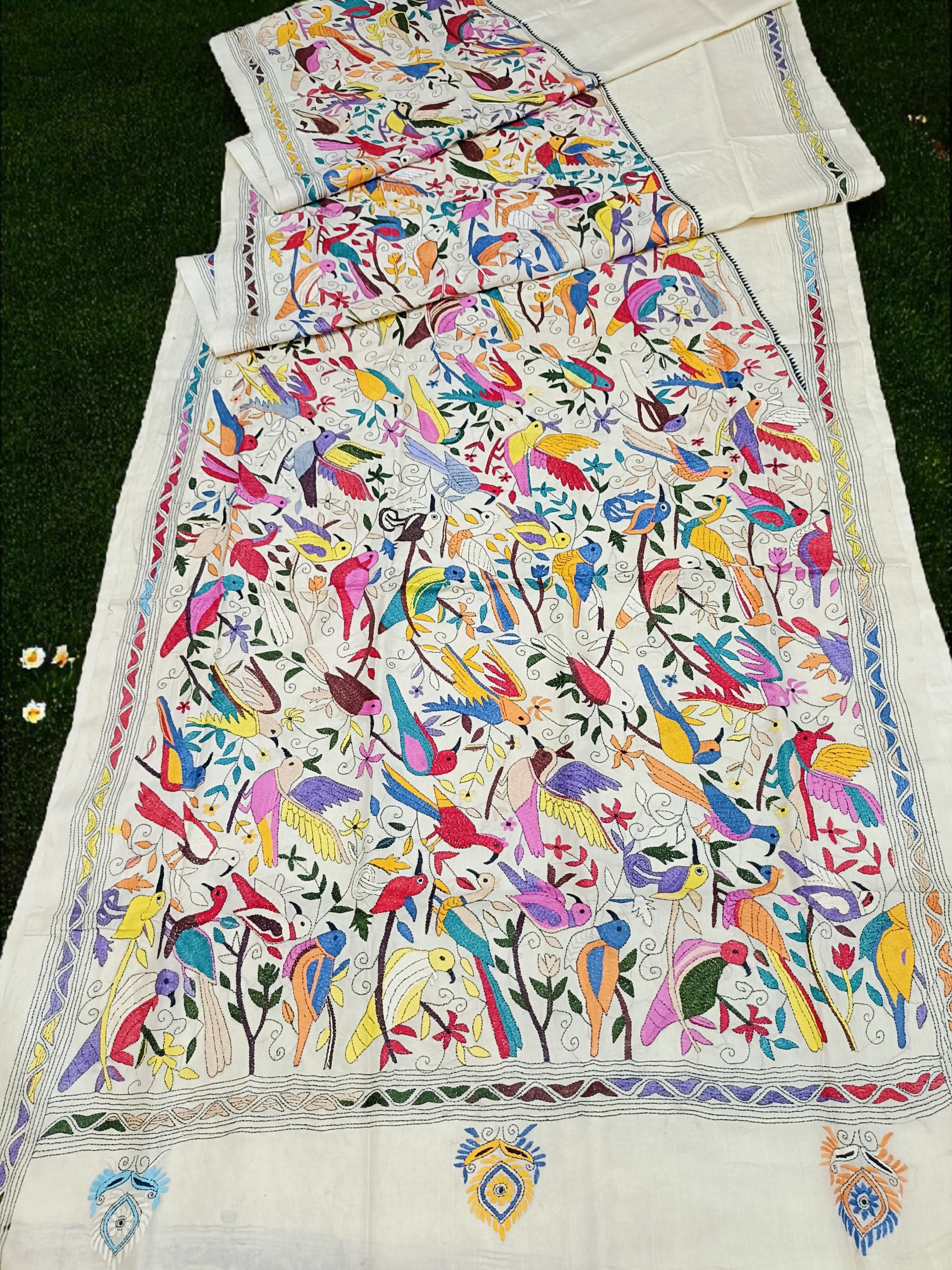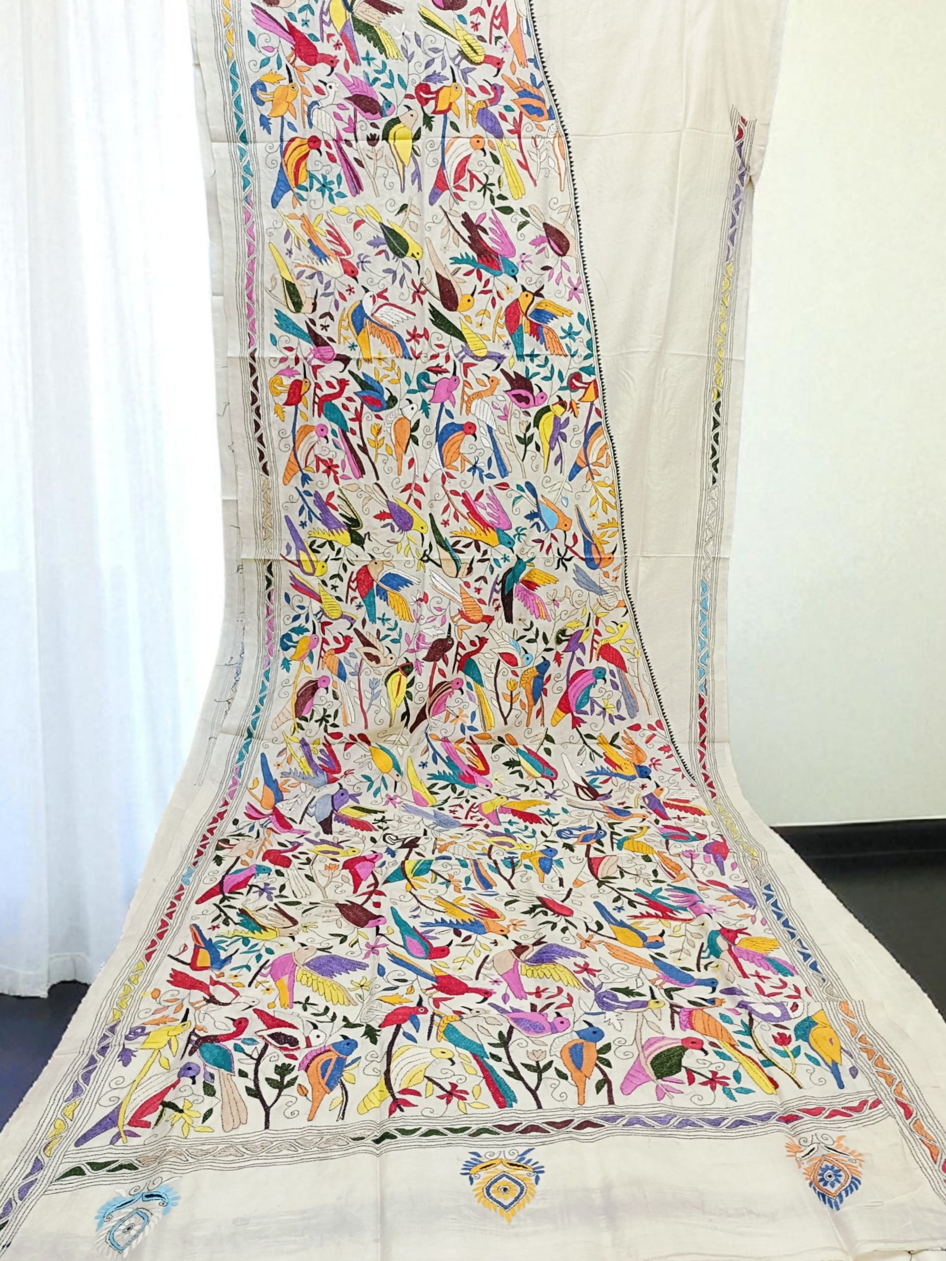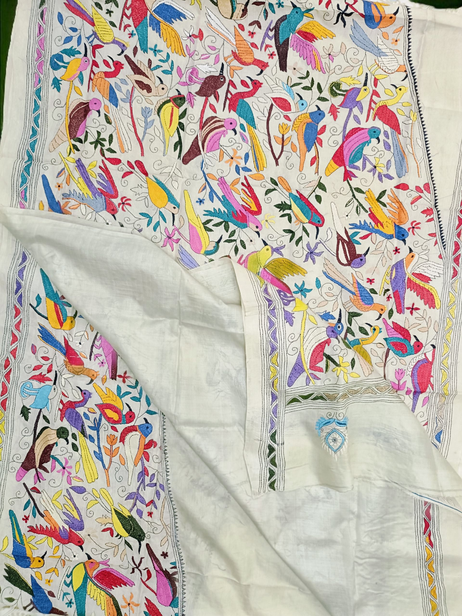 She stepped into the morning light, her saree glowing in the soft hue of Ivory Dawn. From the pleats upward, a flock of vibrant birds seemed to take flight—stitched in a chorus of colors, each wing beating in perfect rhythm. The embroidery grew denser with every fold, until the pallu bloomed into a sky alive with birds, Kantha threads turning silk into a living sanctuary.