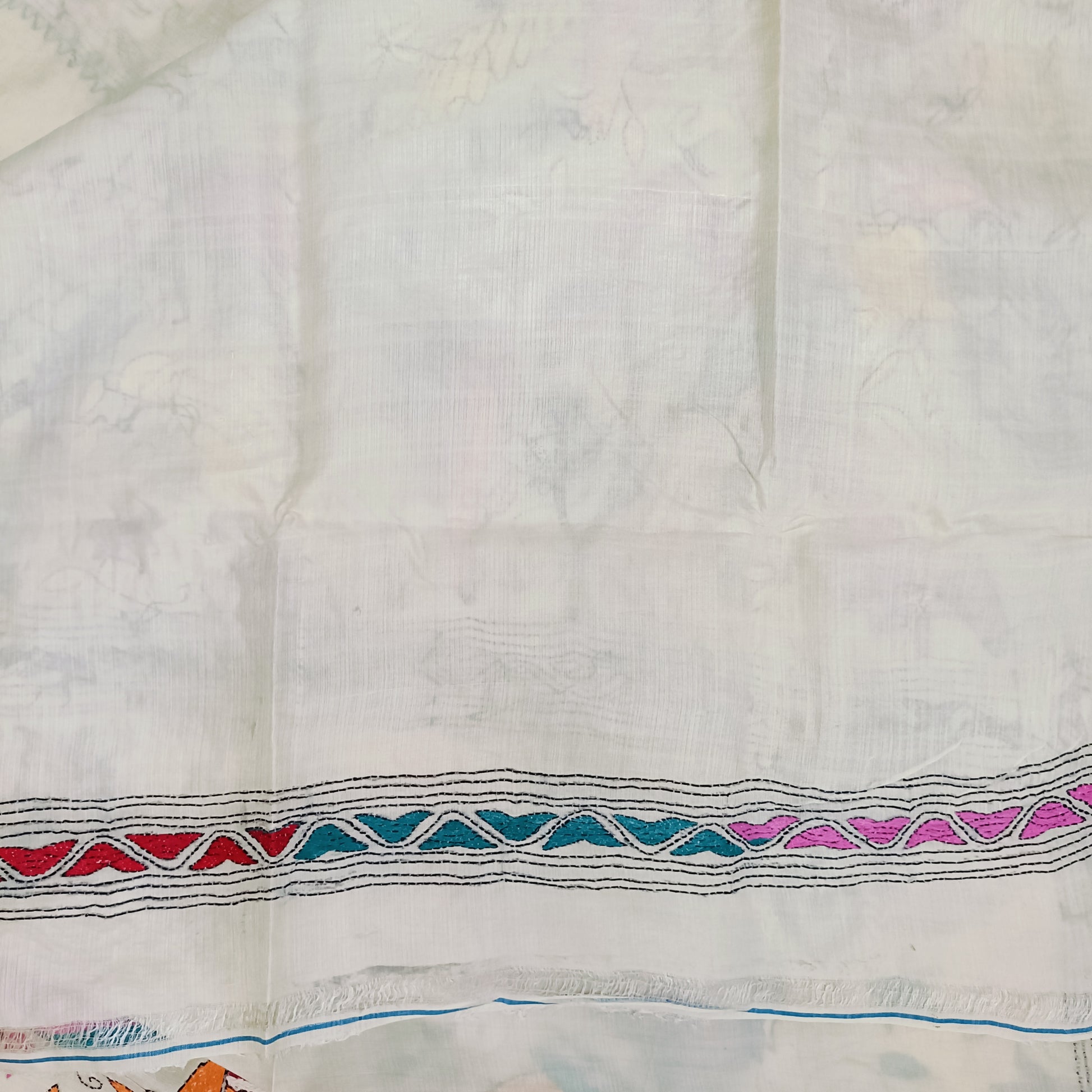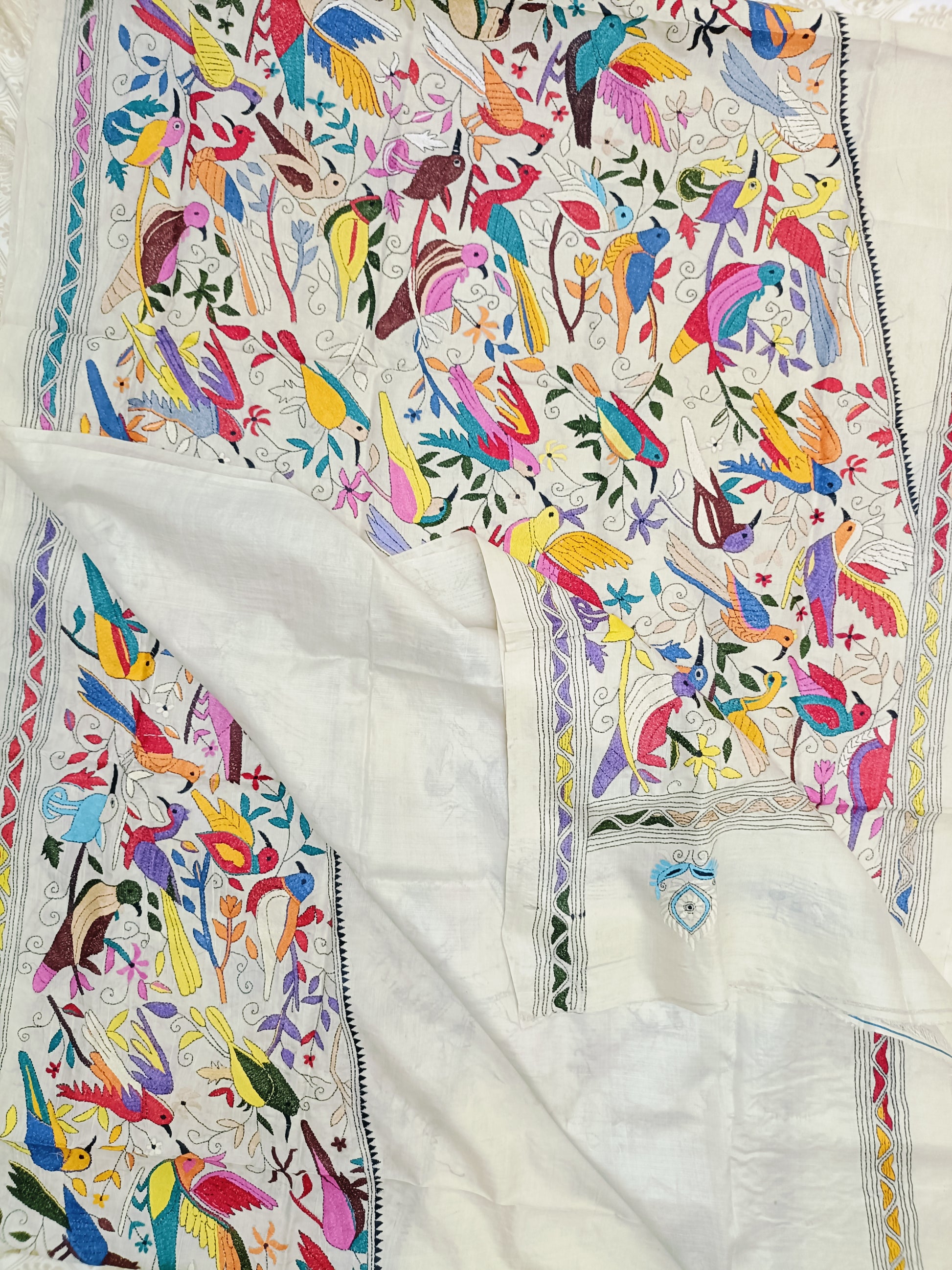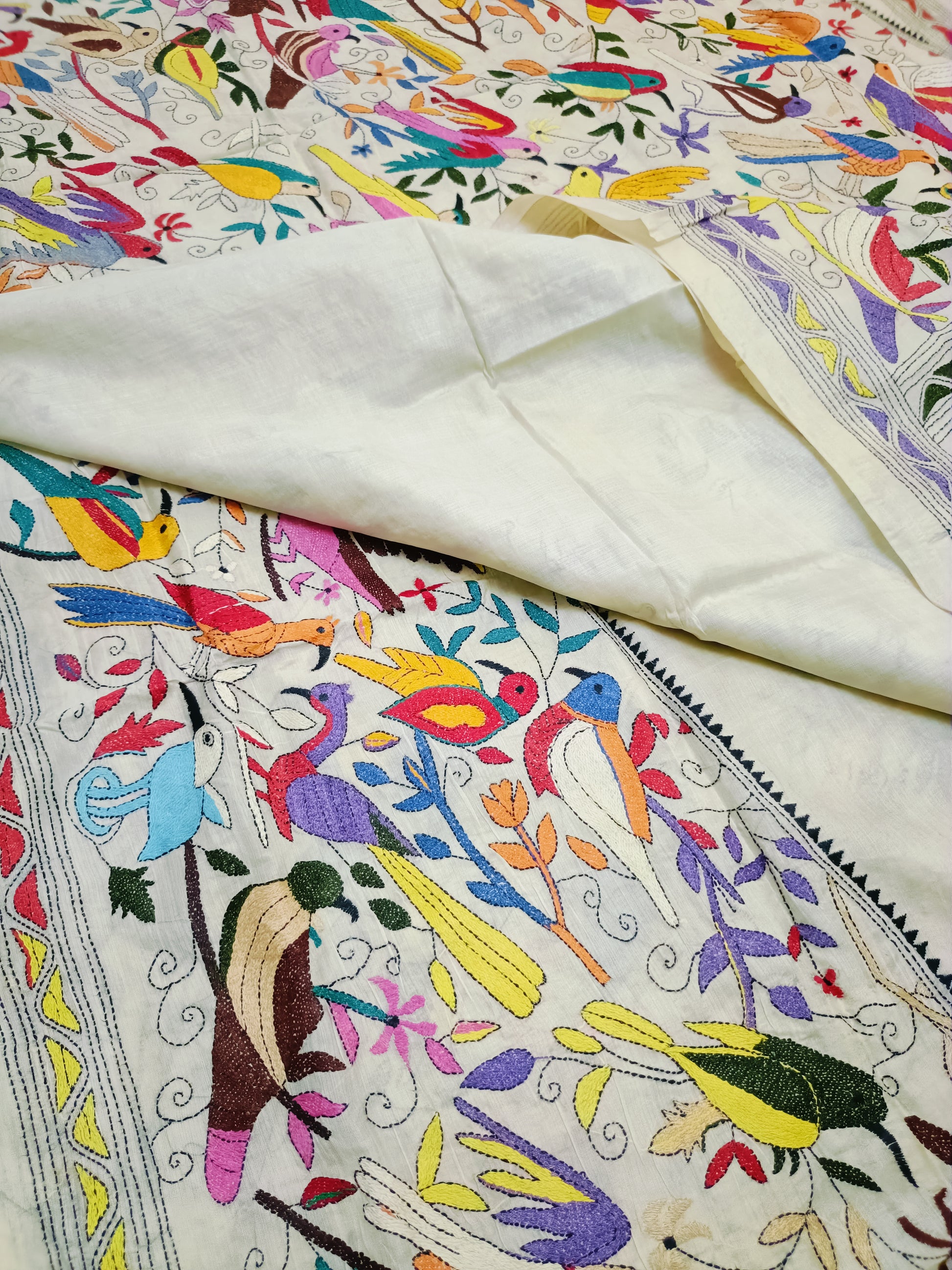 She stepped into the morning light, her saree glowing in the soft hue of Ivory Dawn. From the pleats upward, a flock of vibrant birds seemed to take flight—stitched in a chorus of colors, each wing beating in perfect rhythm. The embroidery grew denser with every fold, until the pallu bloomed into a sky alive with birds, Kantha threads turning silk into a living sanctuary.
