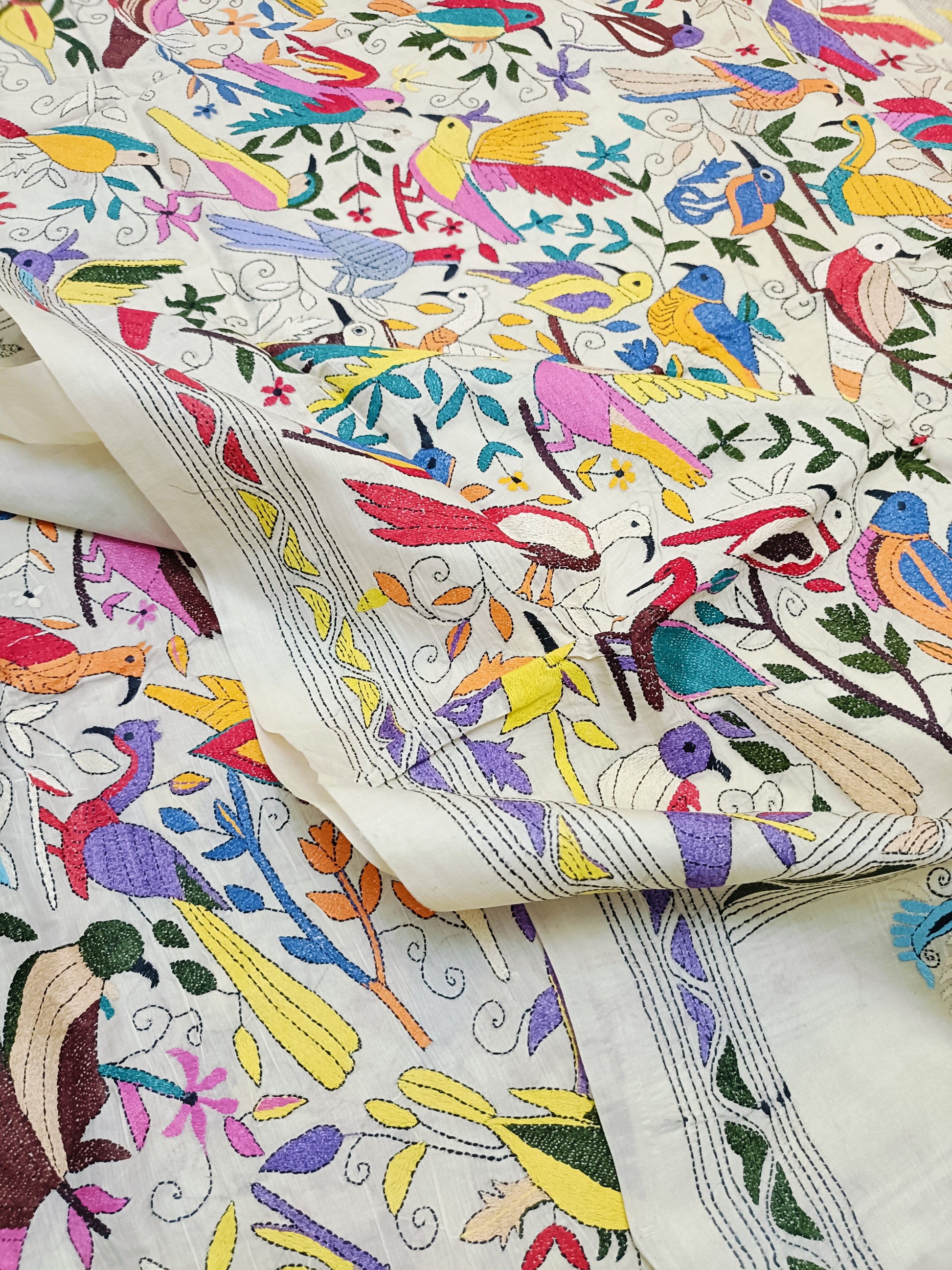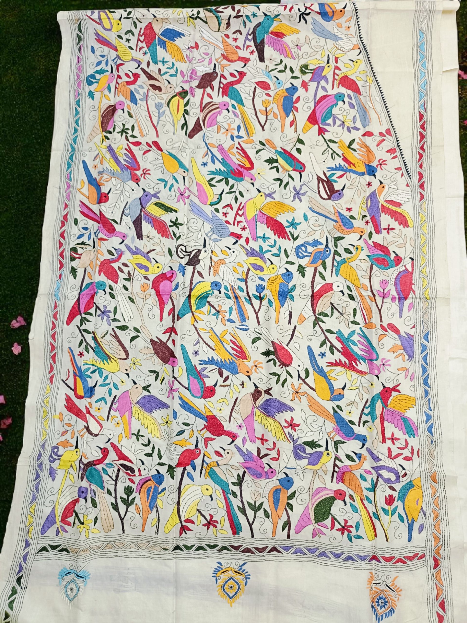 All-over Paakhi (bird) motifs in colorful Kantha stitch