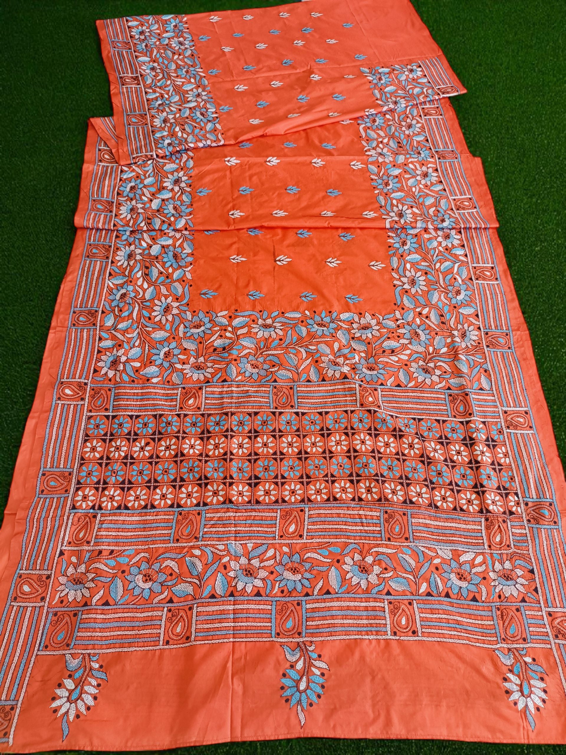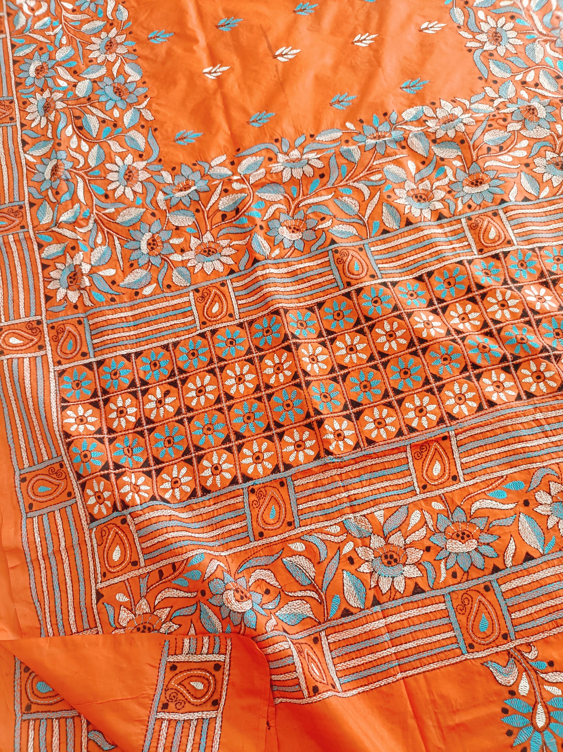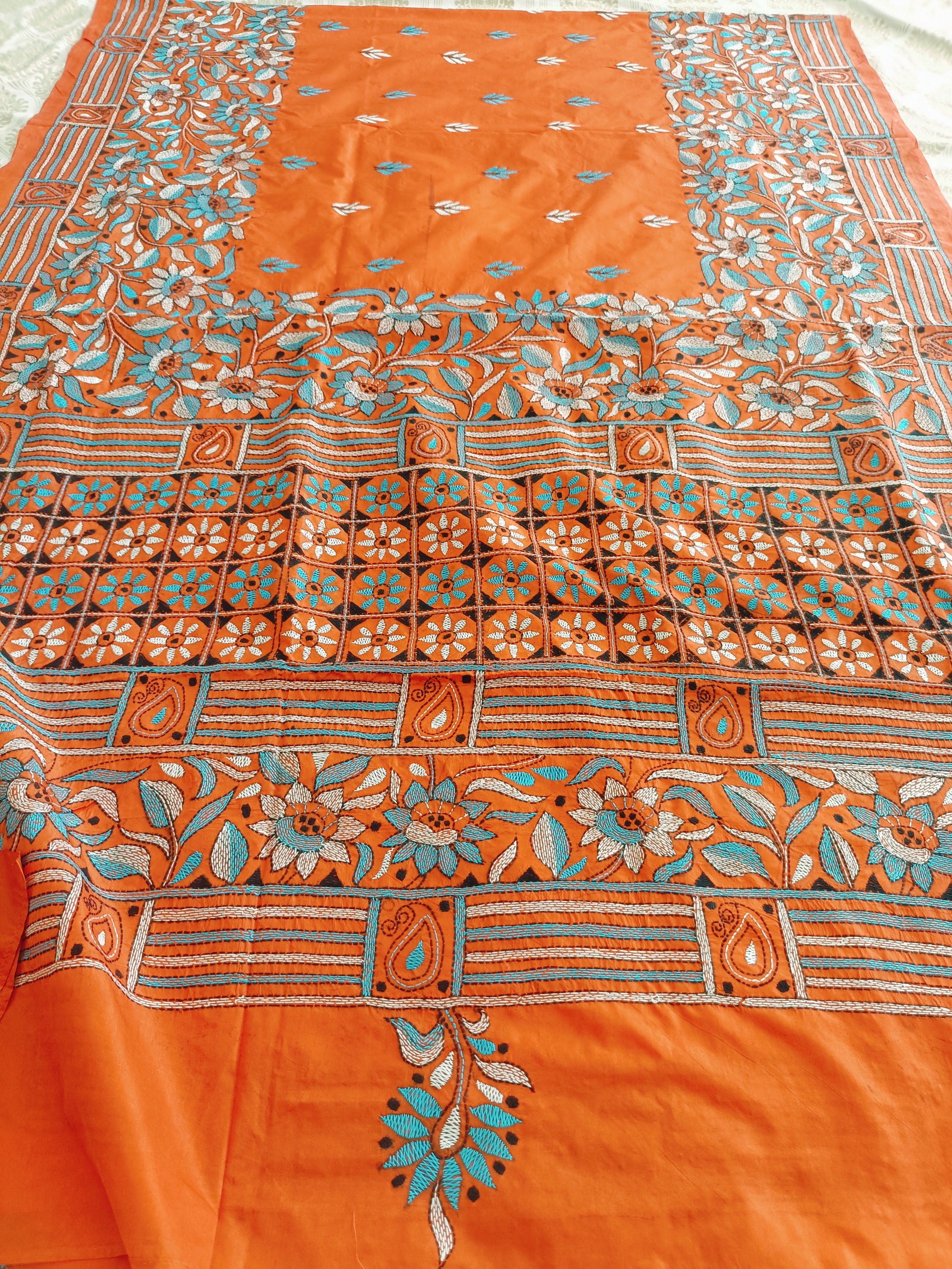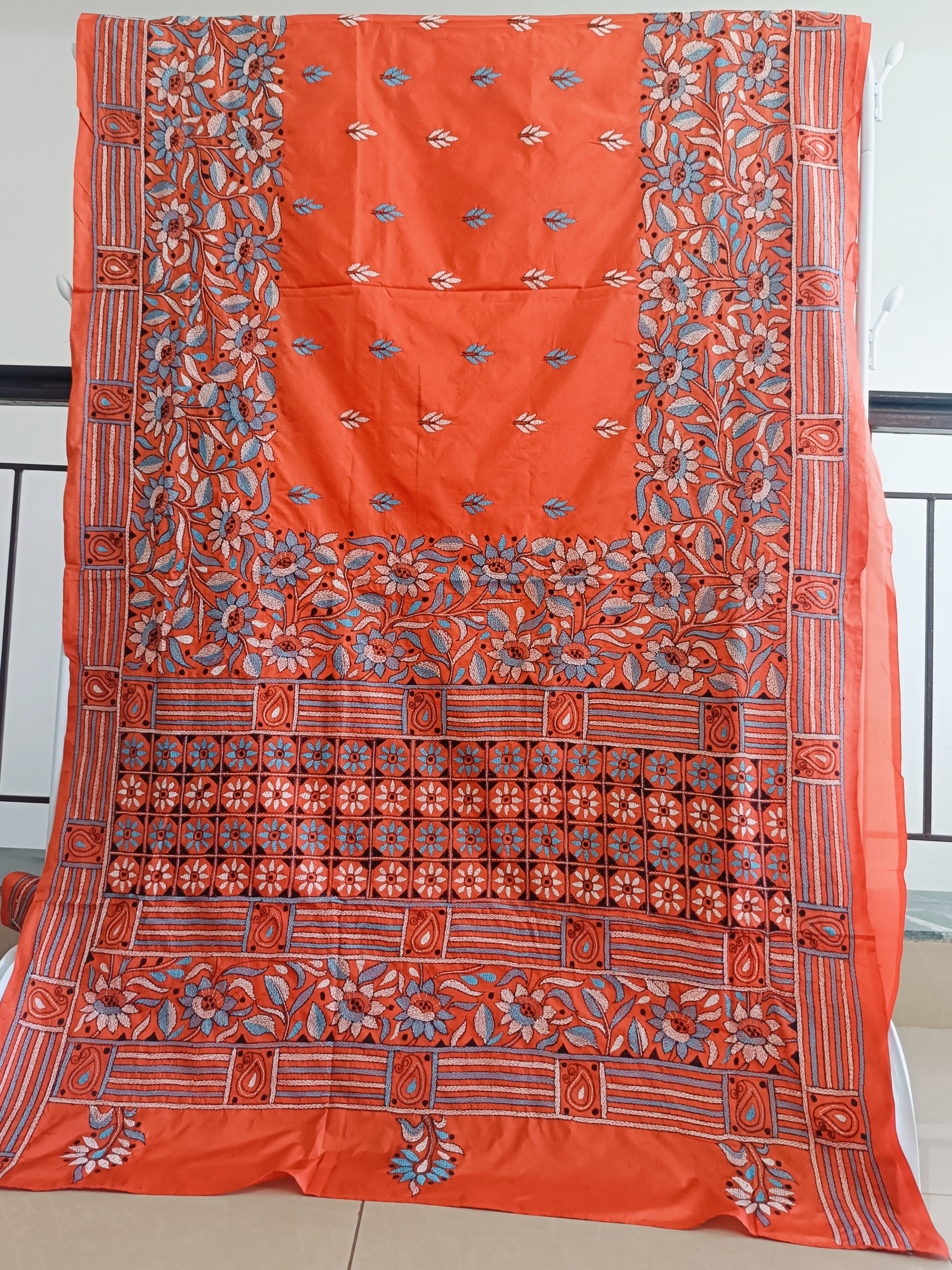 She entered like the first rays of dawn, wrapped in hues of deep orange. Her saree unfolded around her like a blossoming garden, each flower born of delicate Kantha stitches, each petal a whisper of tradition. With every movement, the blossoms swayed with her grace, as if silk and soul had become one. She wasn’t just draped in a saree, she was carrying a garden of stories on her shoulders.