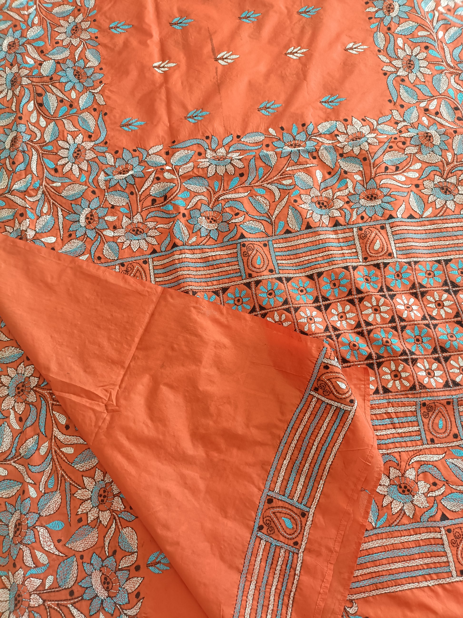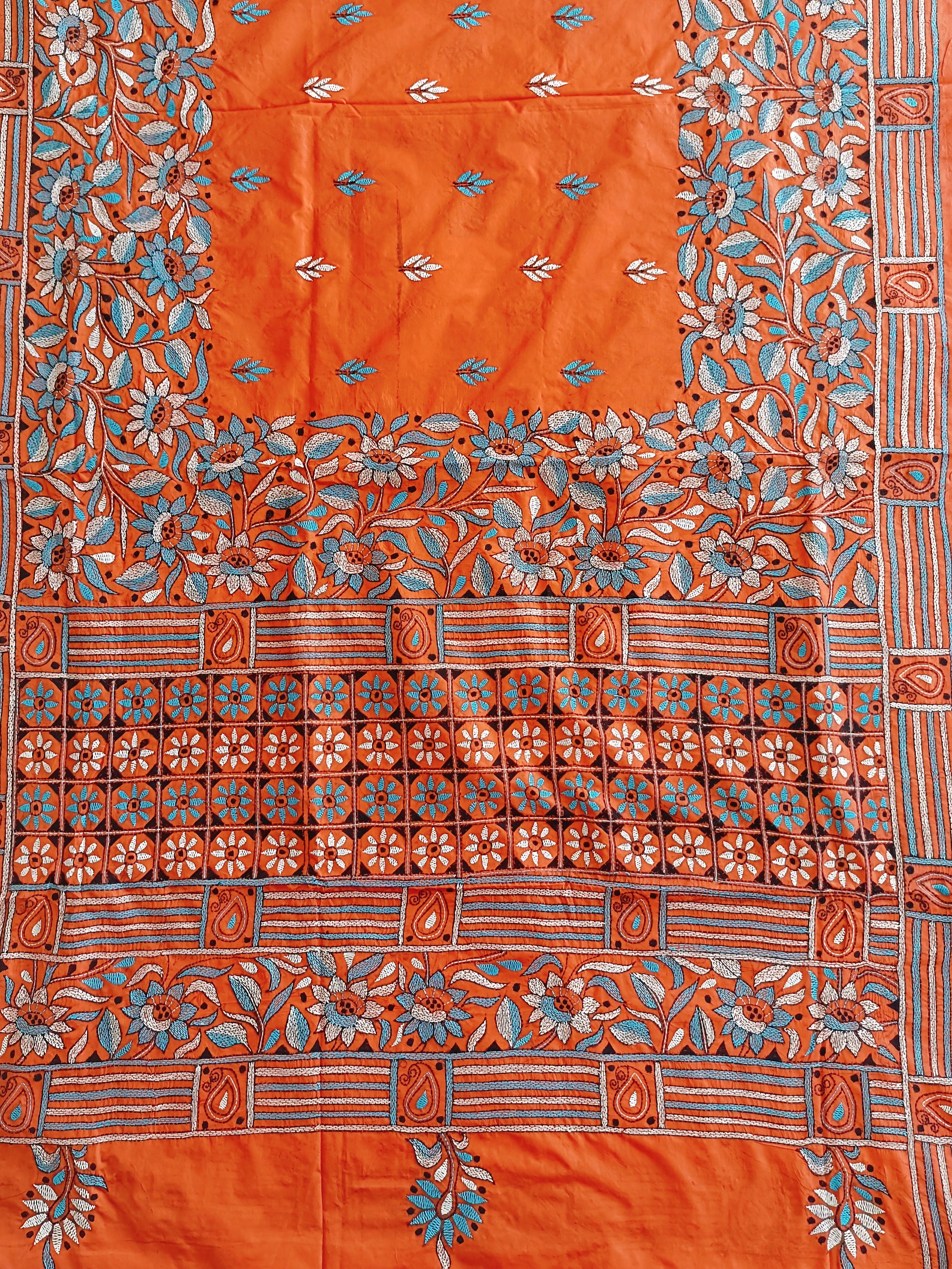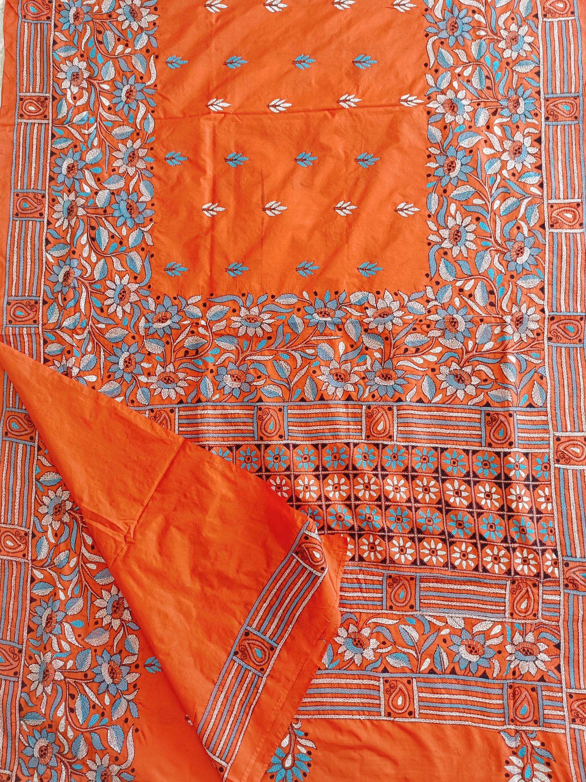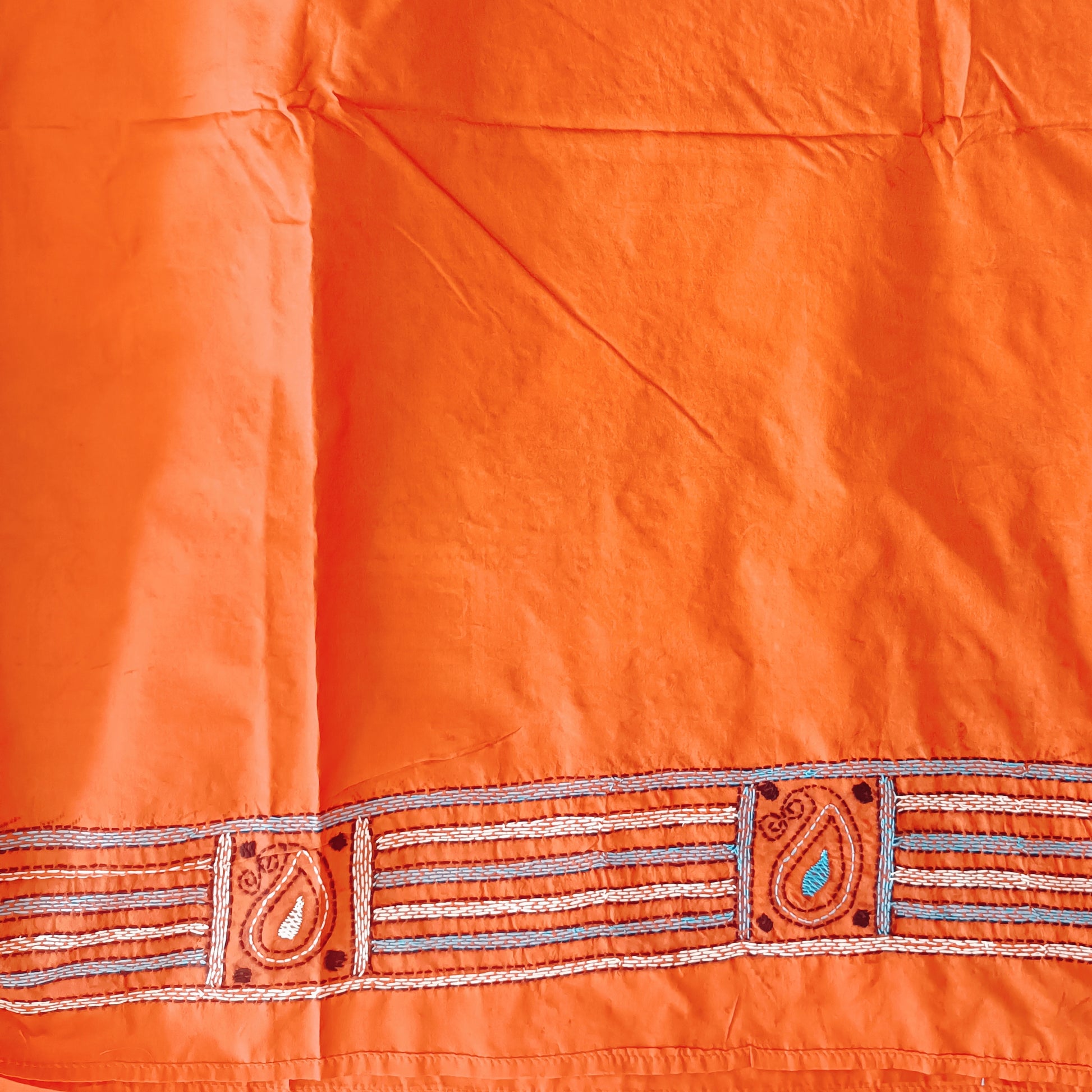 She entered like the first rays of dawn, wrapped in hues of deep orange. Her saree unfolded around her like a blossoming garden, each flower born of delicate Kantha stitches, each petal a whisper of tradition. With every movement, the blossoms swayed with her grace, as if silk and soul had become one. She wasn’t just draped in a saree, she was carrying a garden of stories on her shoulders.