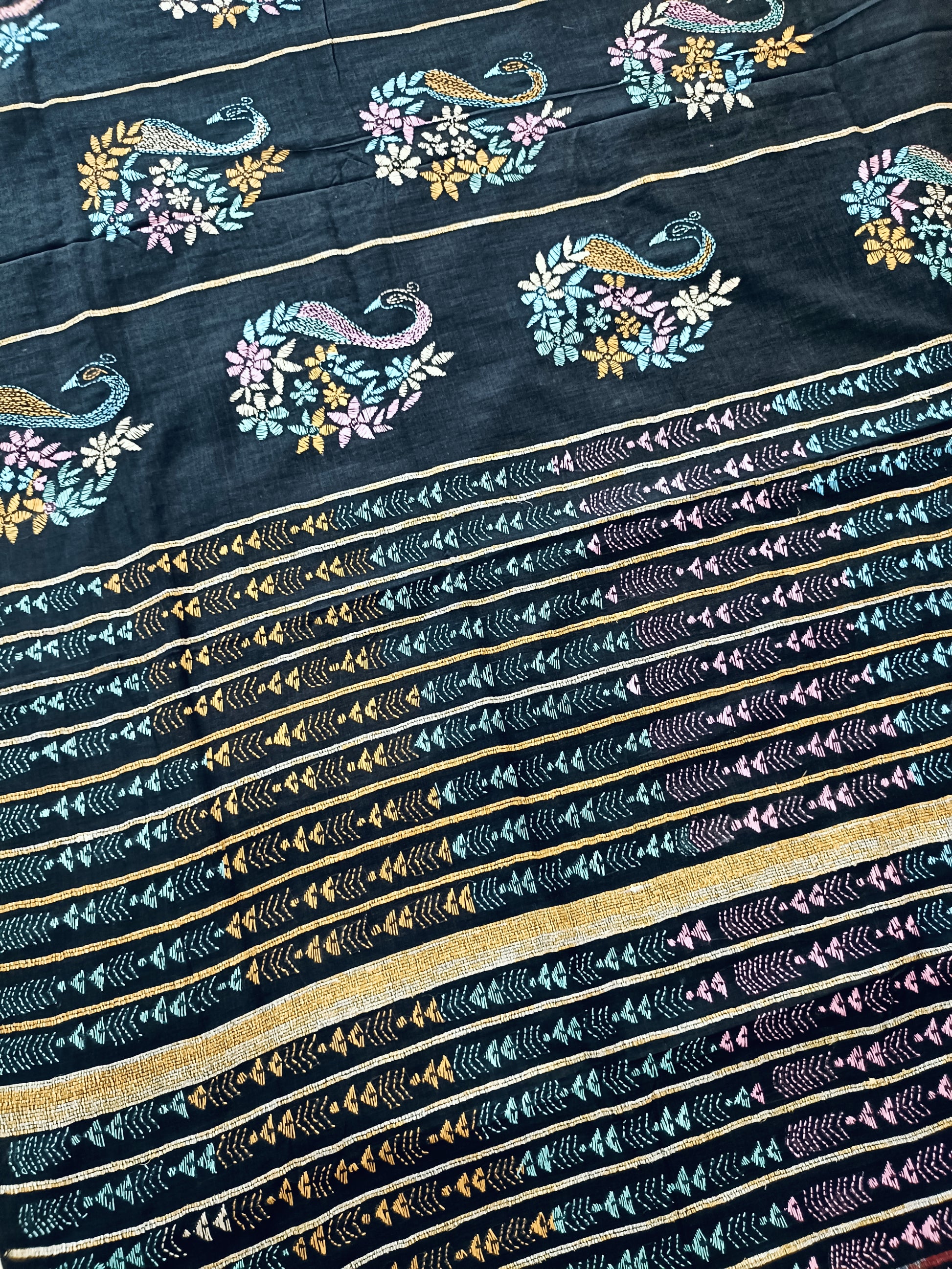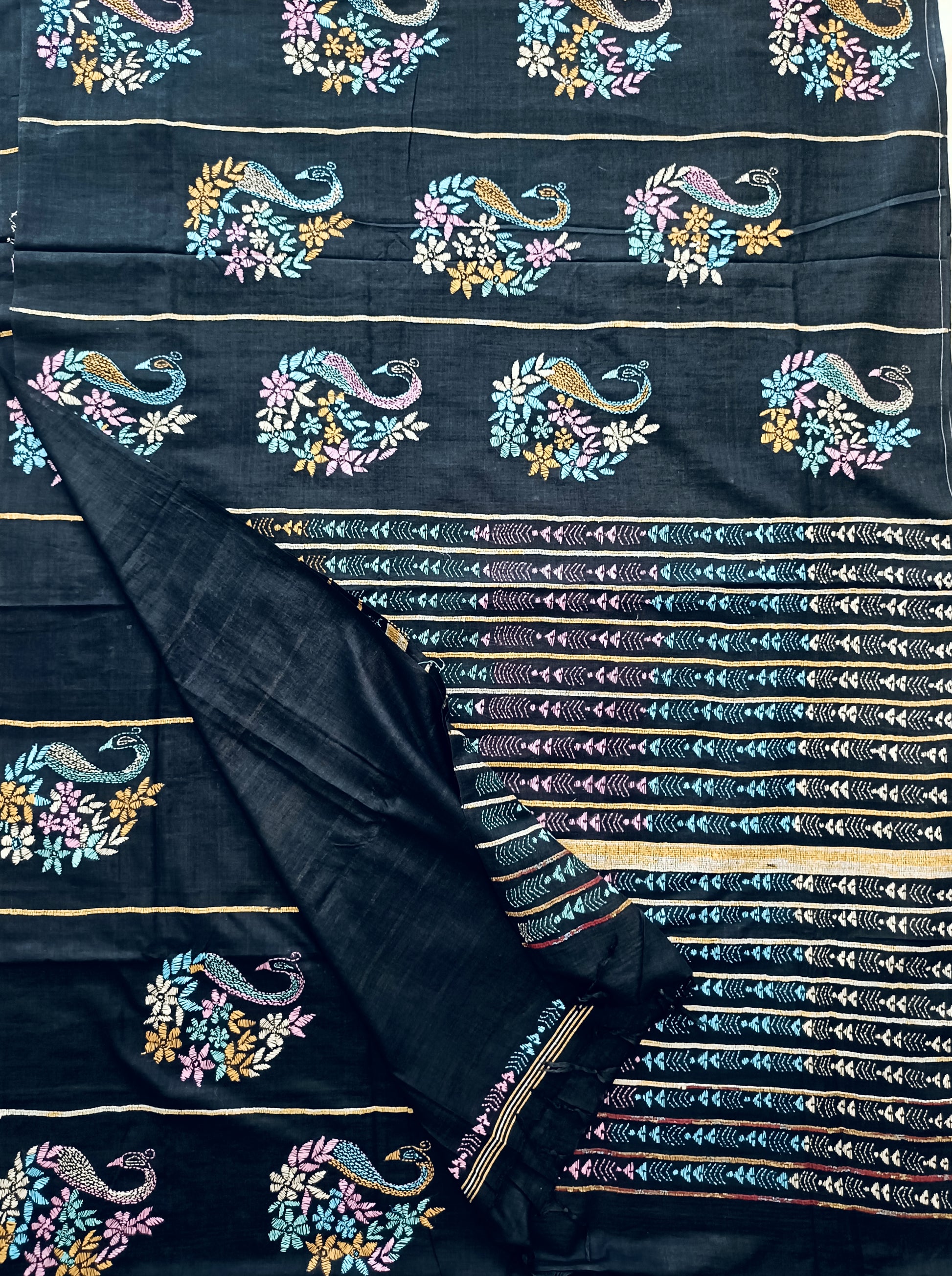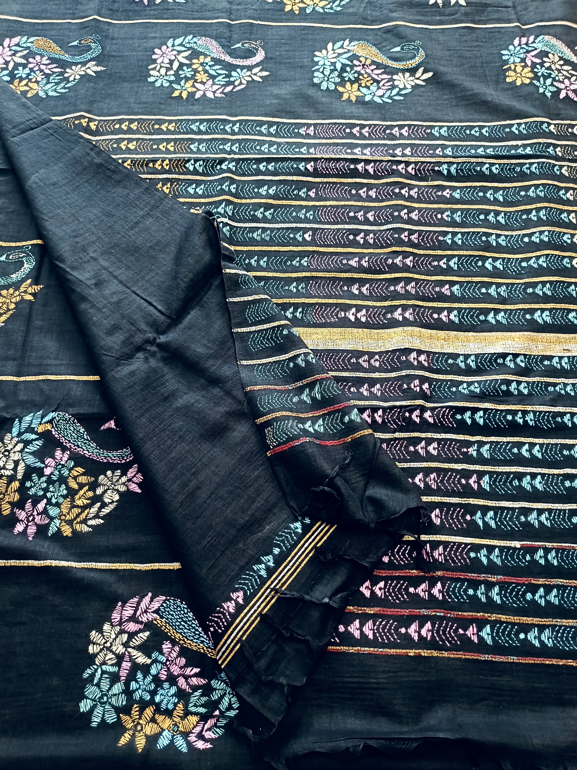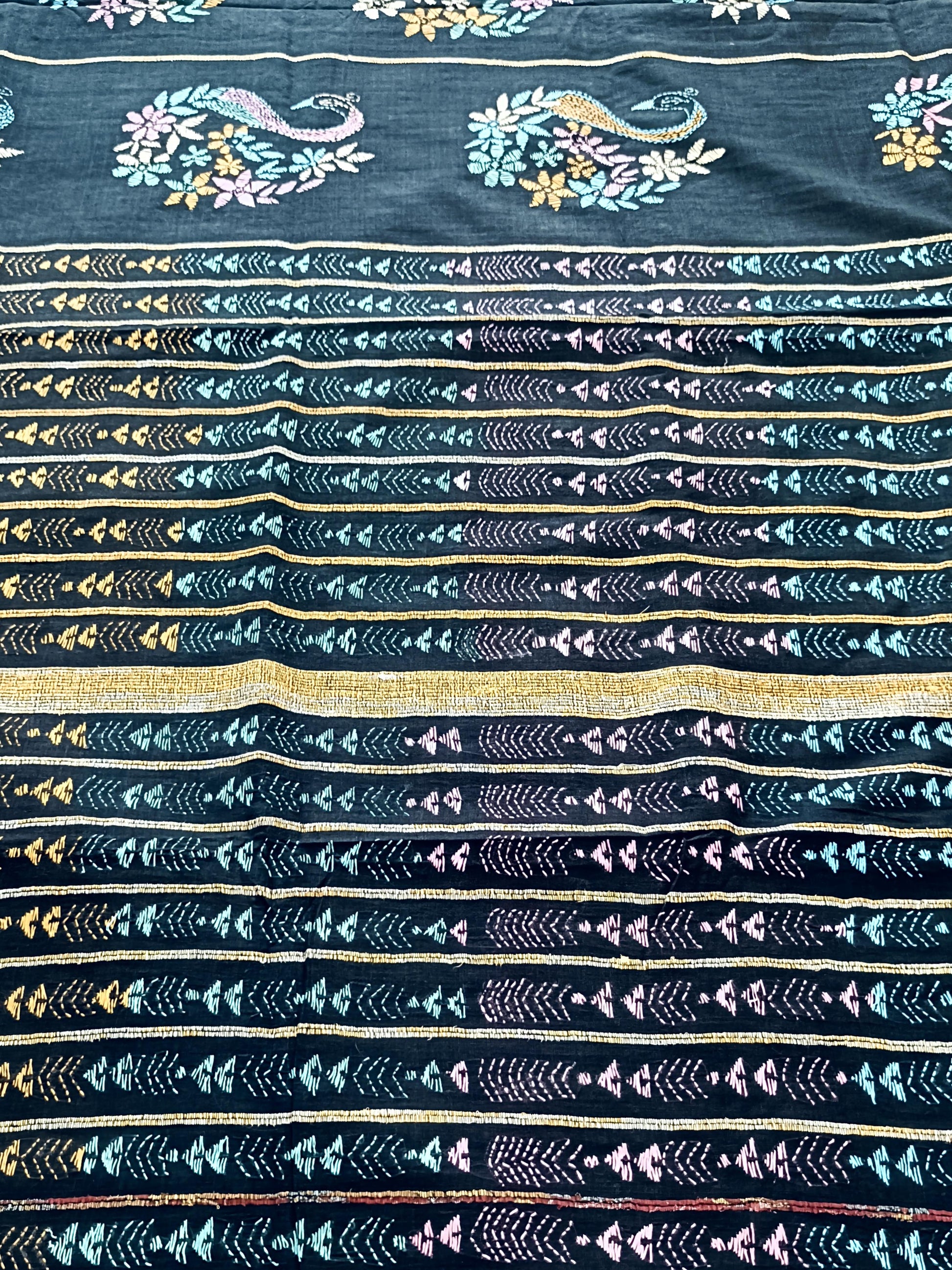 Experience the exquisite craftsmanship of West Bengal with this Pure Handmade Khesh Cotton Saree, adorned with intricate Handmade Kantha Stitch embroidery.