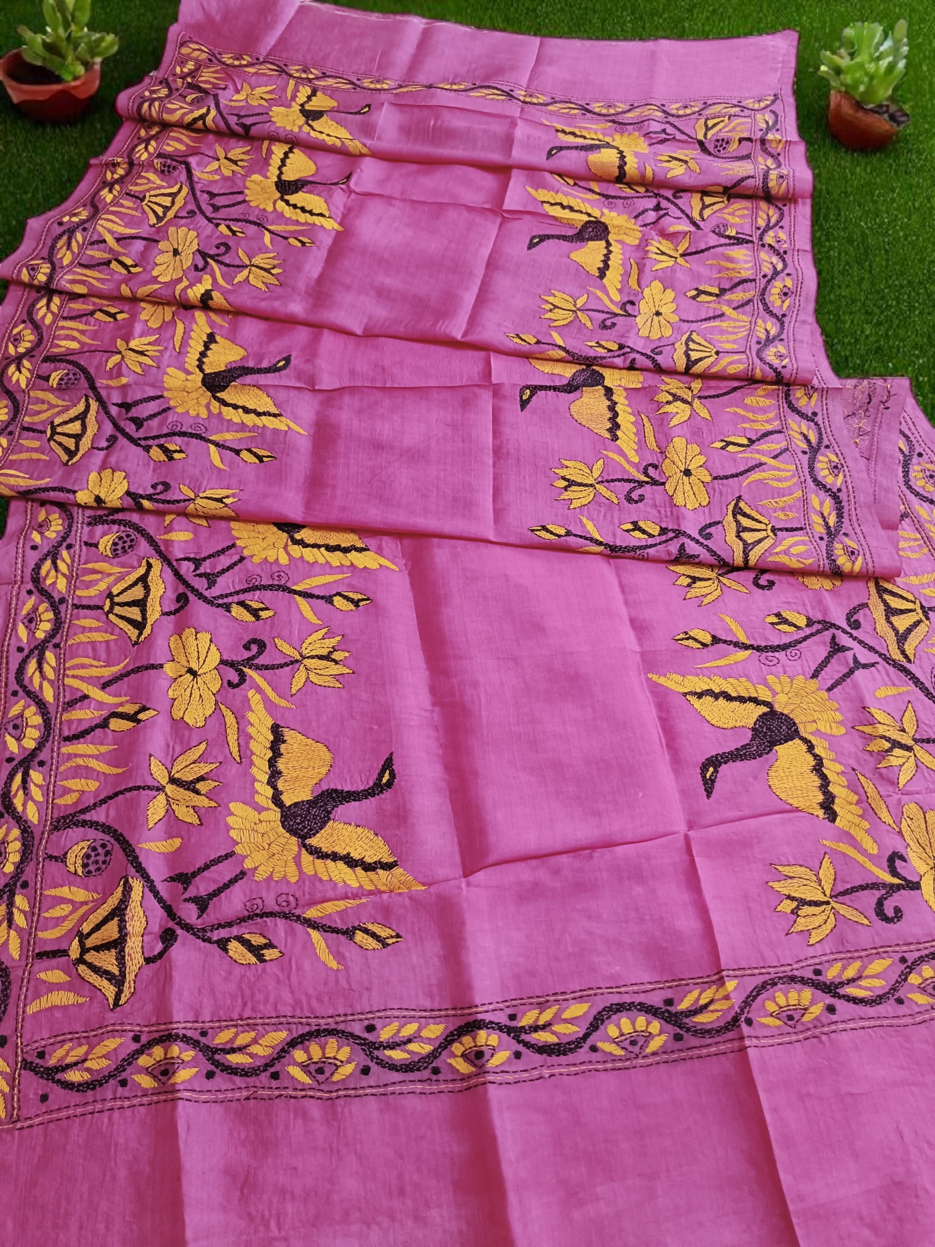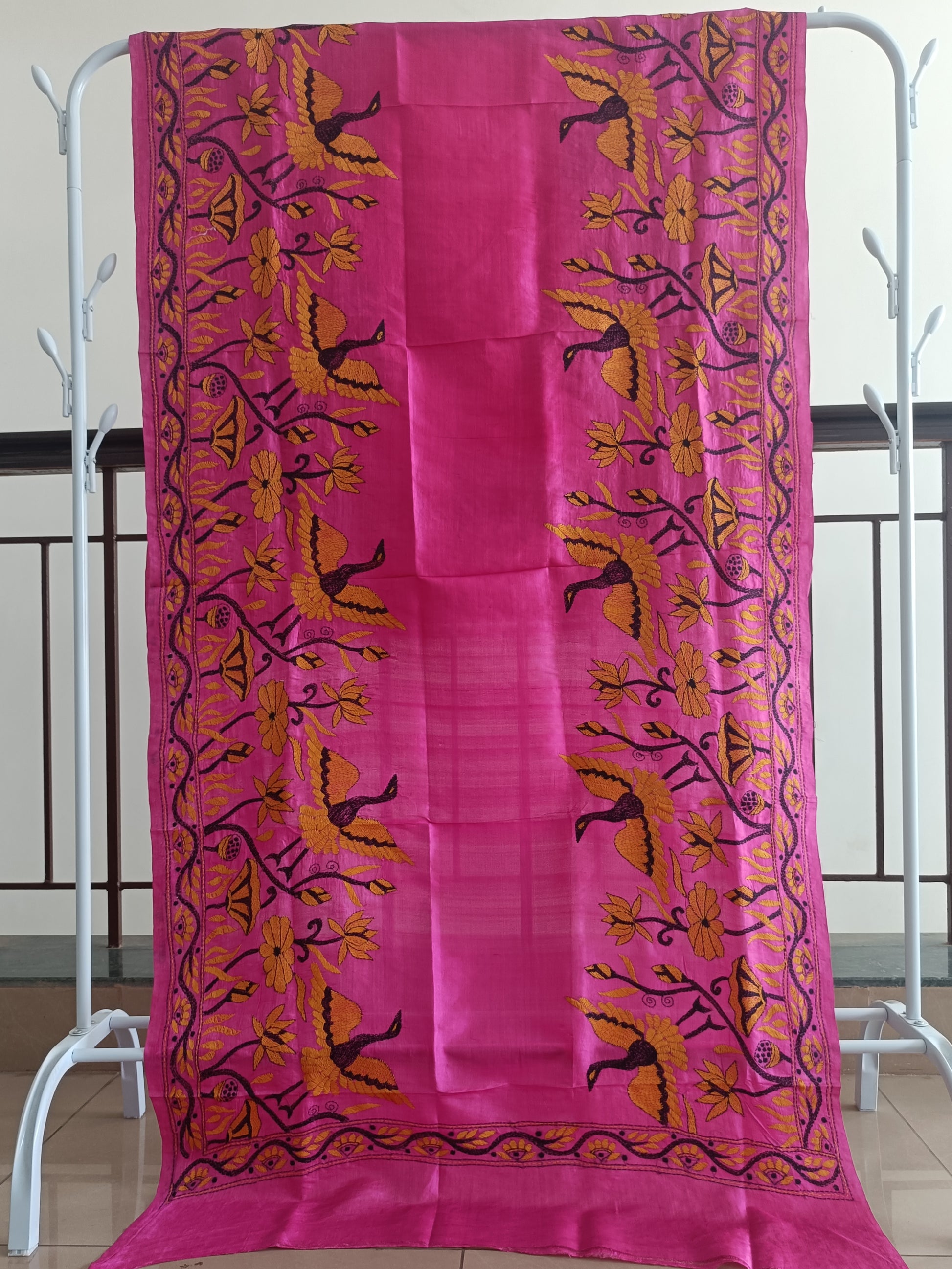 Gliding across still waters, the Raj Hans is more than a swan — it is a symbol of majesty, wisdom, and eternal beauty. Ancient tales sing of its ability to separate milk from water, embodying purity and discernment. This collection of Pure Tussar Silk Dupattas with Kantha stitch brings that legendary bird alive in delicate threads.