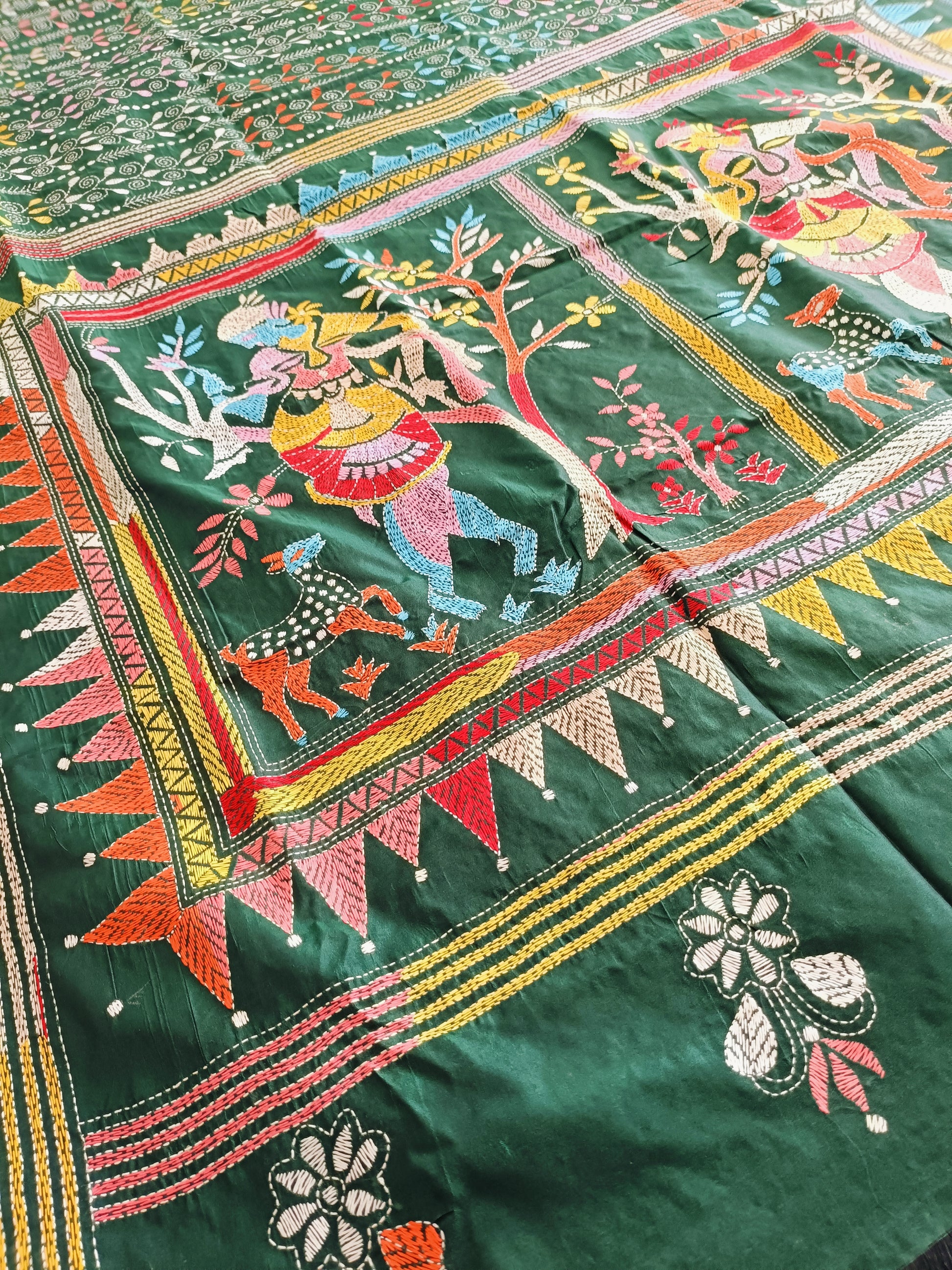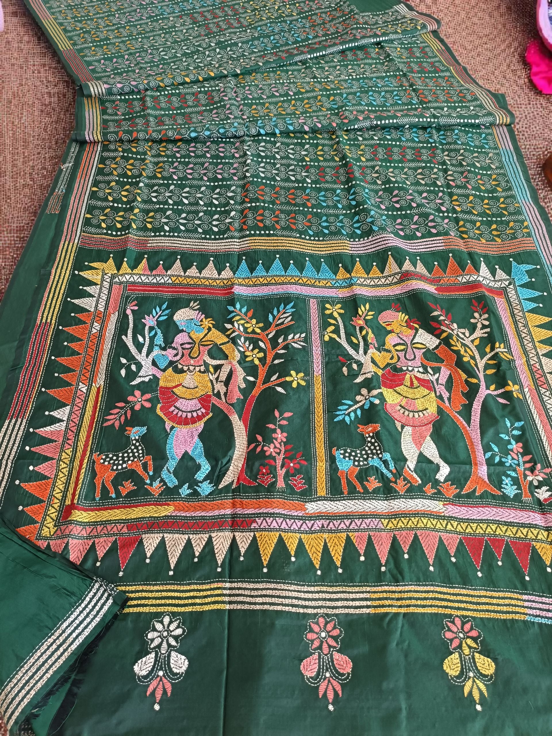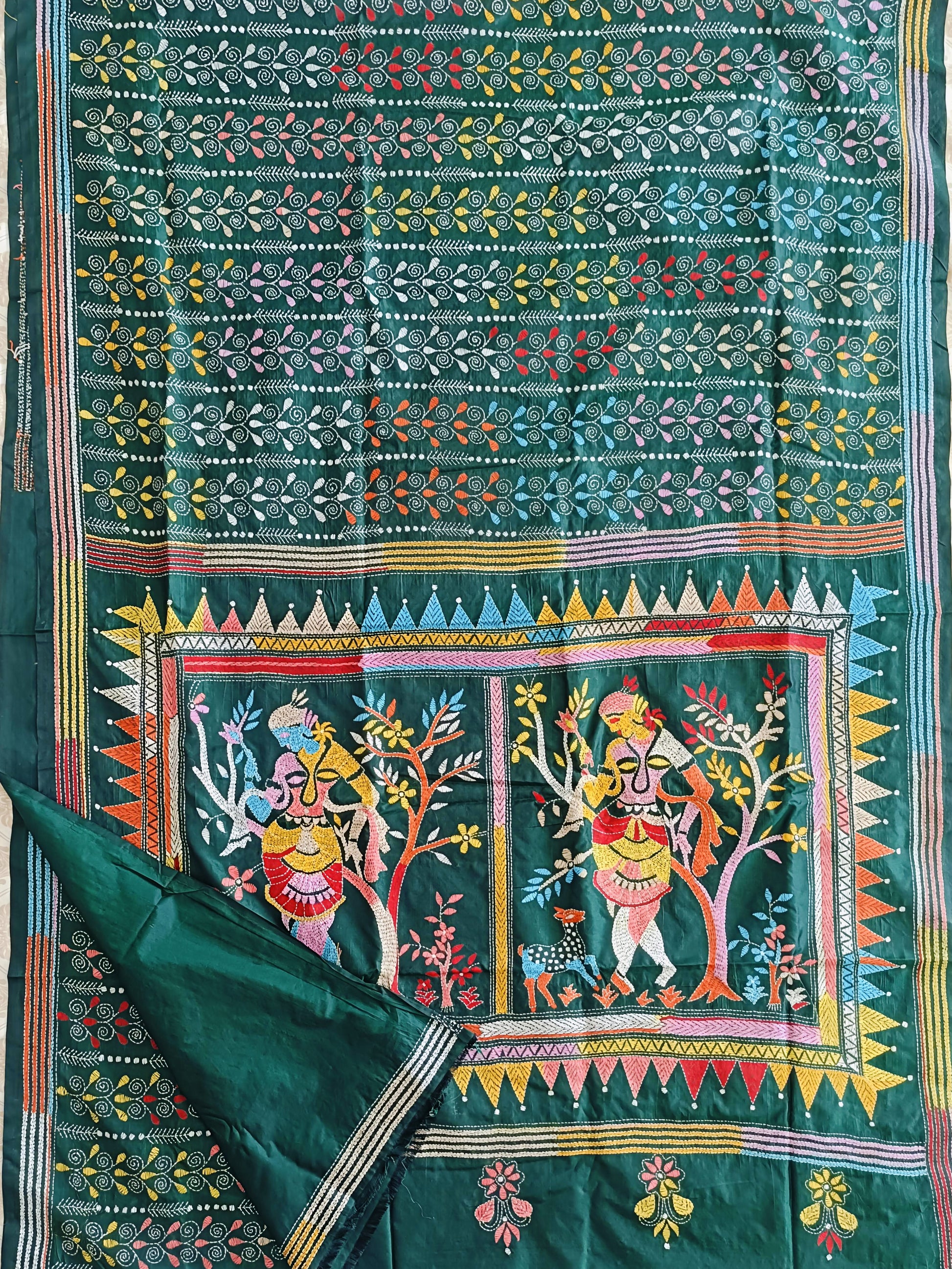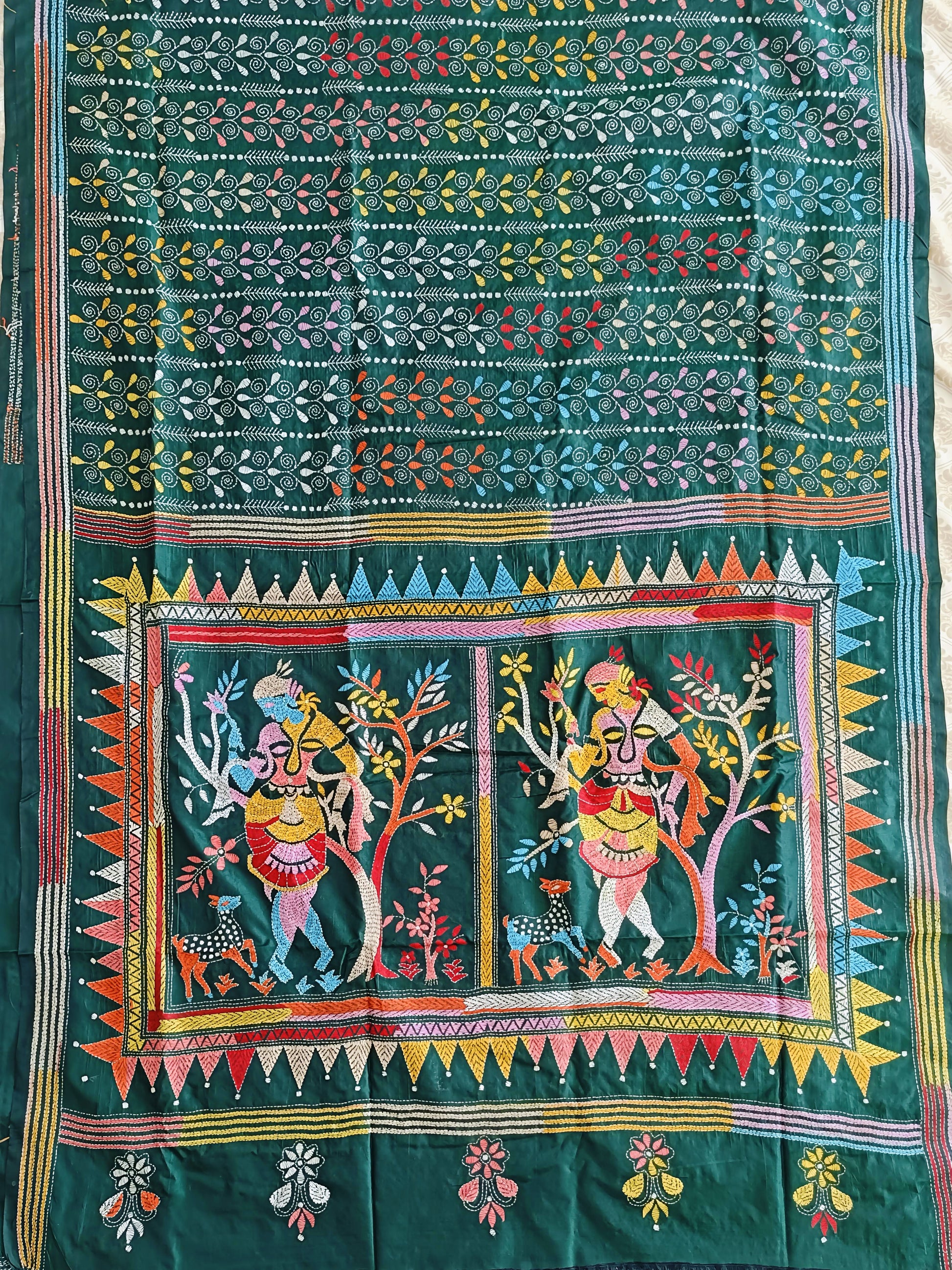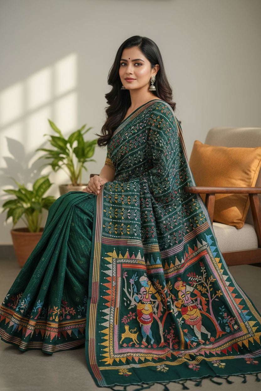In the quiet depths of forest hues, this dark green Kantha stitch saree unveils the story of Shakuntala — nature’s beloved muse and the embodiment of grace and love. Every delicate thread flows like poetry, tracing leaves, blossoms, and whispered longings that echo through the serene woods.