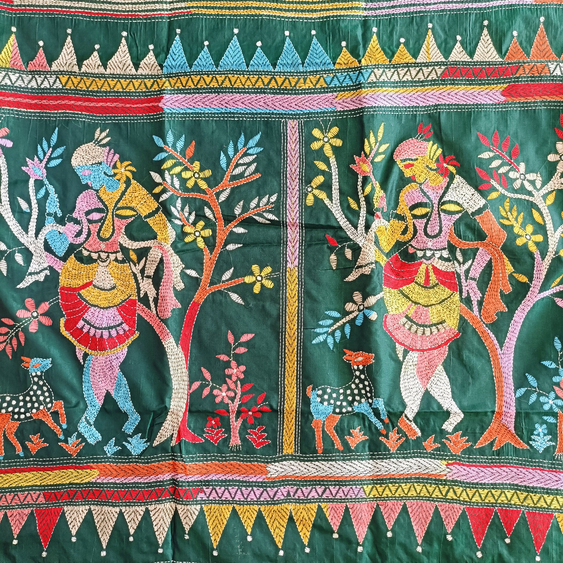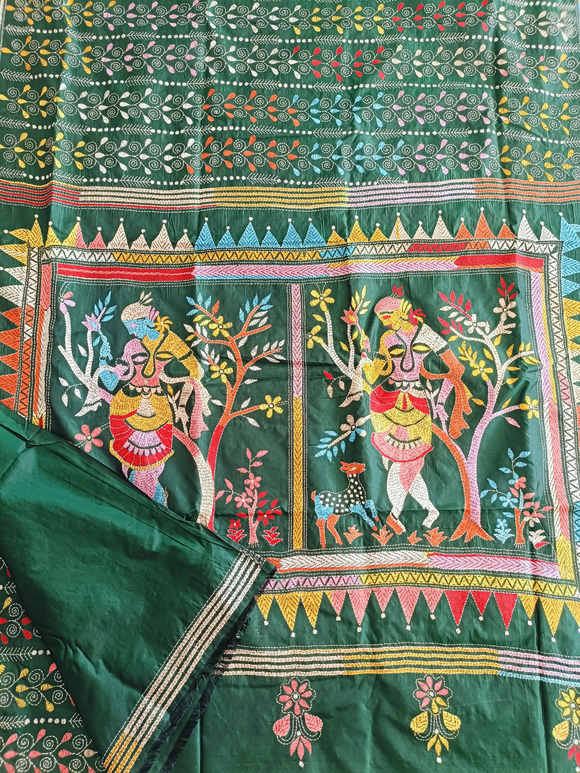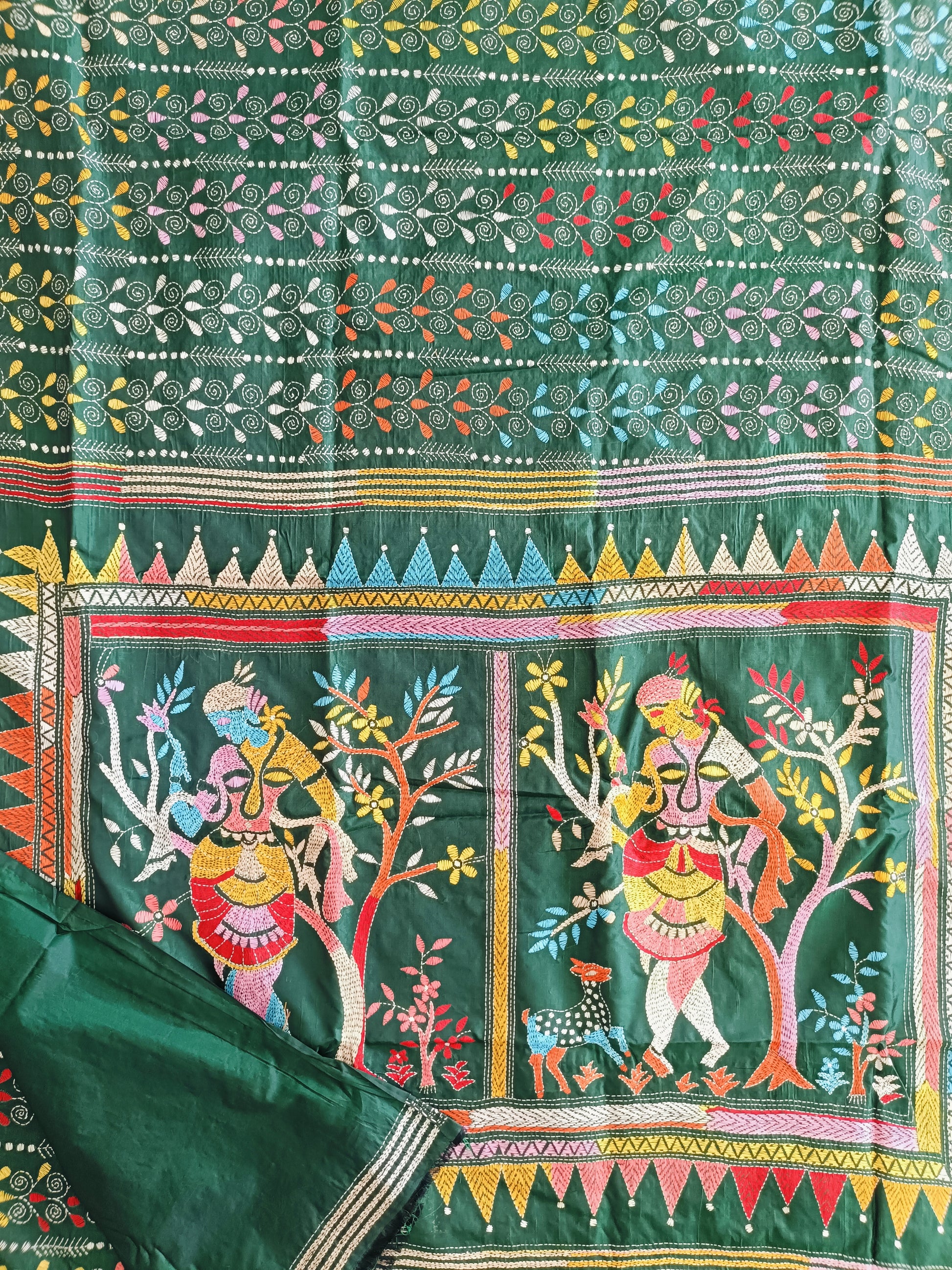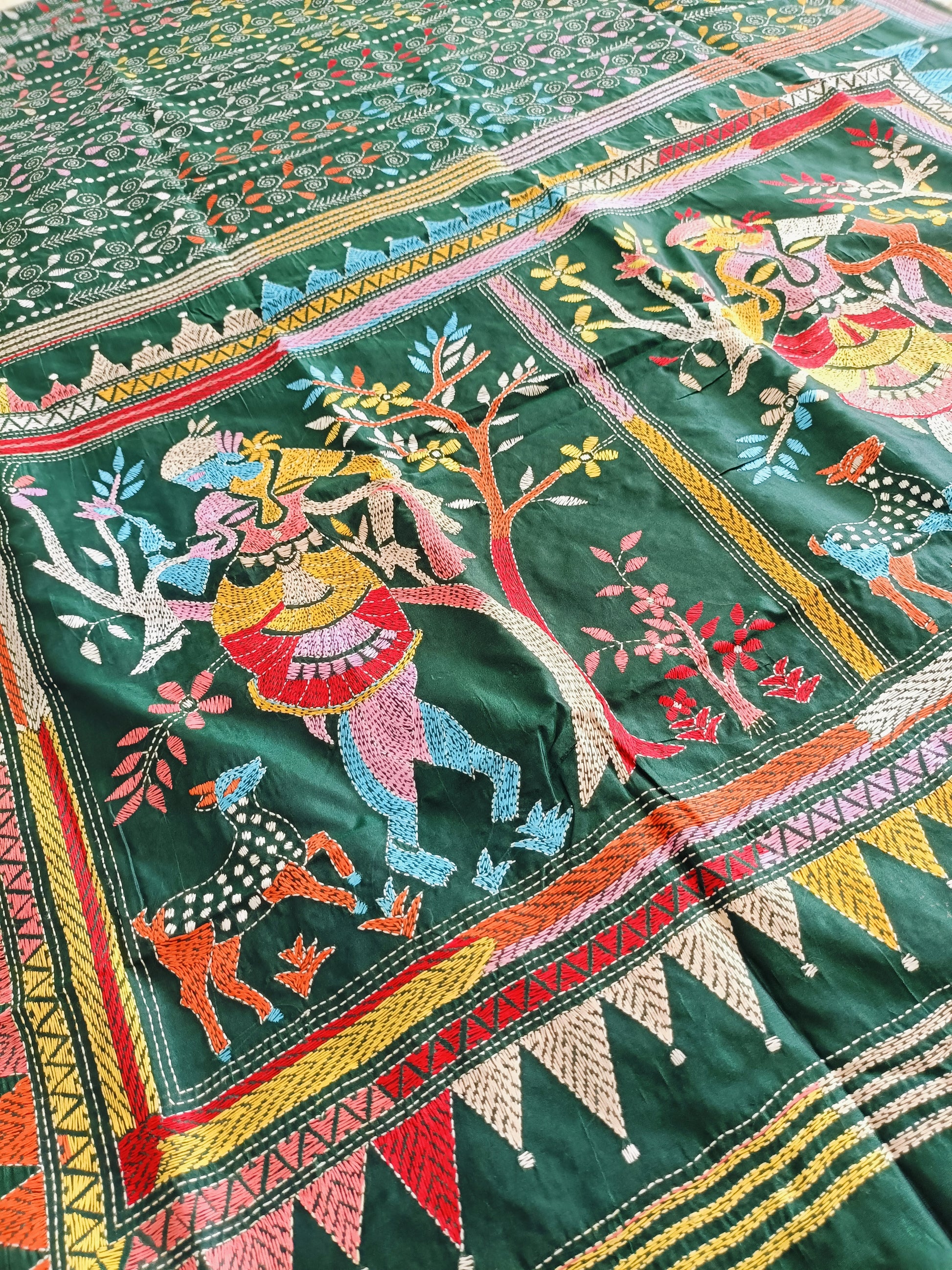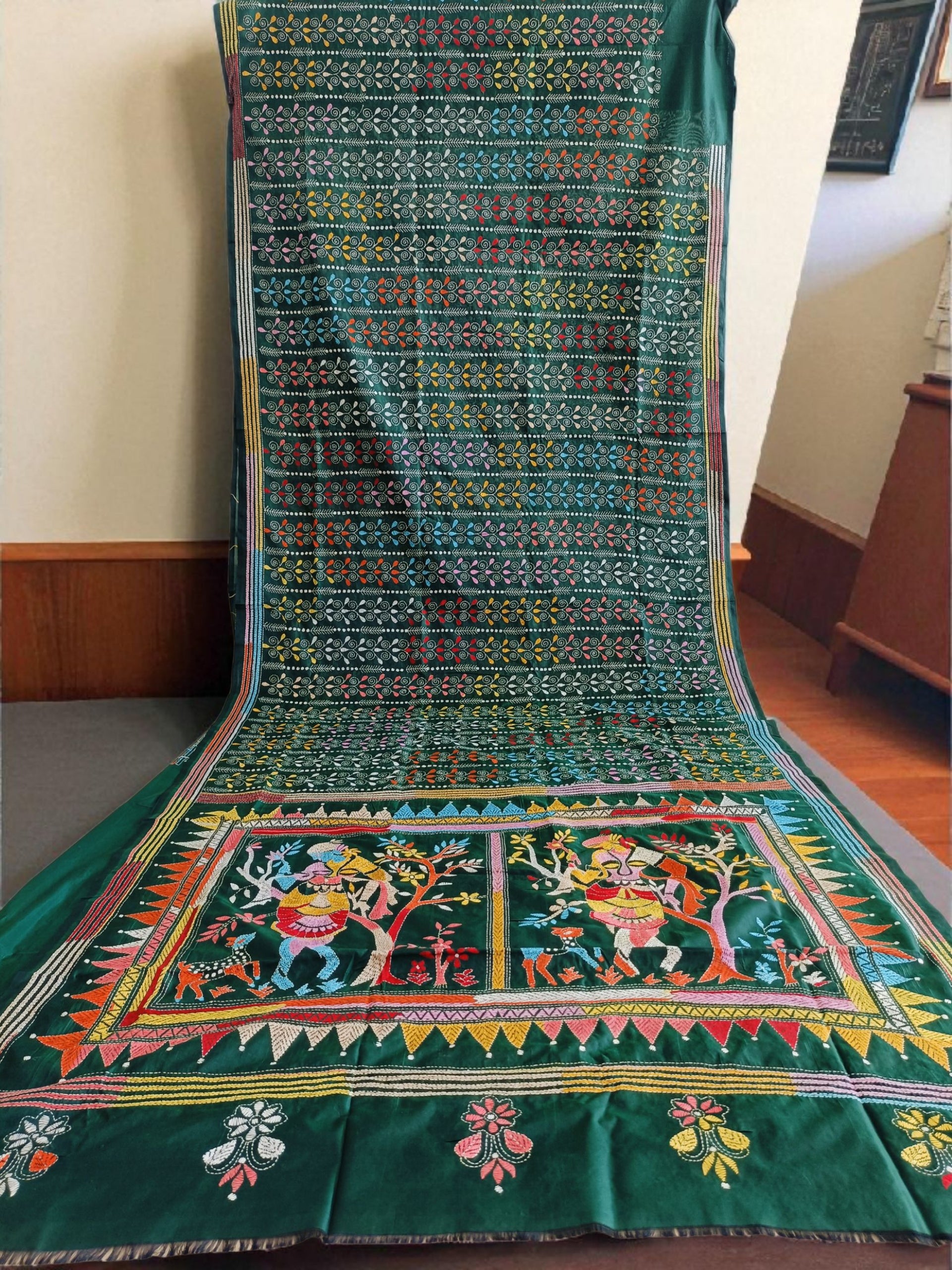 In the quiet depths of forest hues, this dark green Kantha stitch saree unveils the story of Shakuntala — nature’s beloved muse and the embodiment of grace and love. Every delicate thread flows like poetry, tracing leaves, blossoms, and whispered longings that echo through the serene woods.