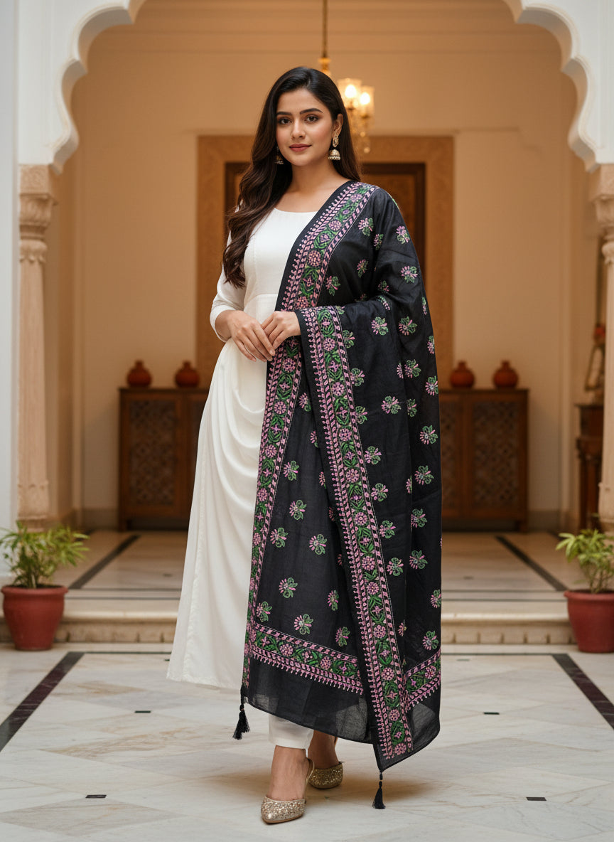 Madhubani Hand-Painted Stole Dupatta in Pure Bhagalpur Silk featuring intricate Madhubani motifs, a striking border, and delicate tassel ends. Dimensions: 36" wide and 1.9 meters long.