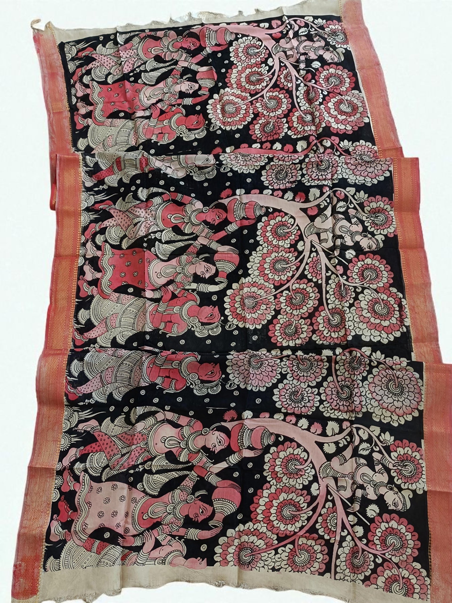 Kalamkari Hand-Painted Dupatta in Mangalagiri Pure Silk. It has a Zari border and soft tassel ends. Dimensions: 36" wide and 2.5 meters long.