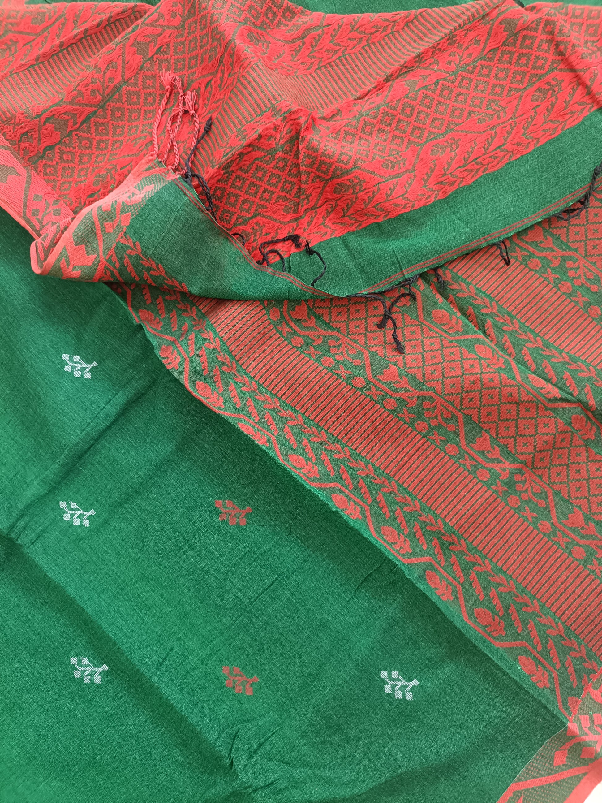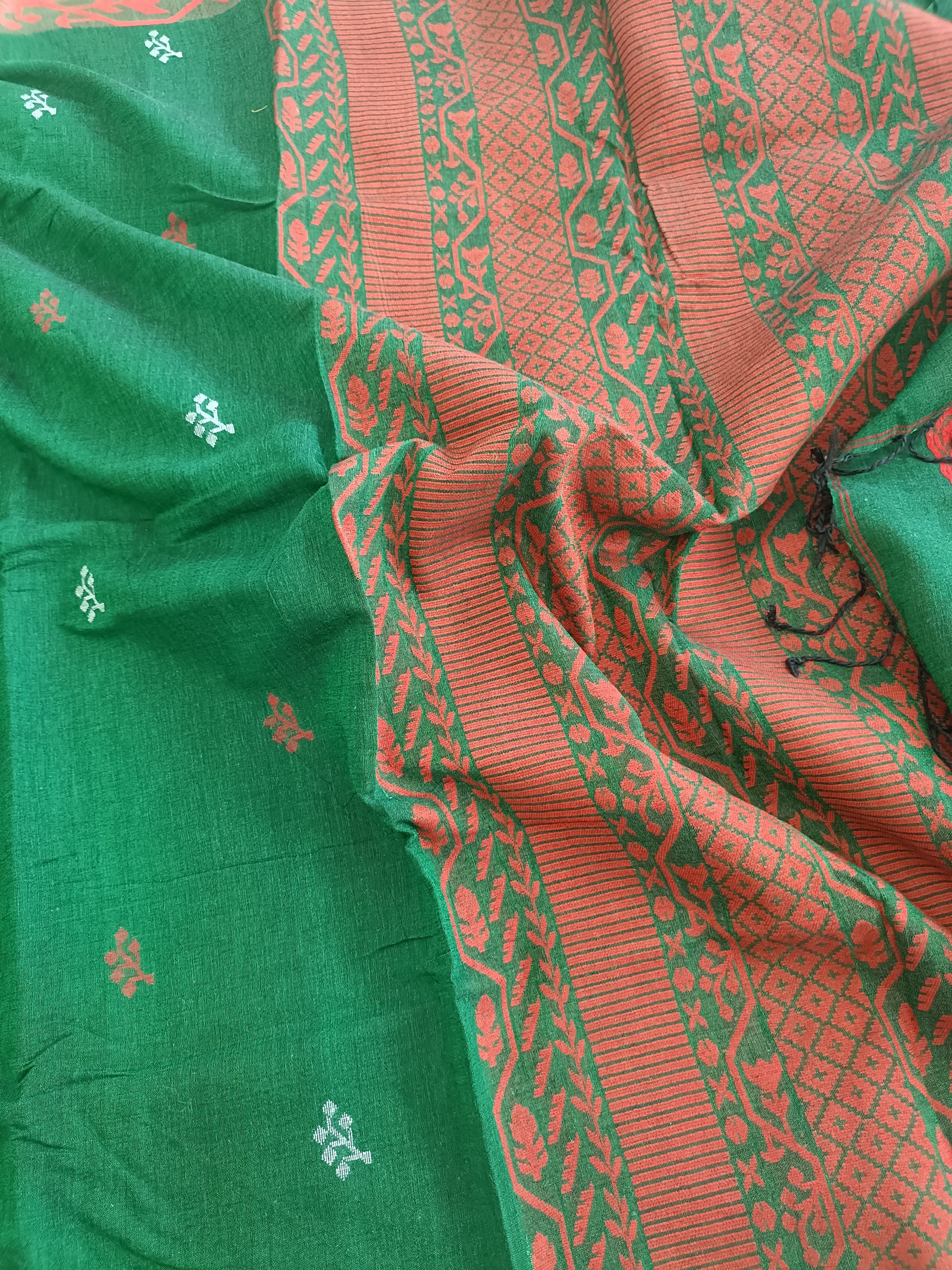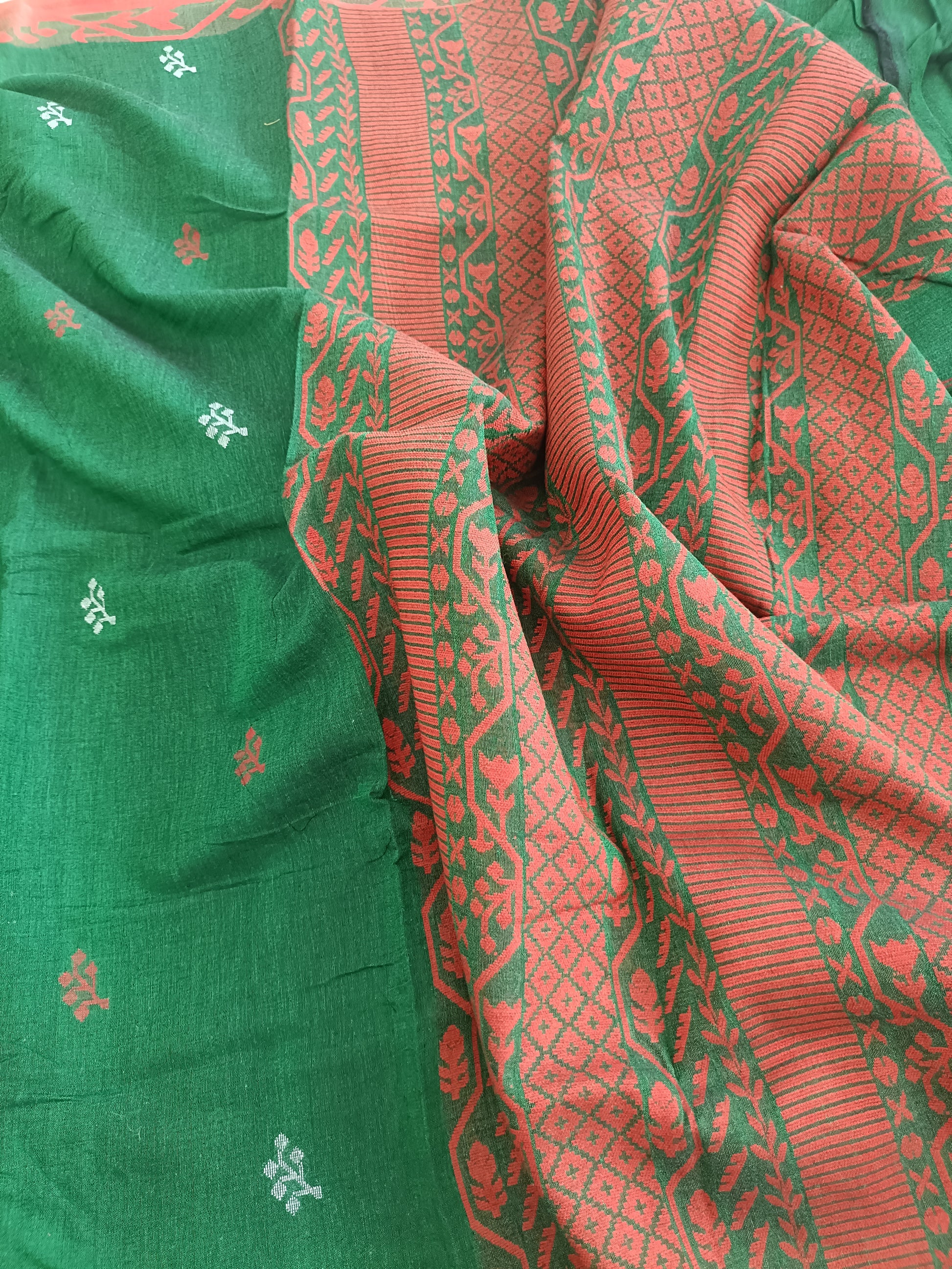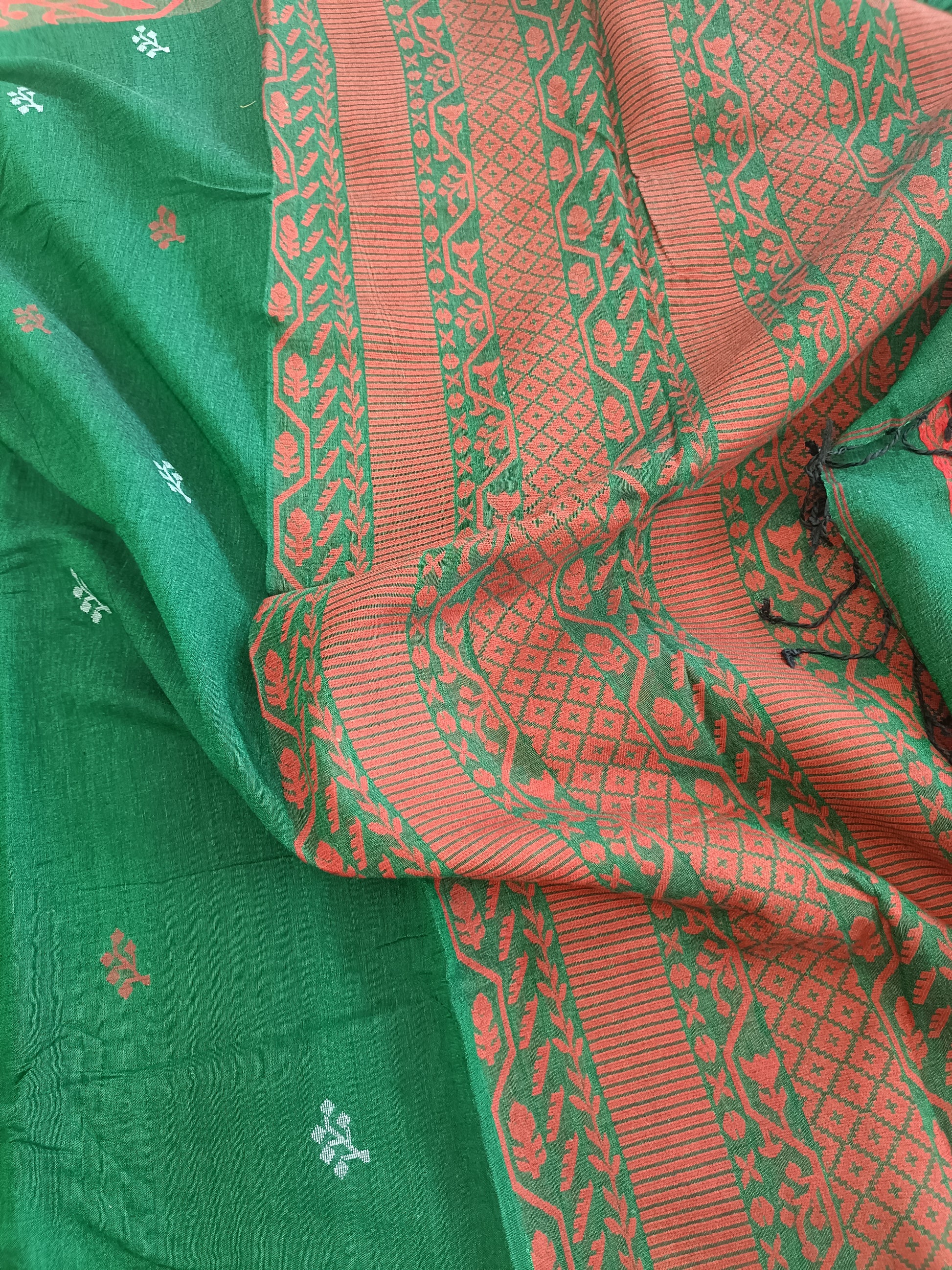 “Woven by hand, these Bengal cottons breathe the rhythm of tradition. Draped in soft hues and rich colors, they whisper elegance for every festive moment. Blouse running."