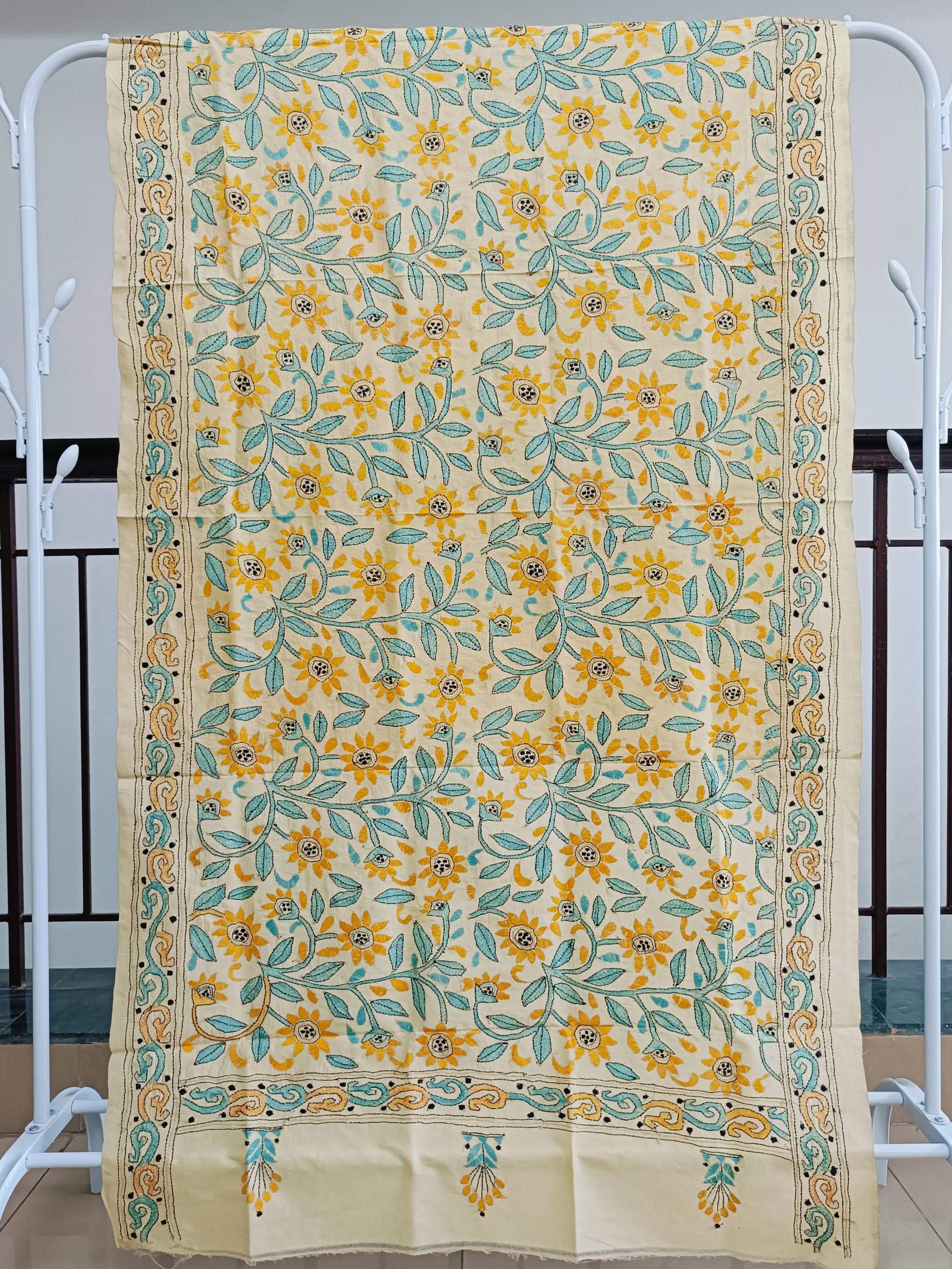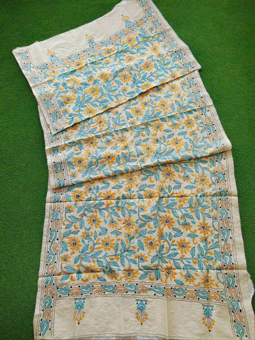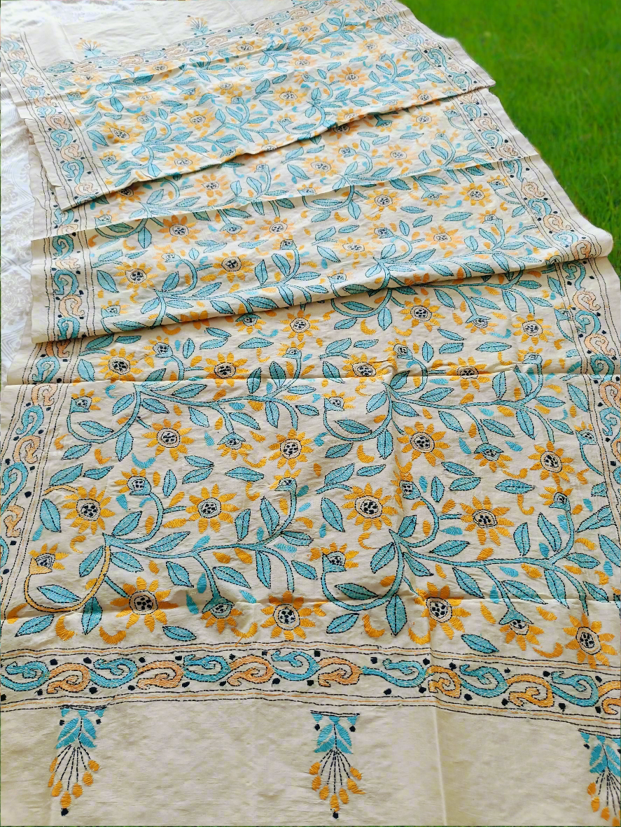 Tall, golden, and ever-turning to the sun — the Sunflower is a symbol of hope, devotion, and unyielding joy. In this collection of Pure Tussar Silk Dupattas with Kantha stitch, artisans bring alive the brightness of the सूरजमुखी in every handwoven detail.