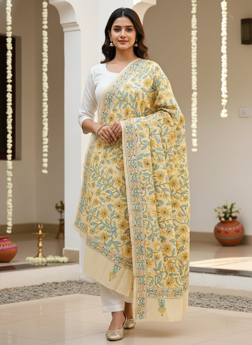 Madhubani Hand-Painted Stole Dupatta in Pure Bhagalpur Silk featuring intricate Madhubani motifs, a striking border, and delicate tassel ends. Dimensions: 36" wide and 1.9 meters long.