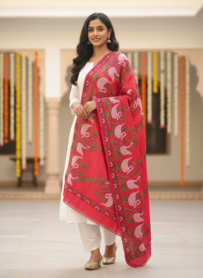 Madhubani Hand-Painted Stole Dupatta in Pure Bhagalpur Silk featuring intricate Madhubani motifs, a striking border, and delicate tassel ends. Dimensions: 36" wide and 1.9 meters long.