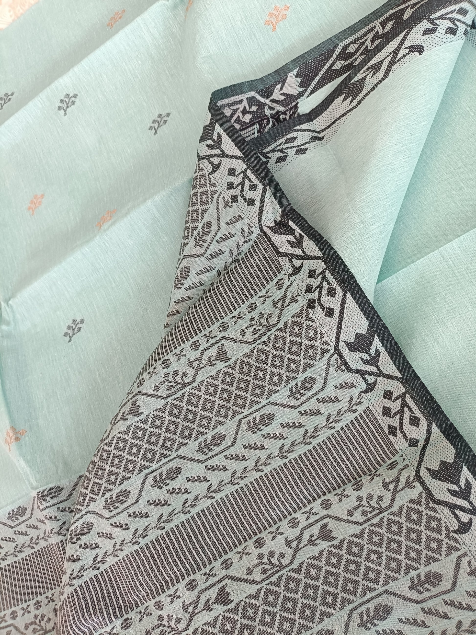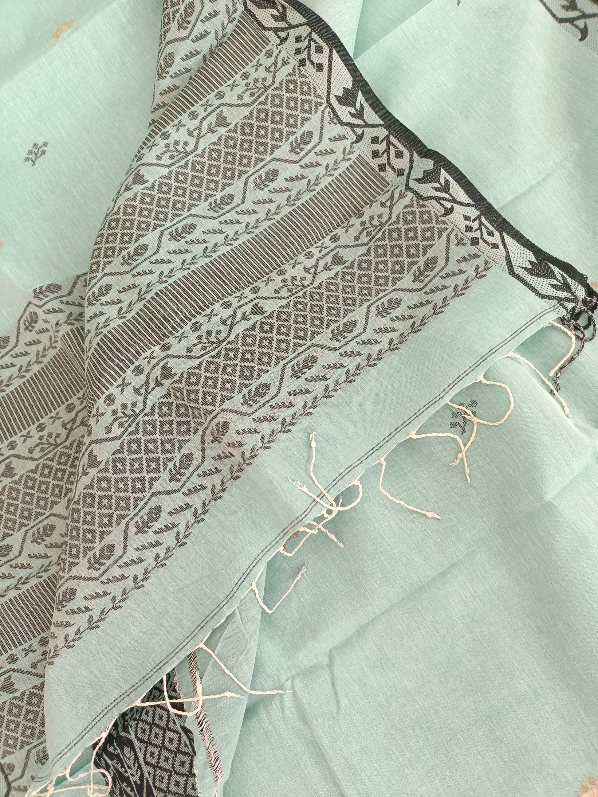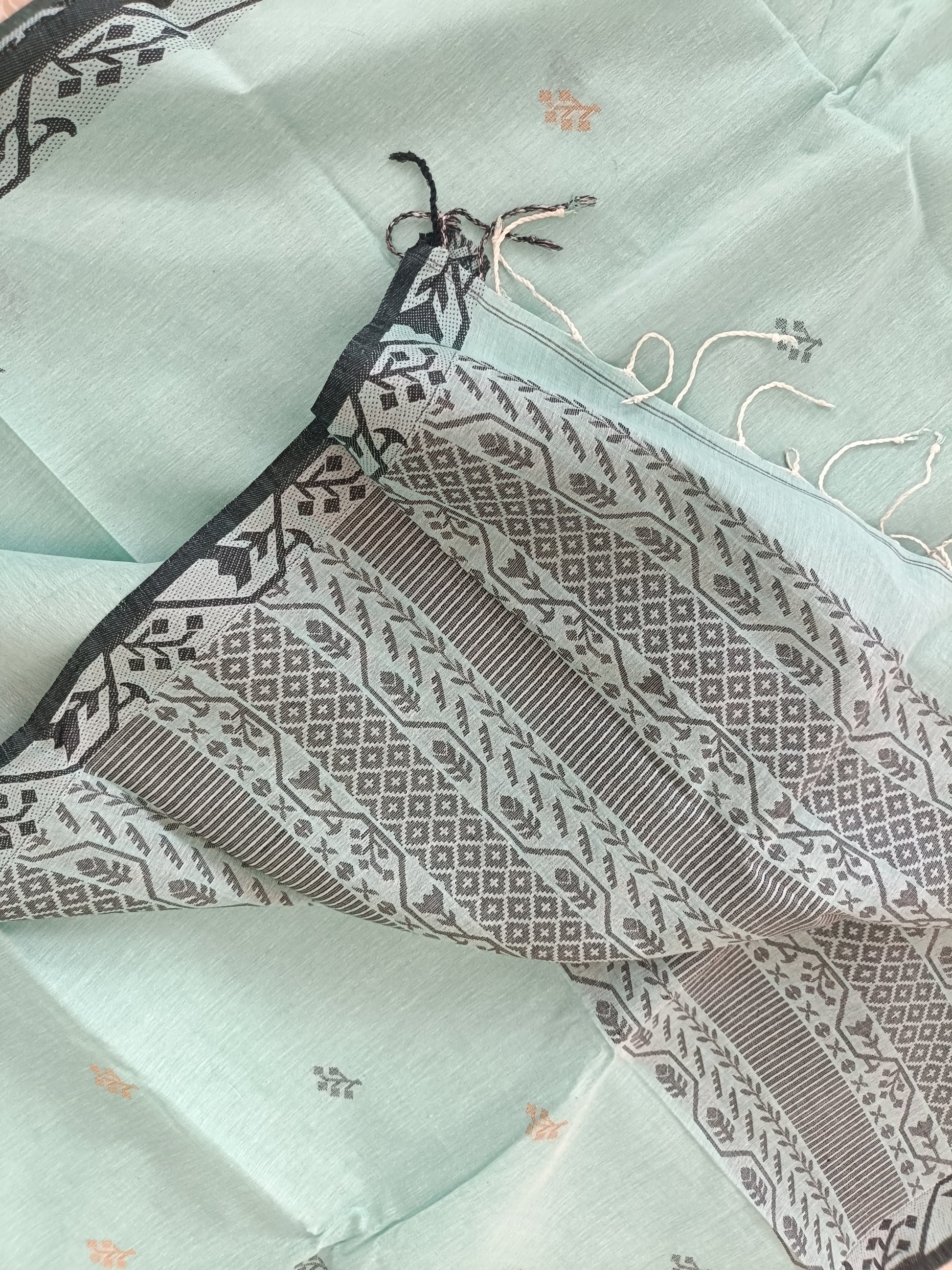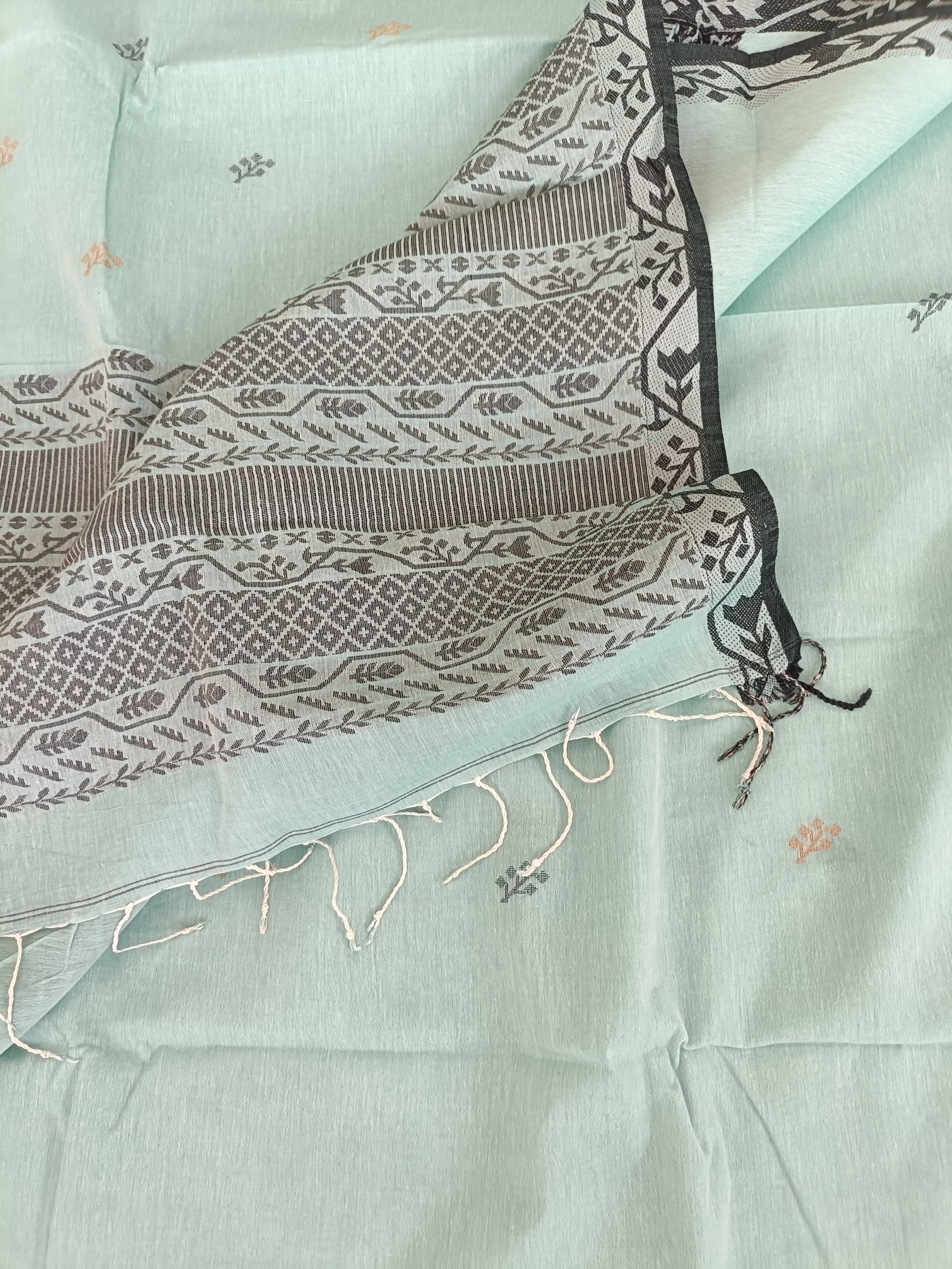 “Woven by hand, these Bengal cottons breathe the rhythm of tradition. Draped in soft hues and rich colors, they whisper elegance for every festive moment. Blouse running."