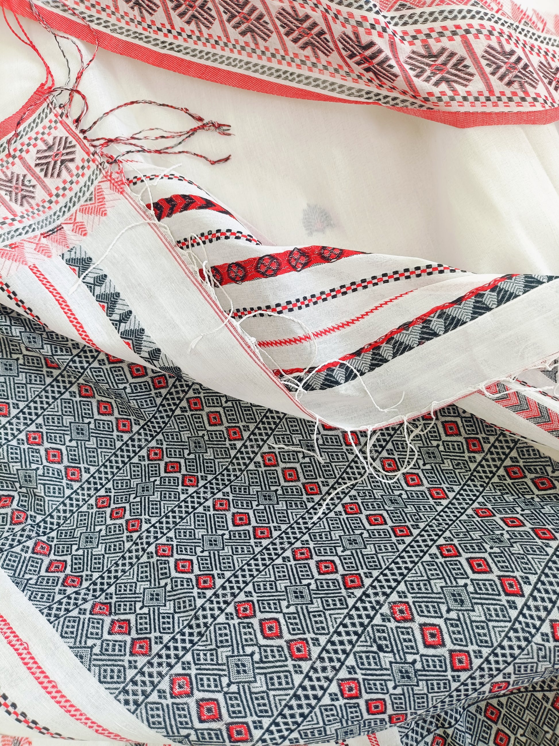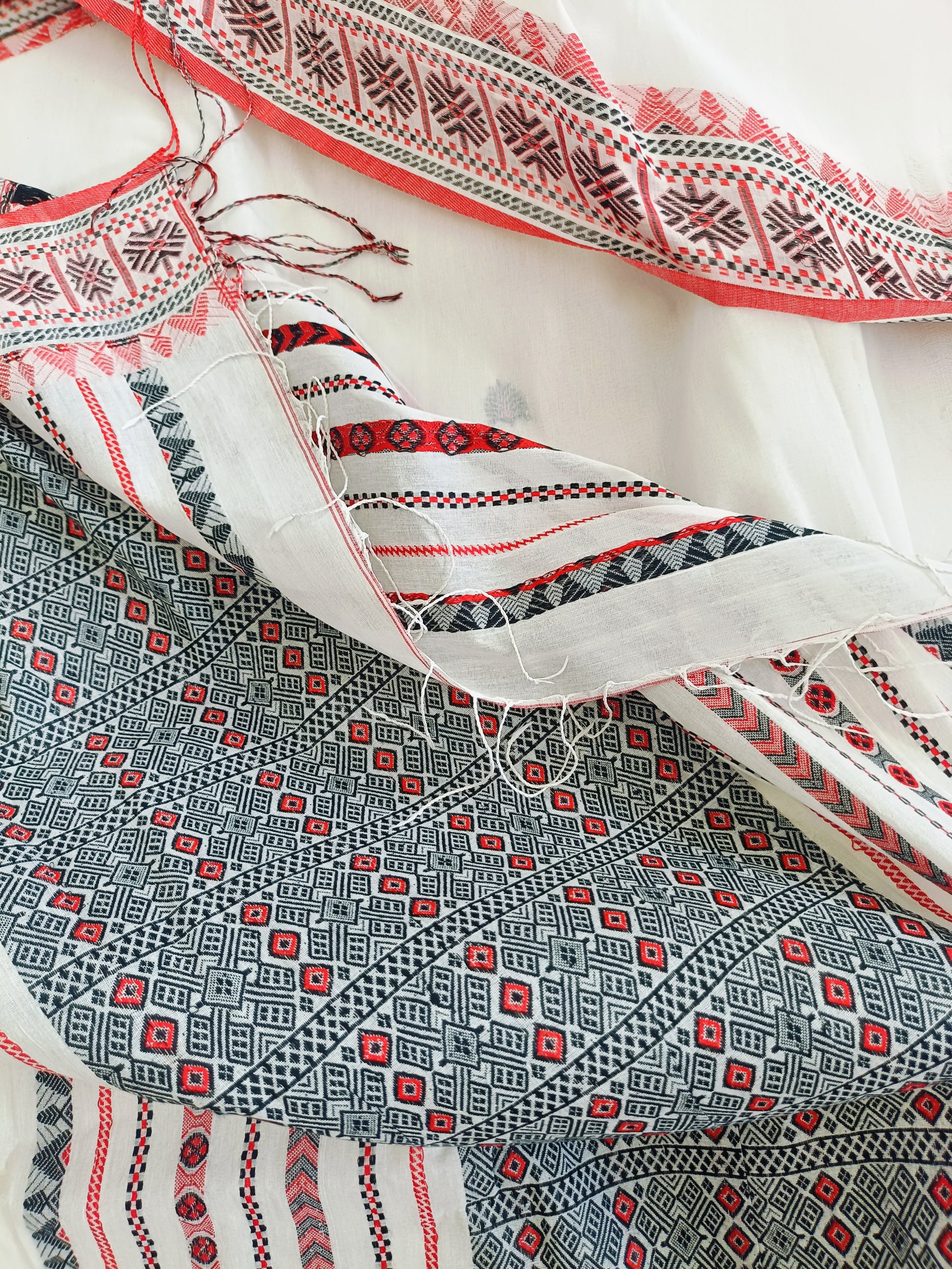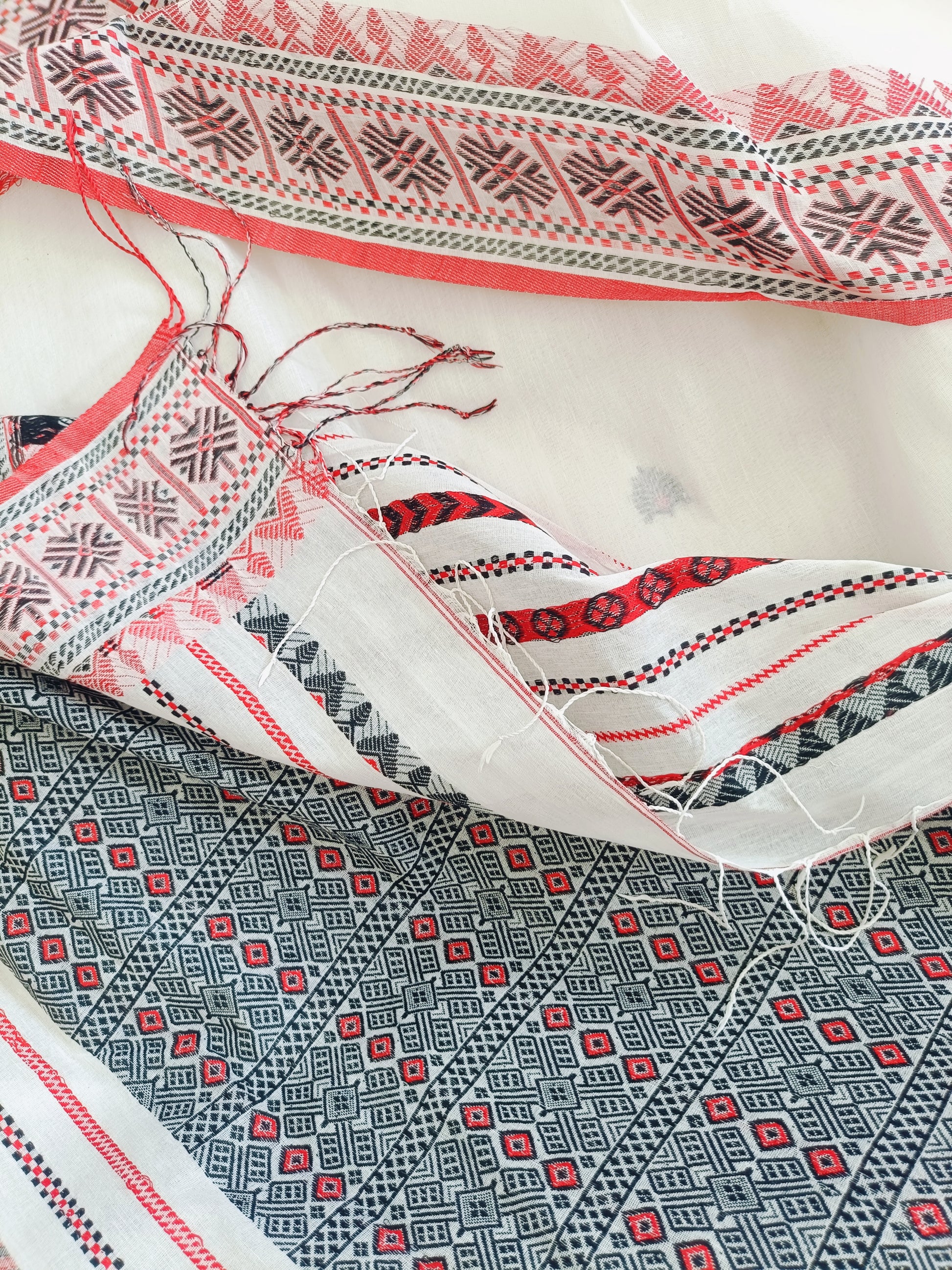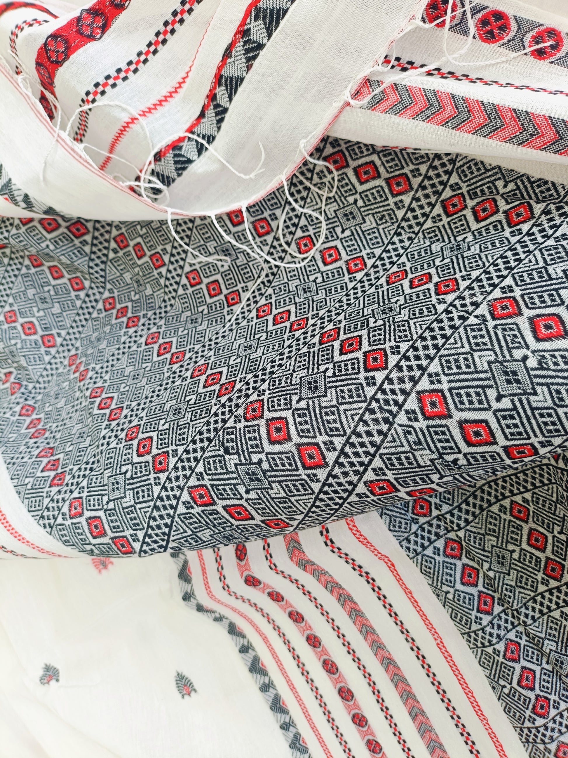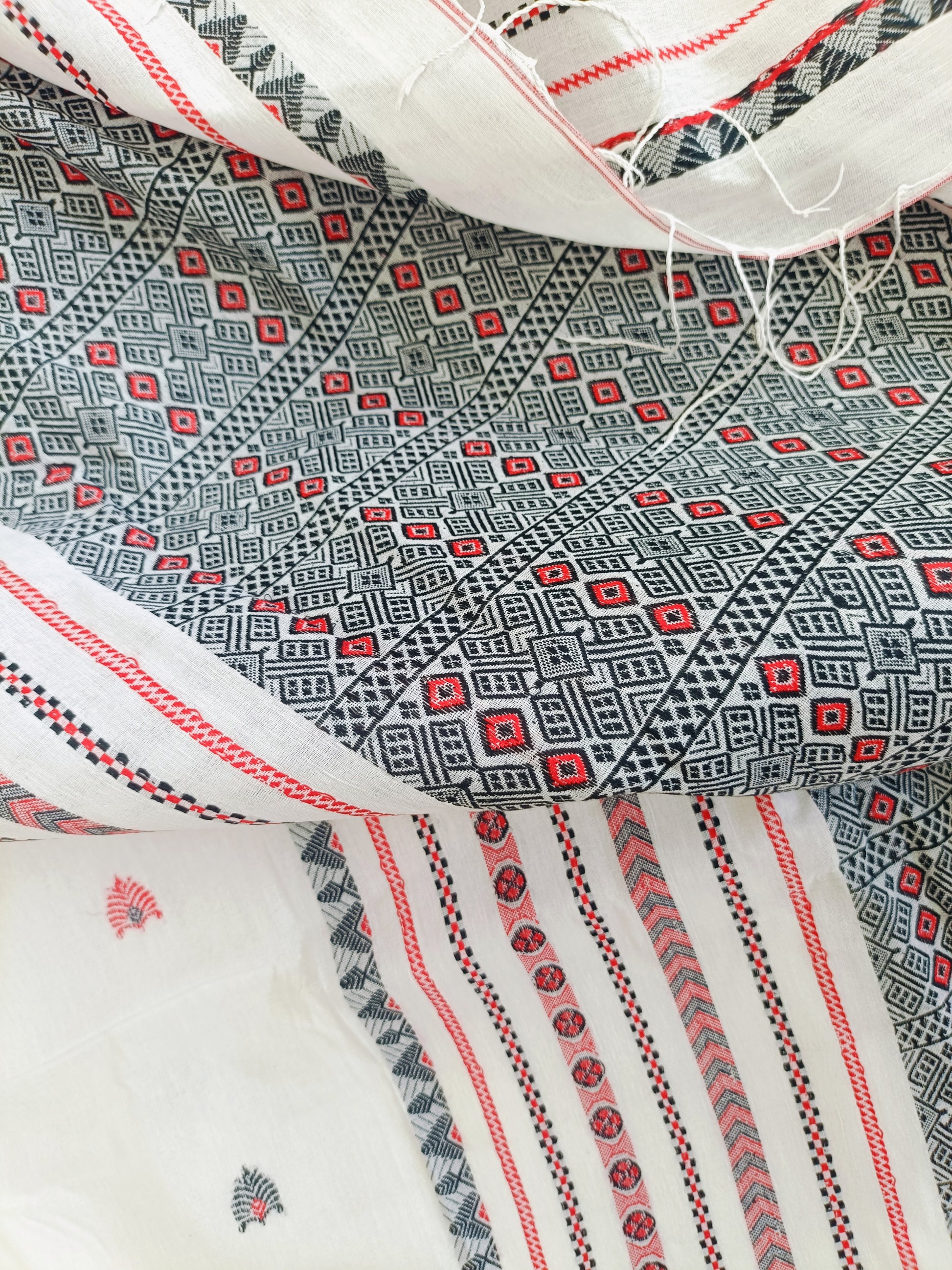 “Woven by hand, these Bengal cottons breathe the rhythm of tradition. Draped in soft hues and rich colors, they whisper elegance for every festive moment. Blouse running."