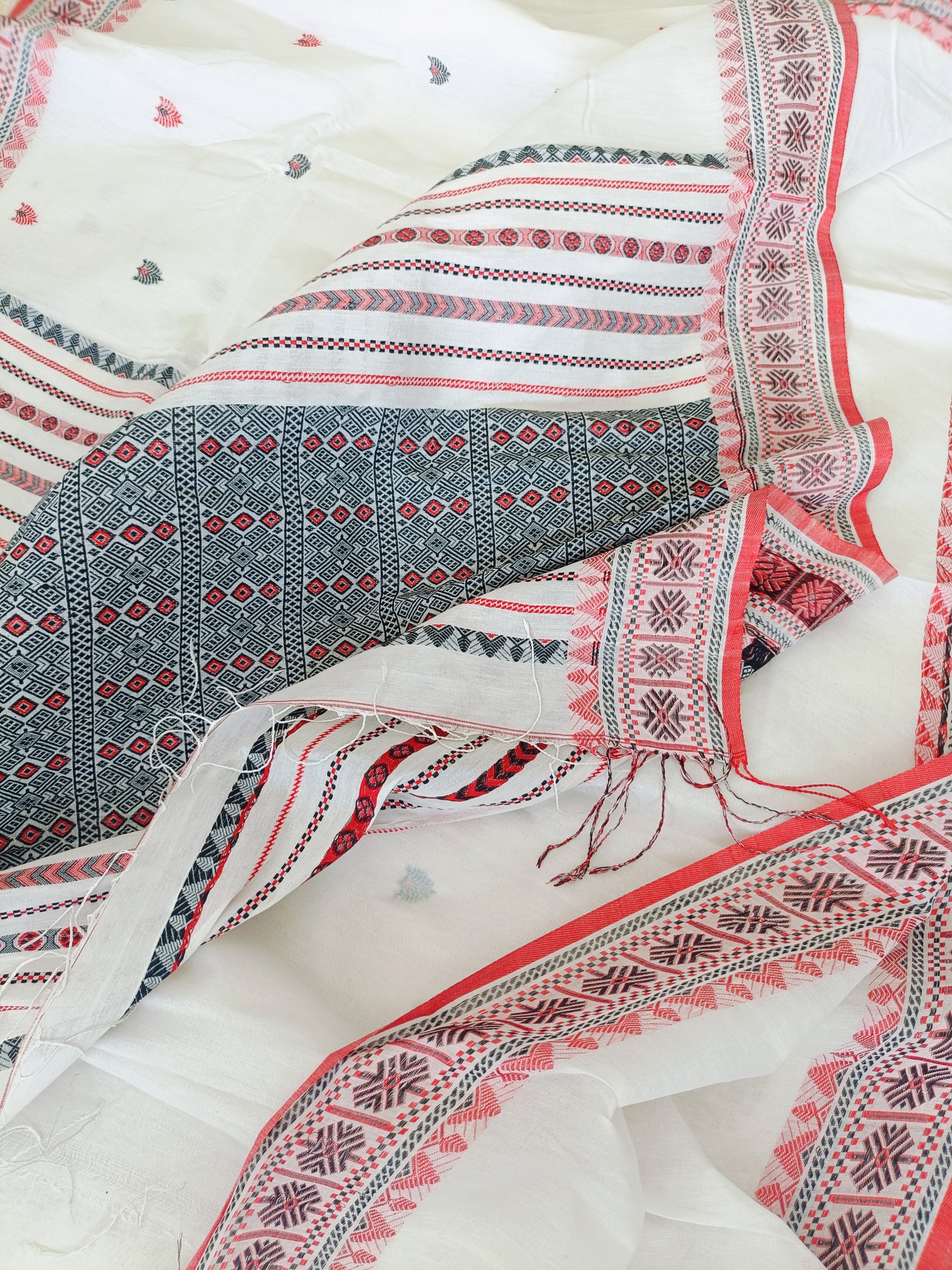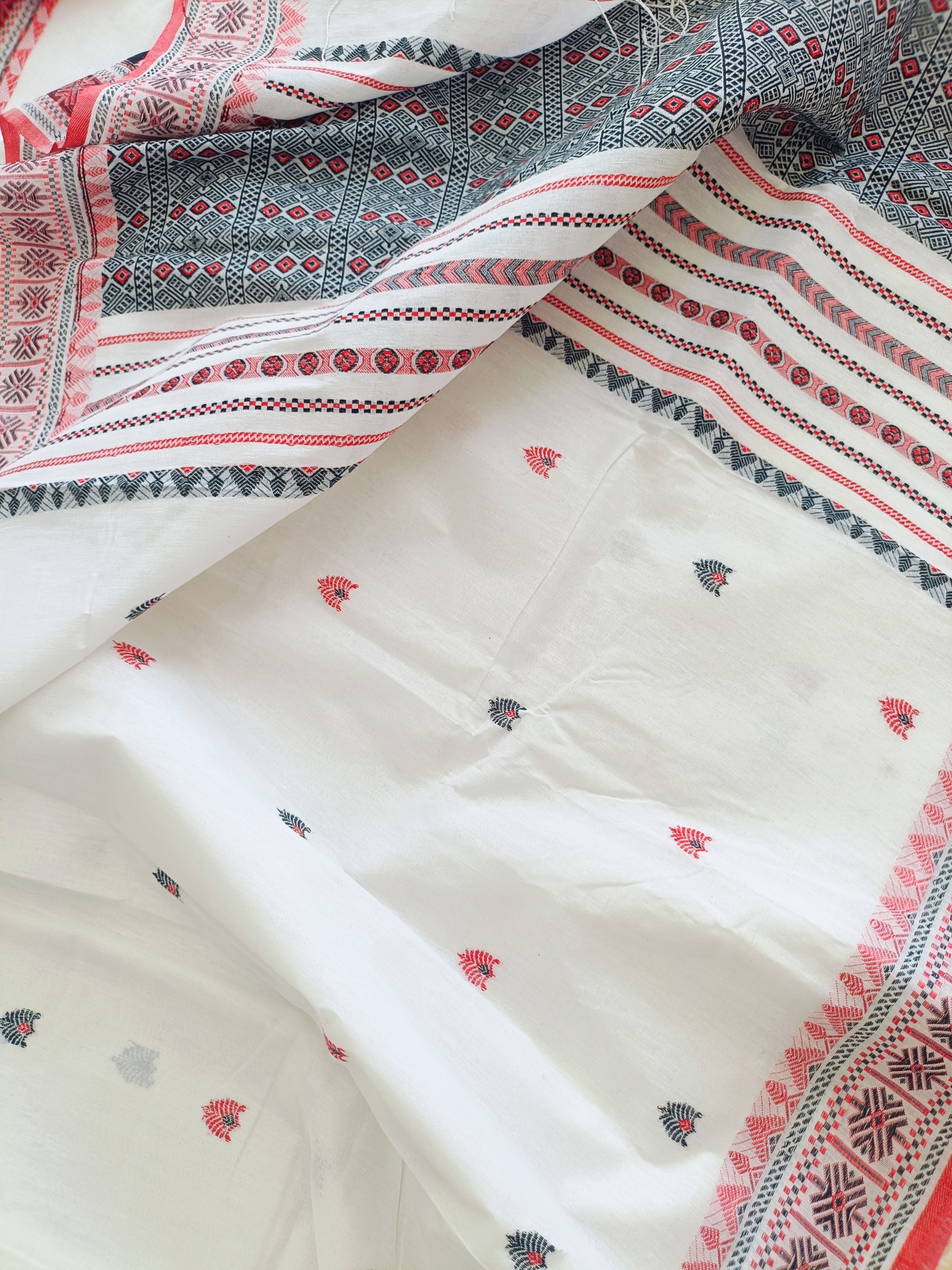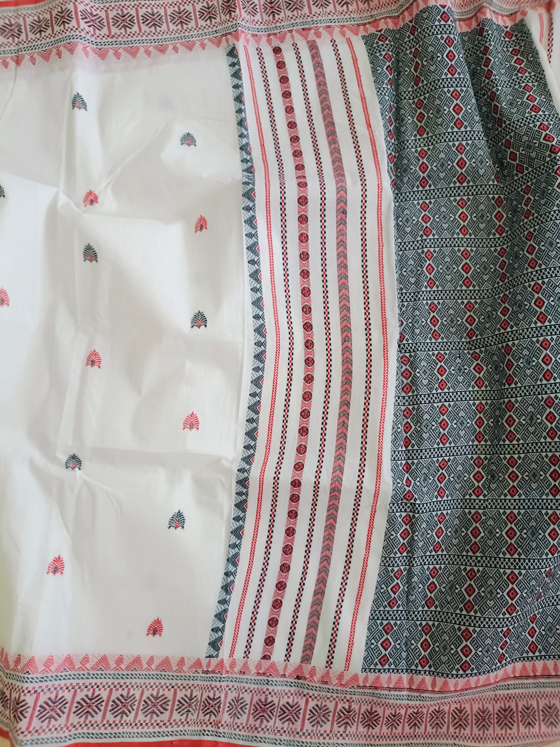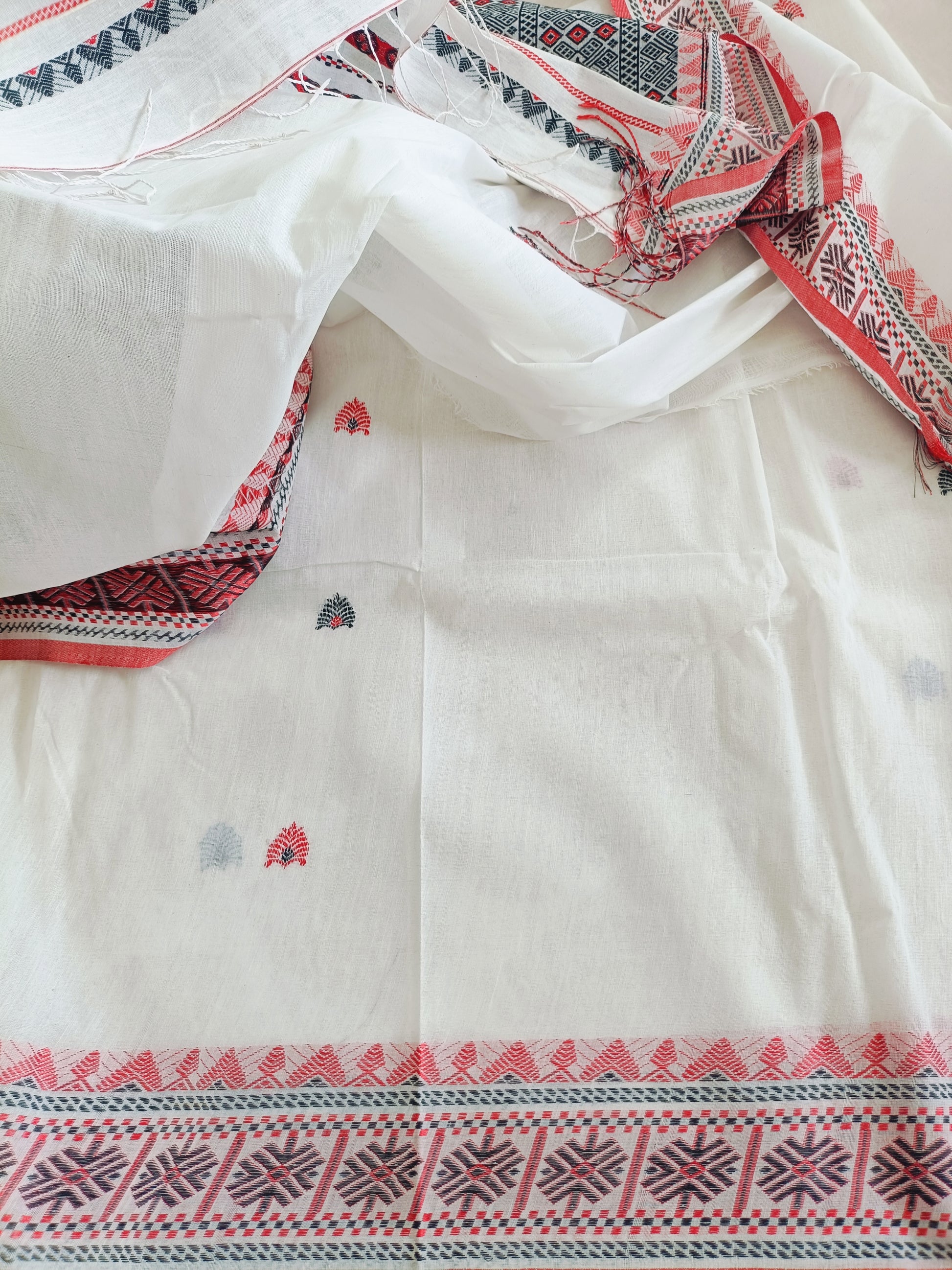 “Woven by hand, these Bengal cottons breathe the rhythm of tradition. Draped in soft hues and rich colors, they whisper elegance for every festive moment. Blouse running."