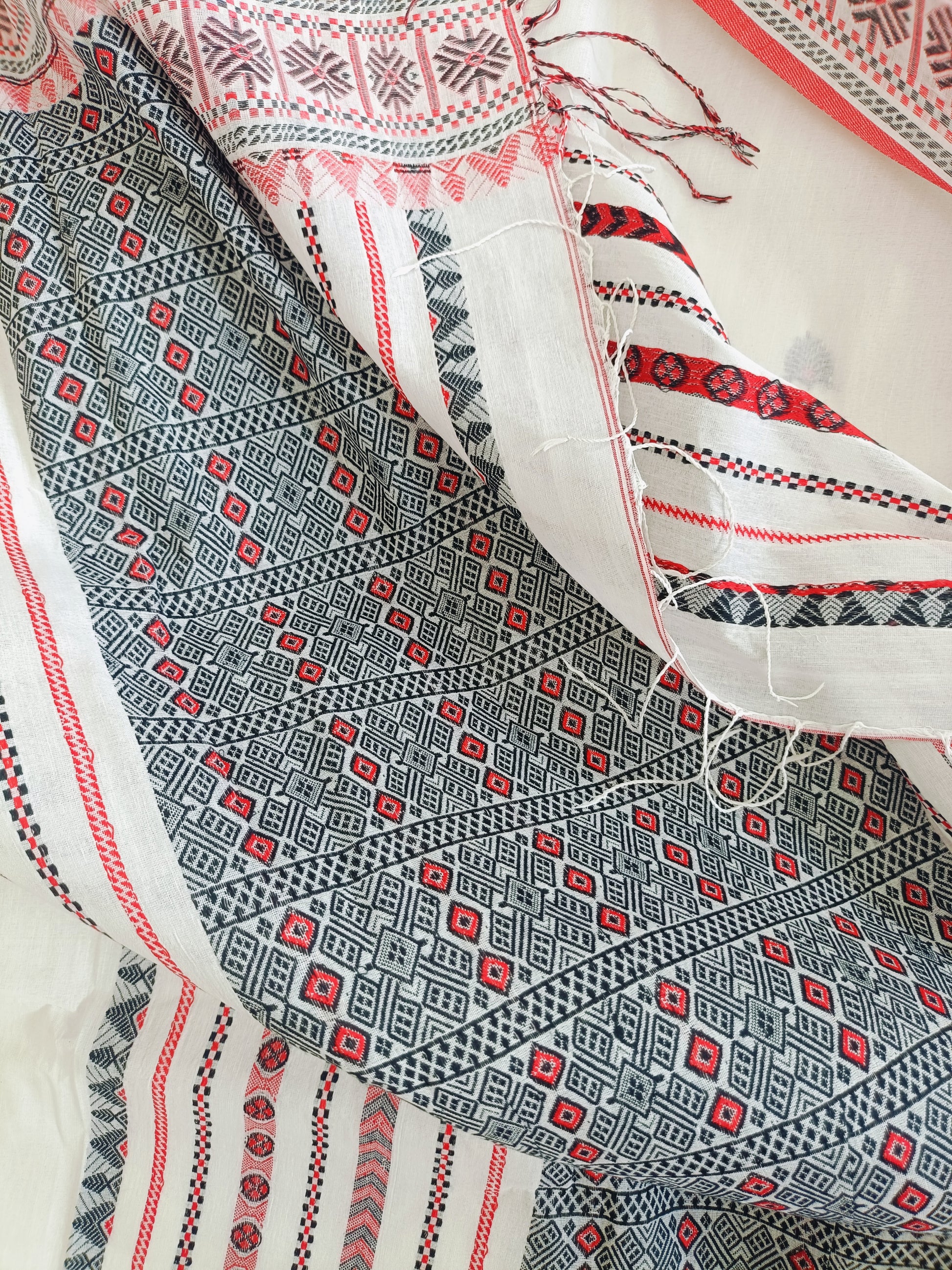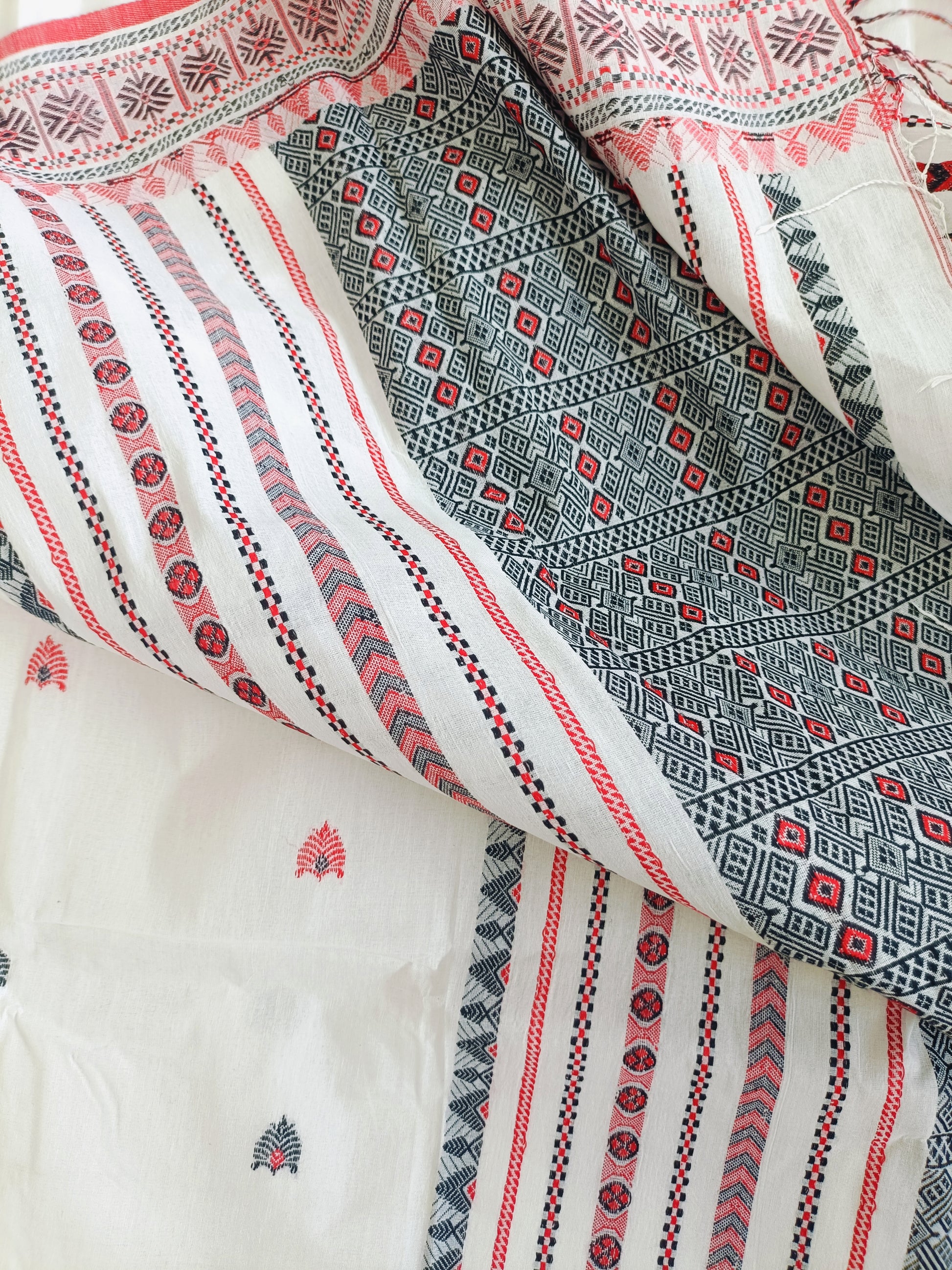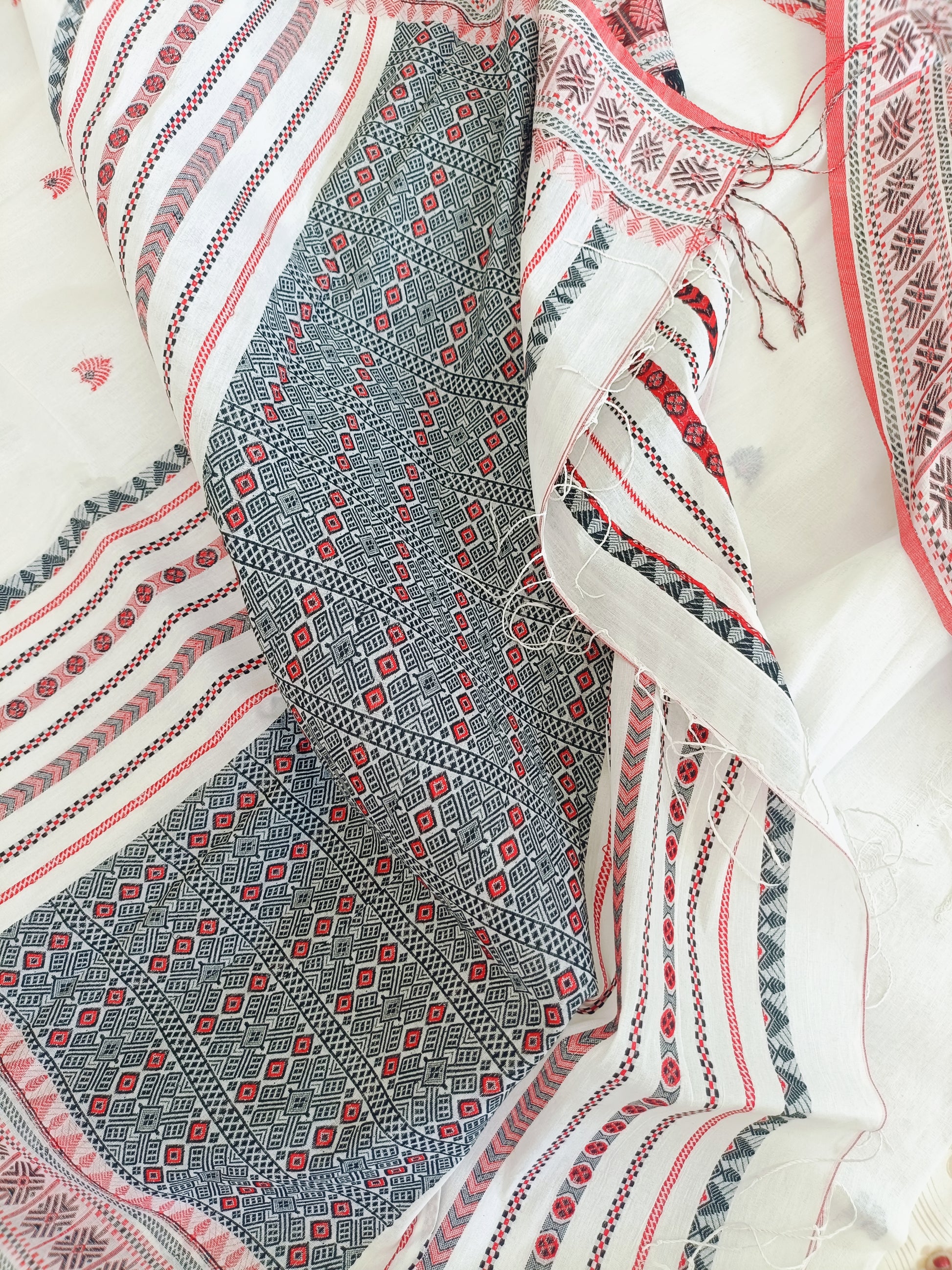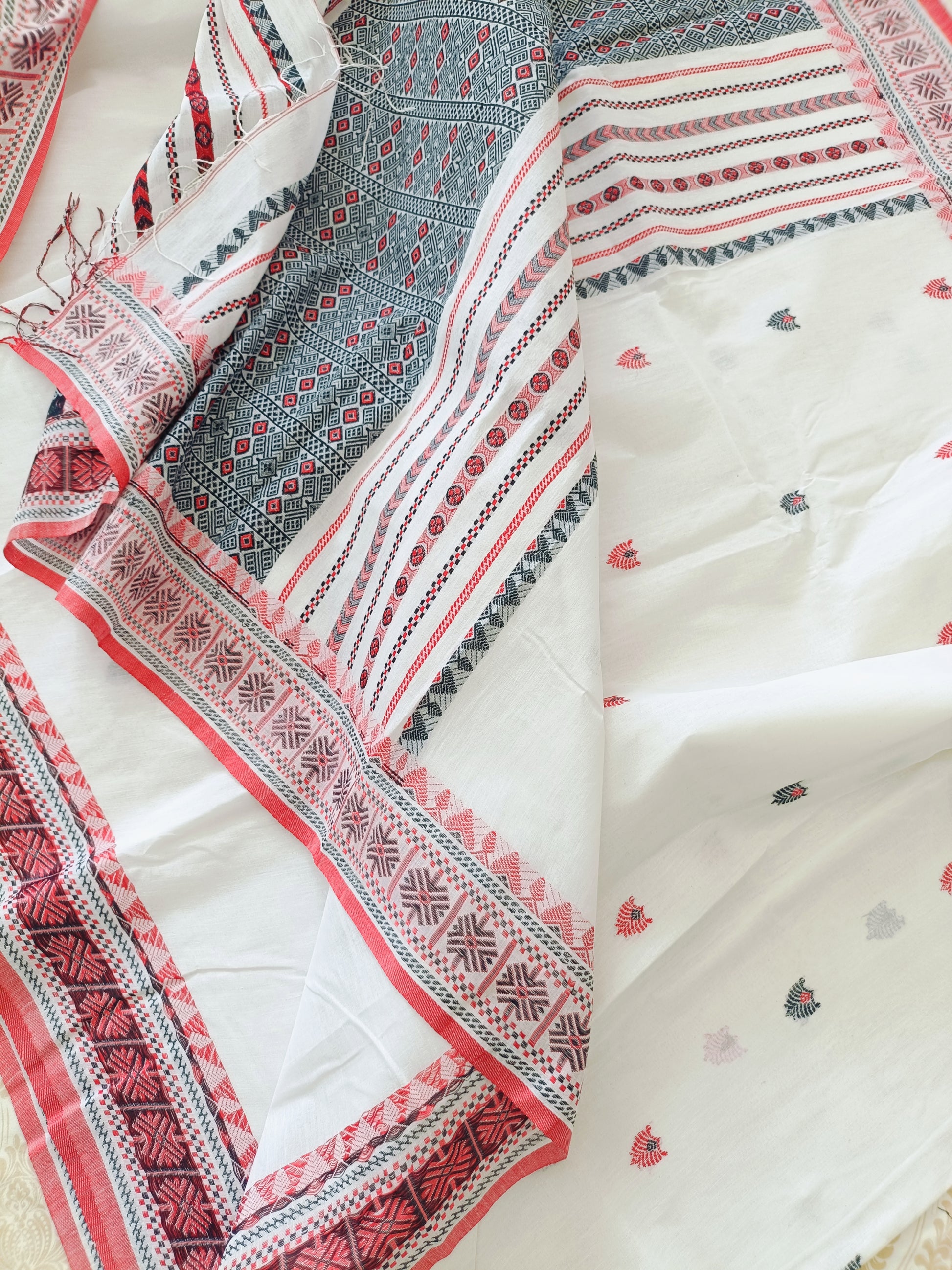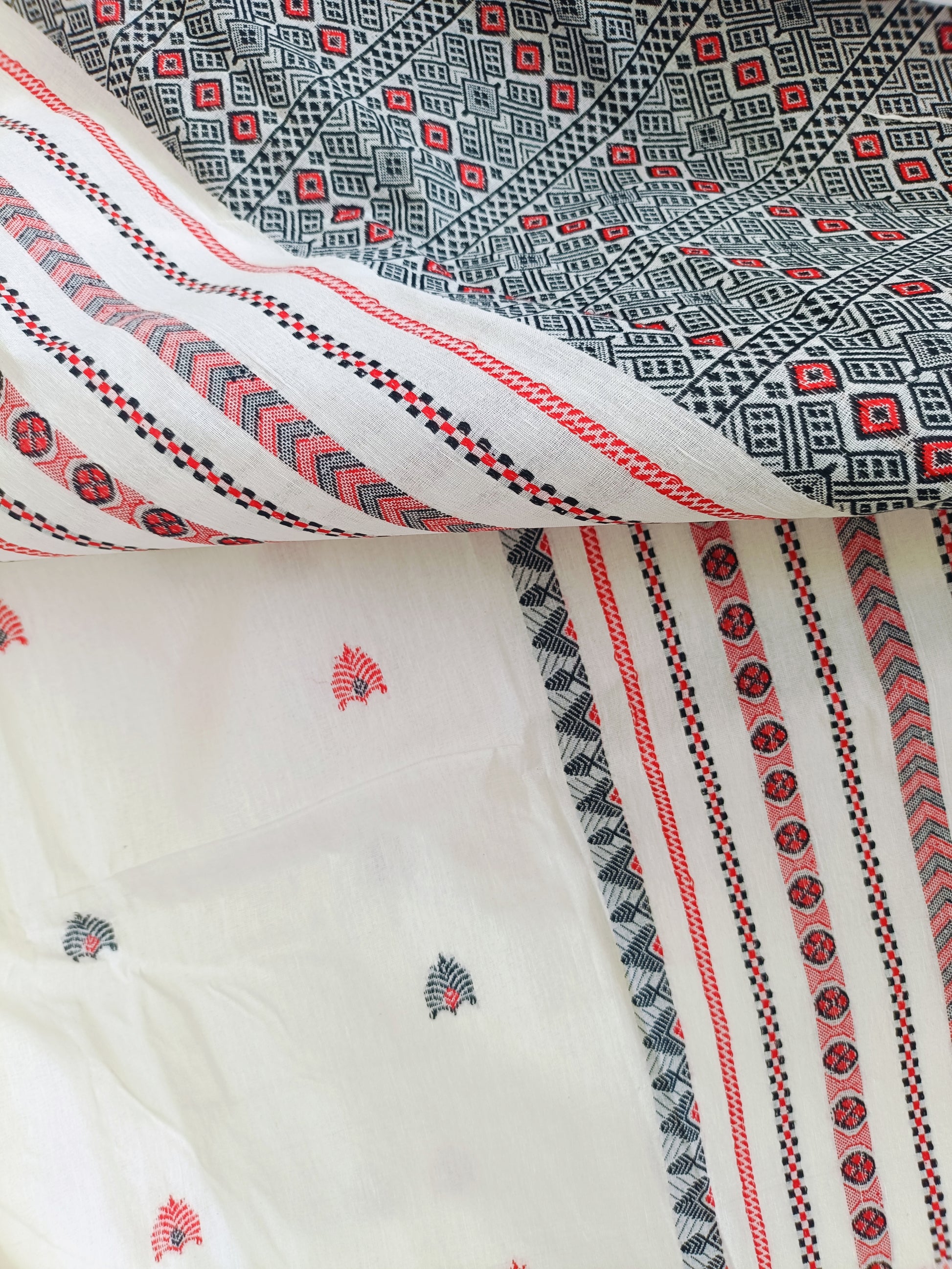 “Woven by hand, these Bengal cottons breathe the rhythm of tradition. Draped in soft hues and rich colors, they whisper elegance for every festive moment. Blouse running."