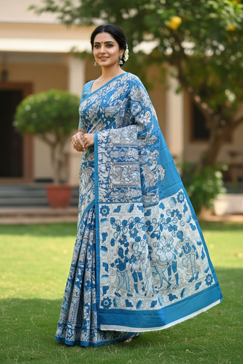 This Pure Bangalore Silk saree comes in a serene Krishna blue shade, adorned with exquisite beige Kalamkari artwork and finished with a traditional zari border. The design highlights graceful depictions of Krishna Leela with Gopiyan, illustrated in classic Kalamkari detailing. Intricate motifs of Krishna playing the flute, surrounded by the gopis, blend beautifully with complementary floral and ornamental patterns across the body of the saree.