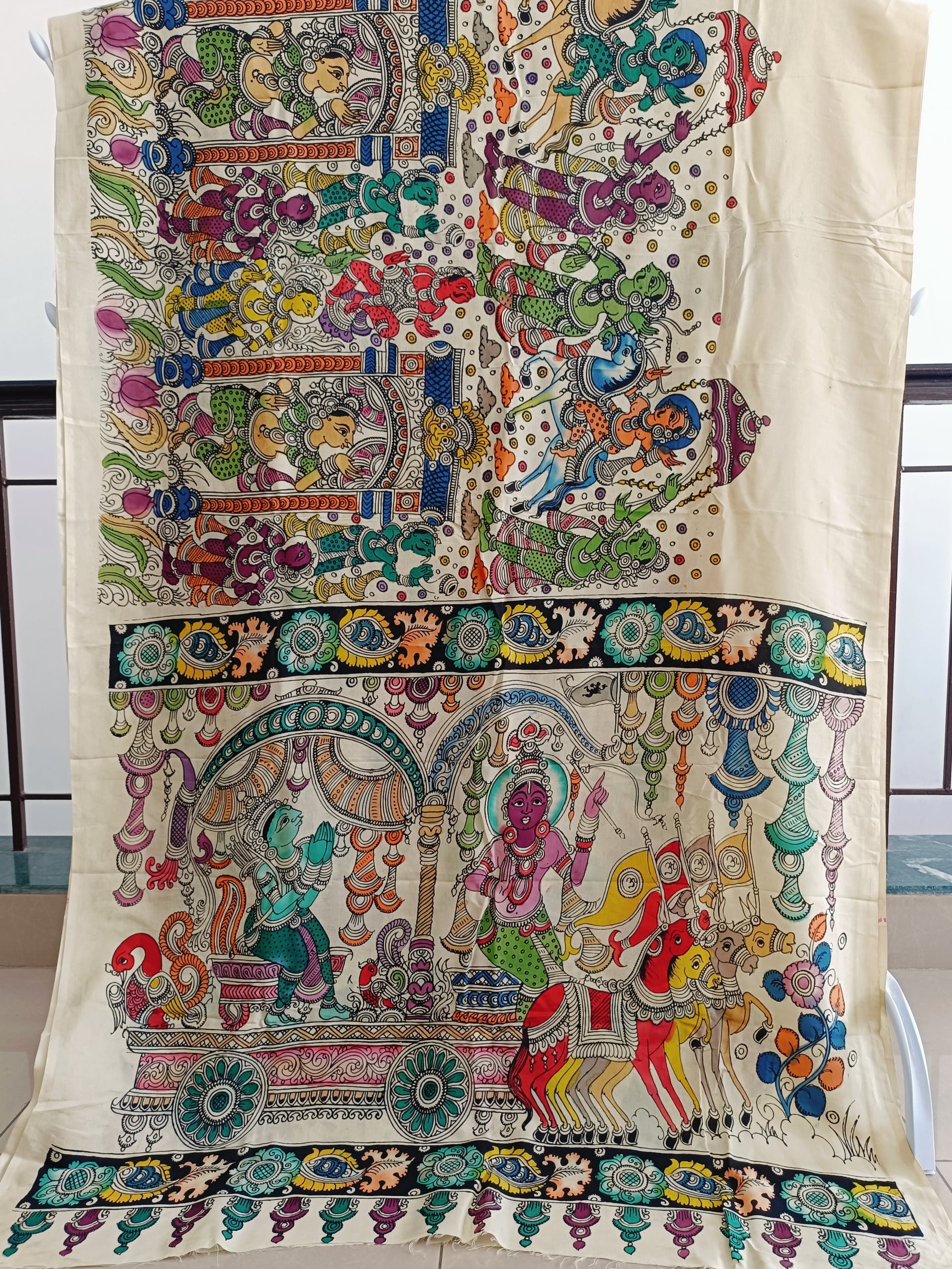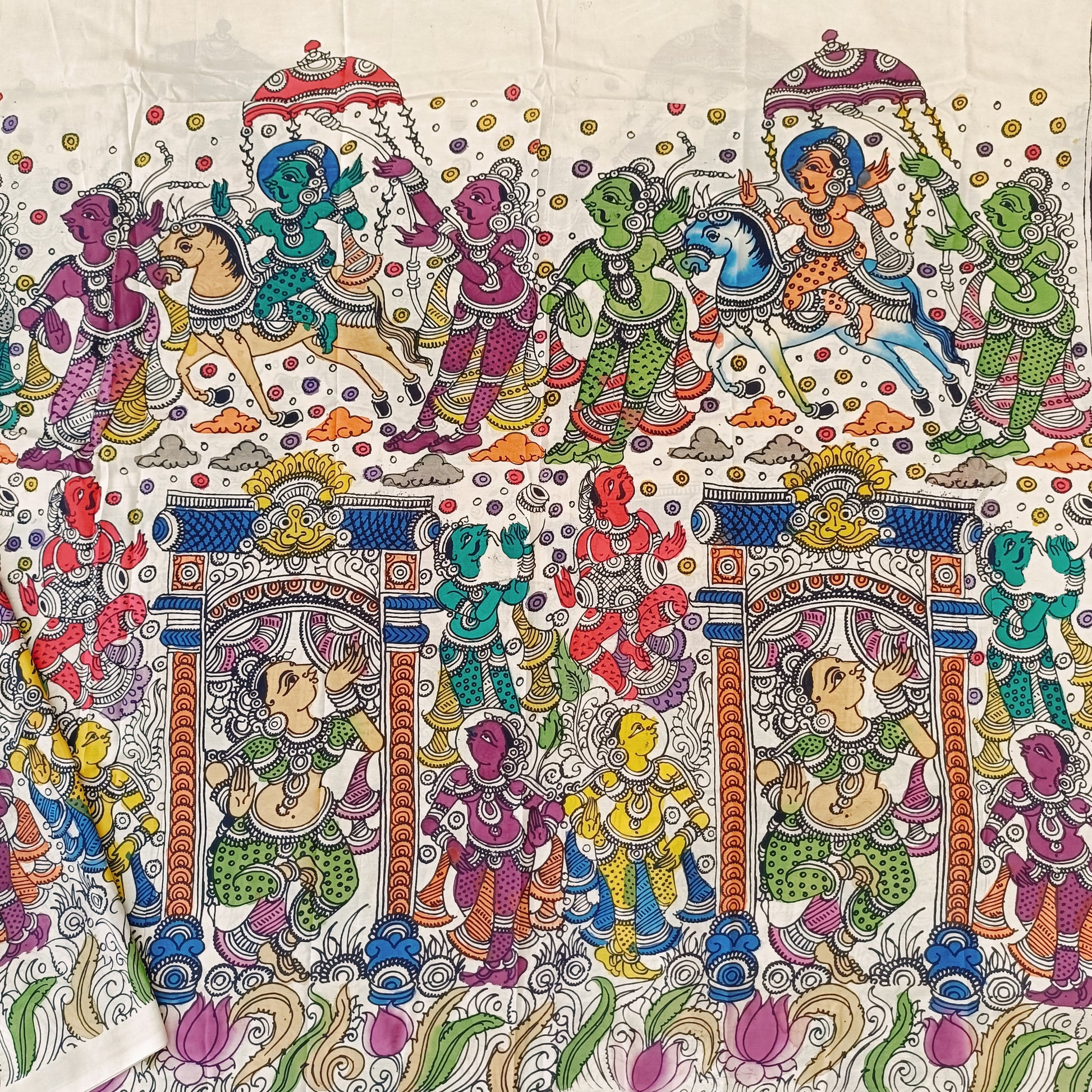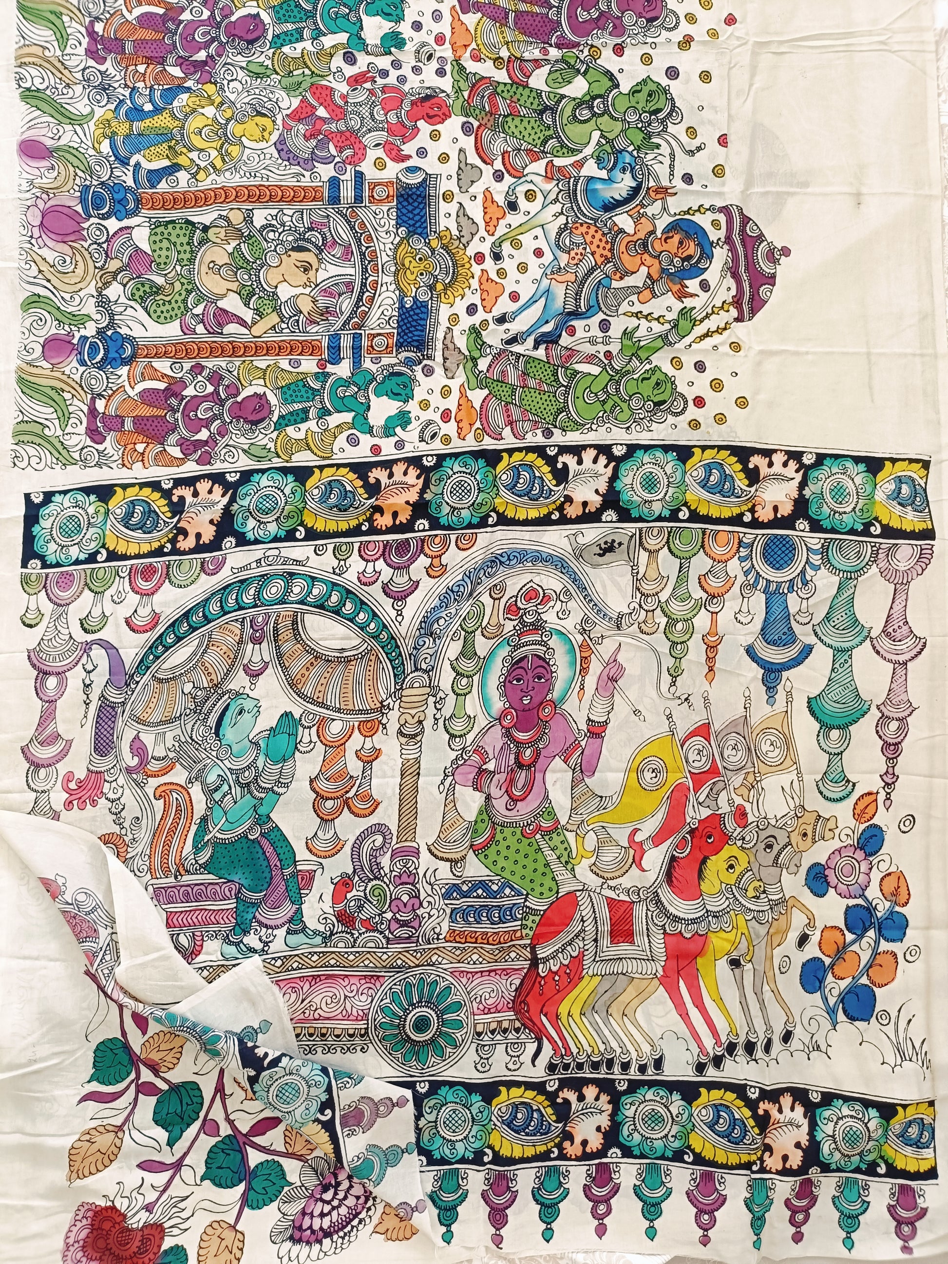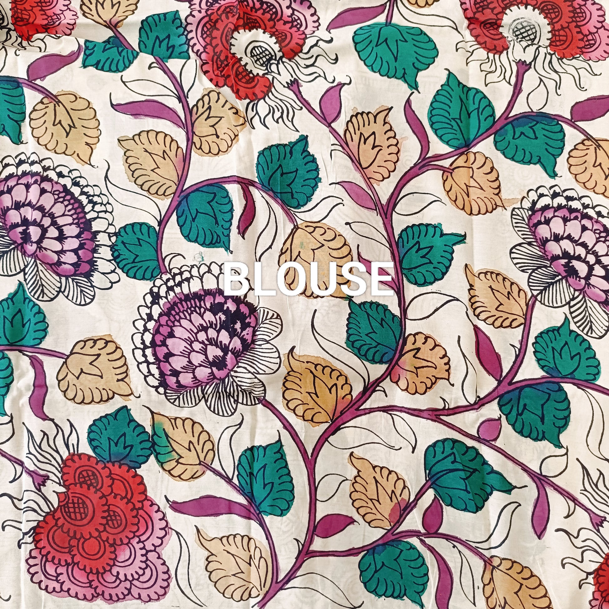 🧵 Fabric: Pure Bangalore Silk | 🎨 Work: Hand-painted Kalamkari | 📏 Saree Length: 6.5 m | 👚 Blouse: Up to 1 m | 📐 Width: 46"
