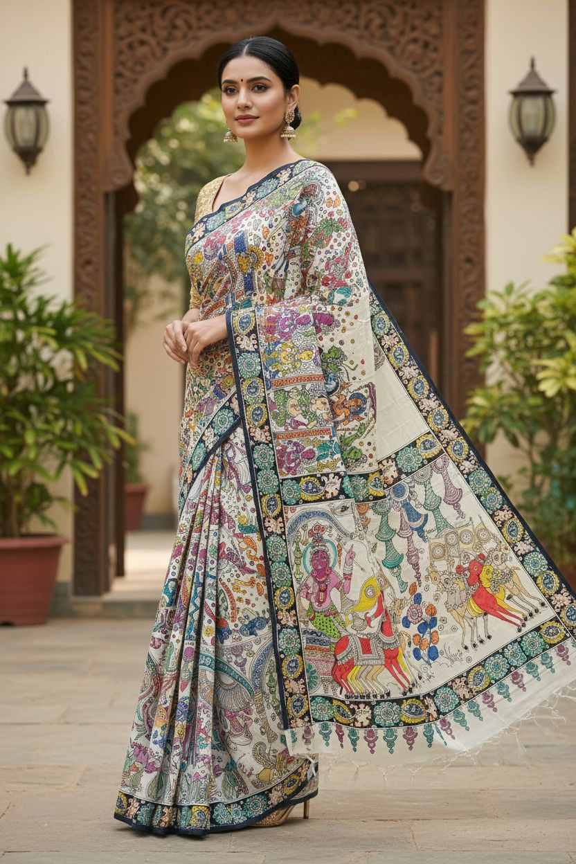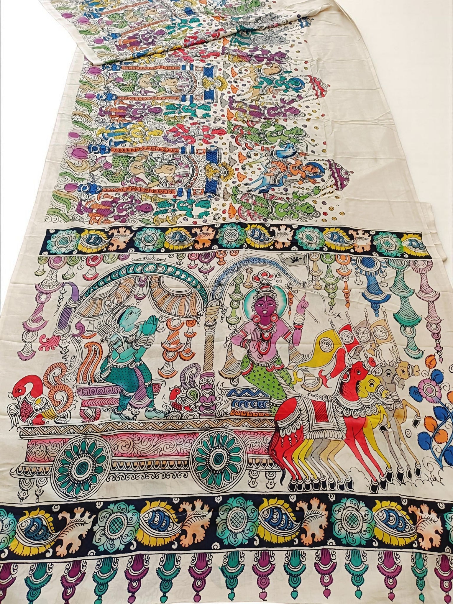 This Pure Bangalore Silk saree features a powerful and timeless Kalamkari depiction of Krishna and Arjun on the battlefield of Kurukshetra, illustrating the revered moment when Krishna imparts the Bhagavad Gita. Rendered in classic beige Kalamkari detailing against the rich silk base, the artwork captures Krishna as the divine charioteer, guiding Arjun amidst the stillness before the war.