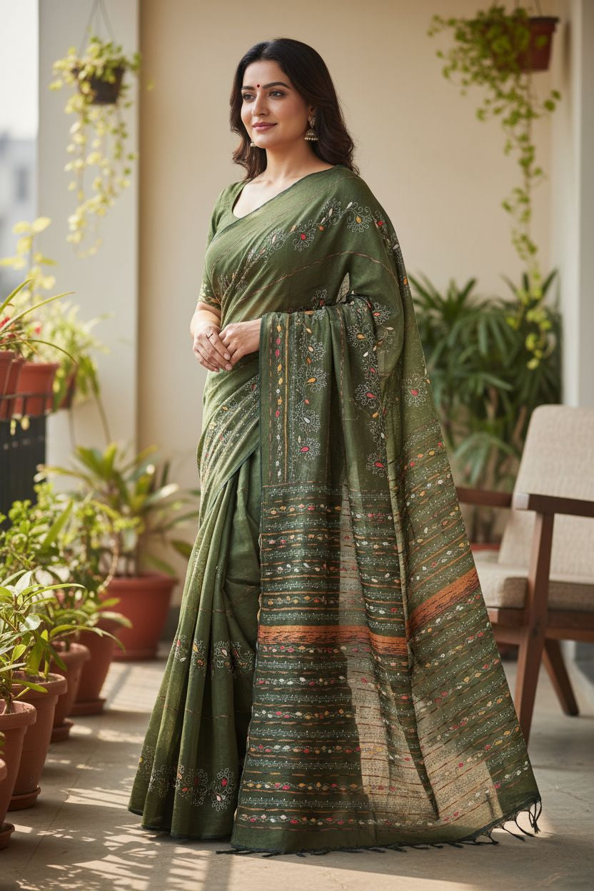 Pure Handmade Khesh Cotton Saree with Kantha Stitch