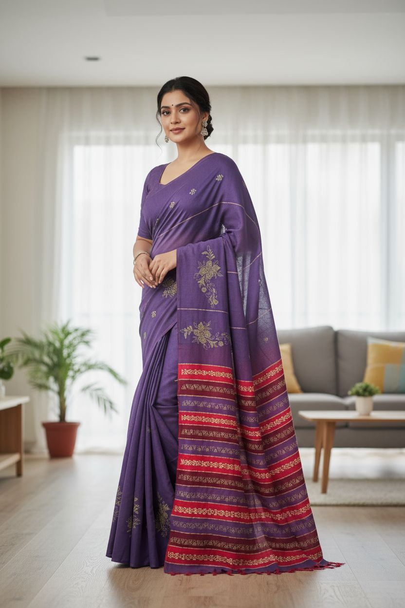Experience the craftsmanship of West Bengal with this handcrafted Khesh Cotton Saree, detailed with intricate Kantha Stitch embroidery. Made using the traditional Khesh weaving technique from Birbhum, the fabric incorporates recycled cotton sari strips, resulting in a uniquely textured, soft, and breathable drape.
