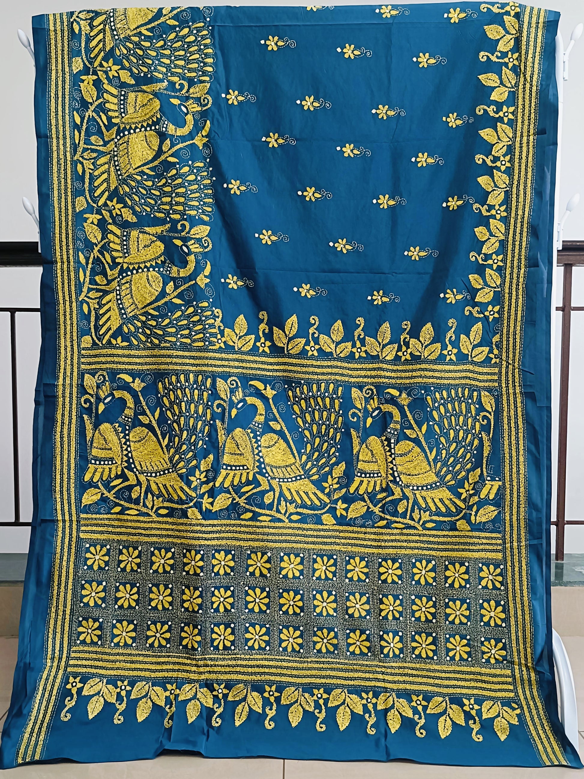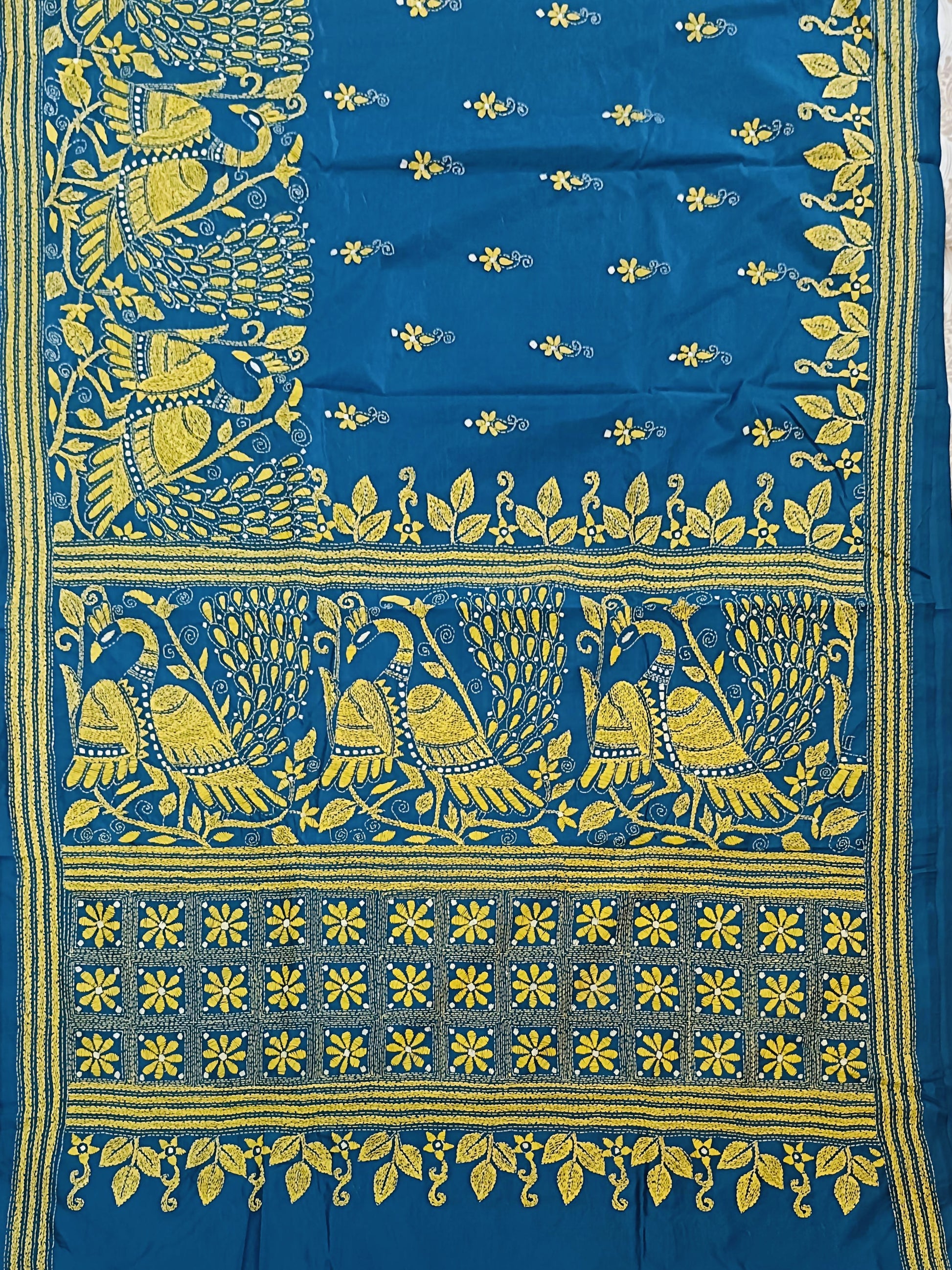 A beautifully handcrafted saree in premium blended Bangalore silk, featuring intricate all-over Kantha stitch embroidery. The bottle green drape showcases elegant deer motifs on the pallu and floral vines along the borders, reflecting fine artisanal detail and a rich, traditional appeal. Soft, graceful, and refined, this saree offers a comfortable modern drape perfect for special occasions.