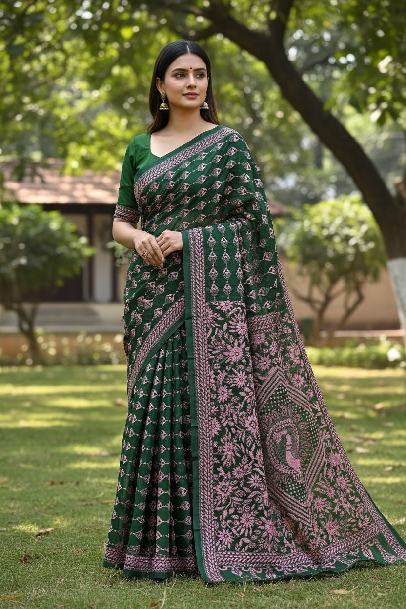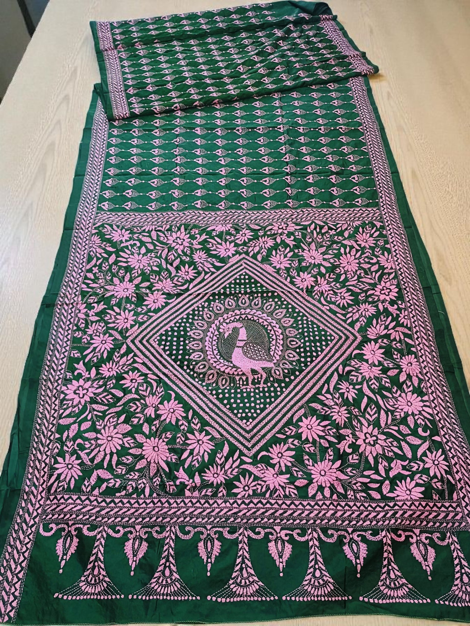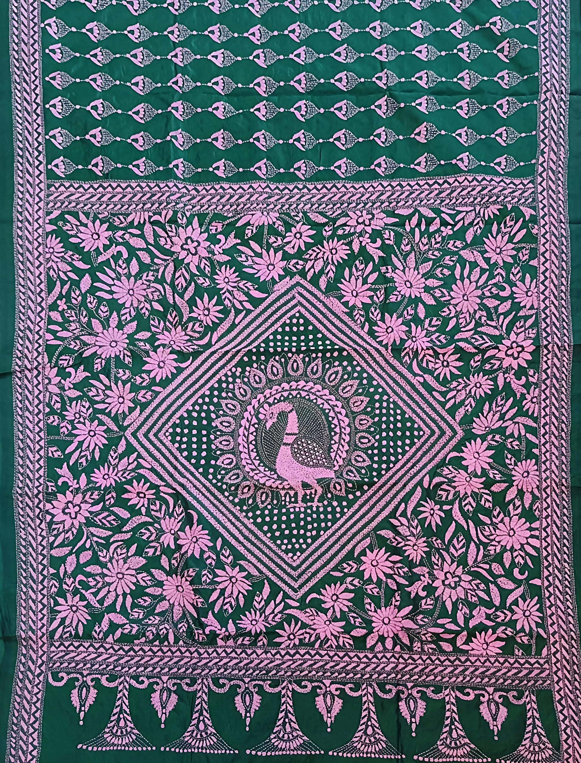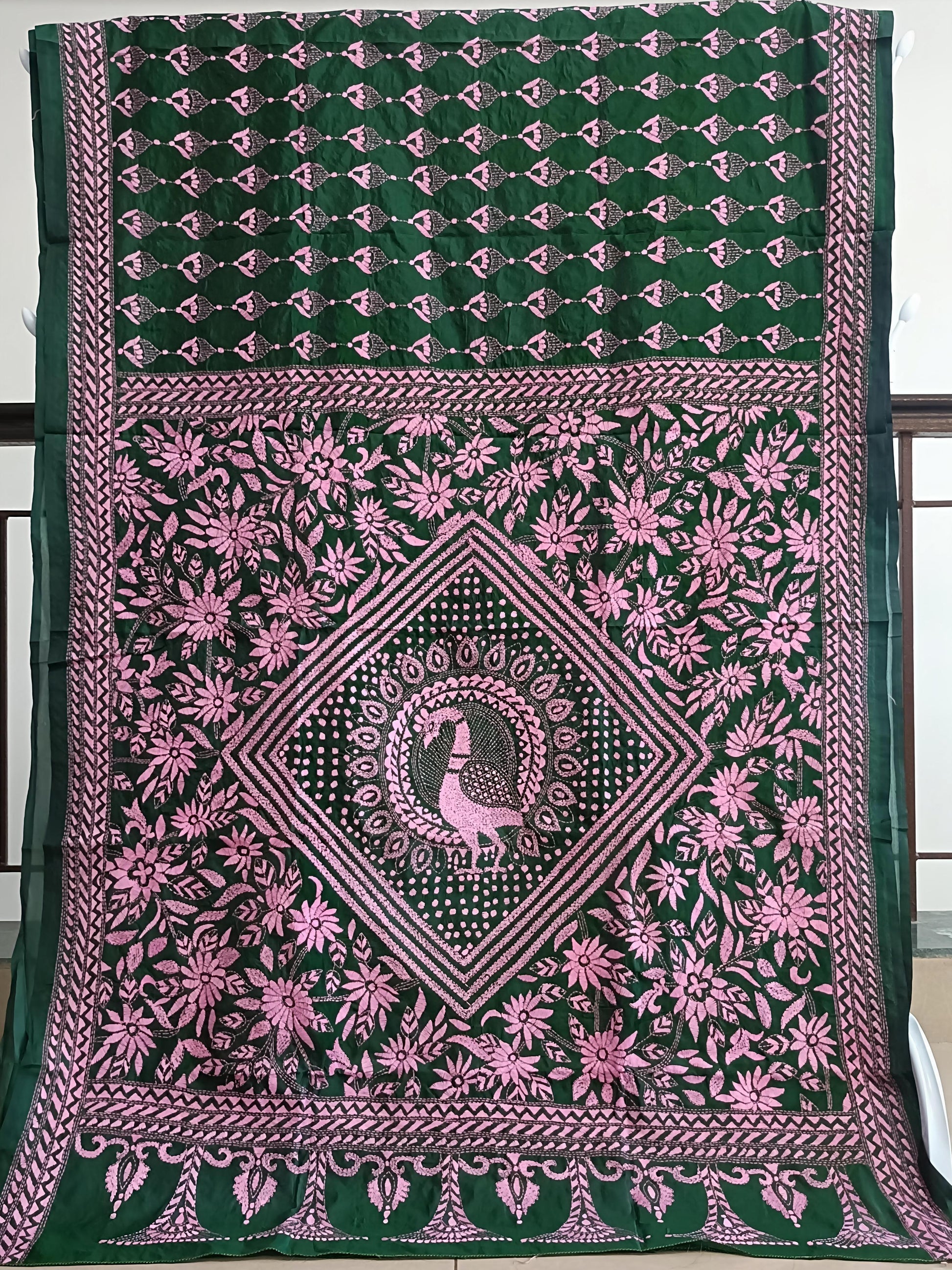 A beautifully handcrafted saree in premium blended Bangalore silk, featuring intricate all-over Kantha stitch embroidery. The bottle green drape showcases elegant deer motifs on the pallu and floral vines along the borders, reflecting fine artisanal detail and a rich, traditional appeal. Soft, graceful, and refined, this saree offers a comfortable modern drape perfect for special occasions.